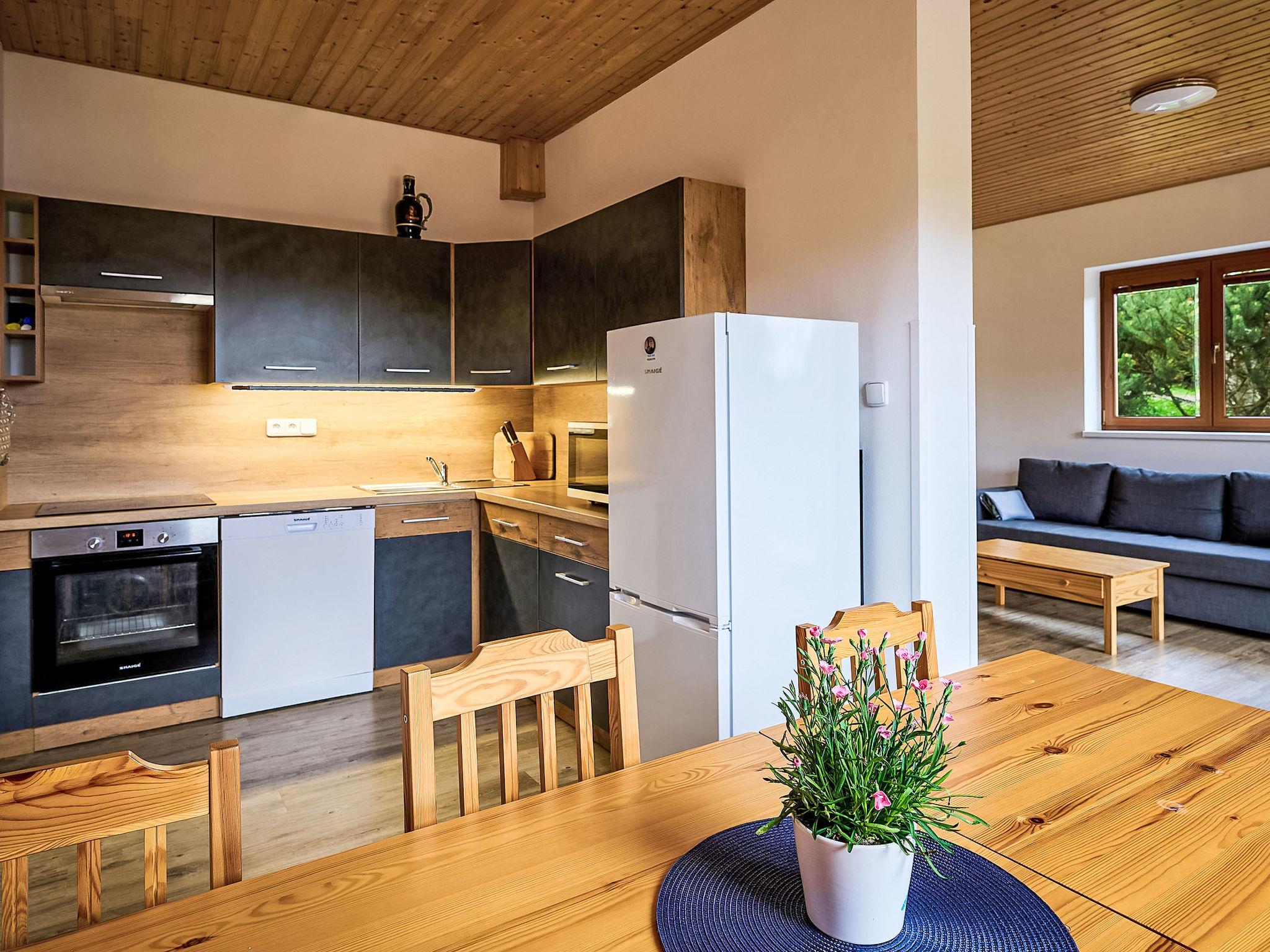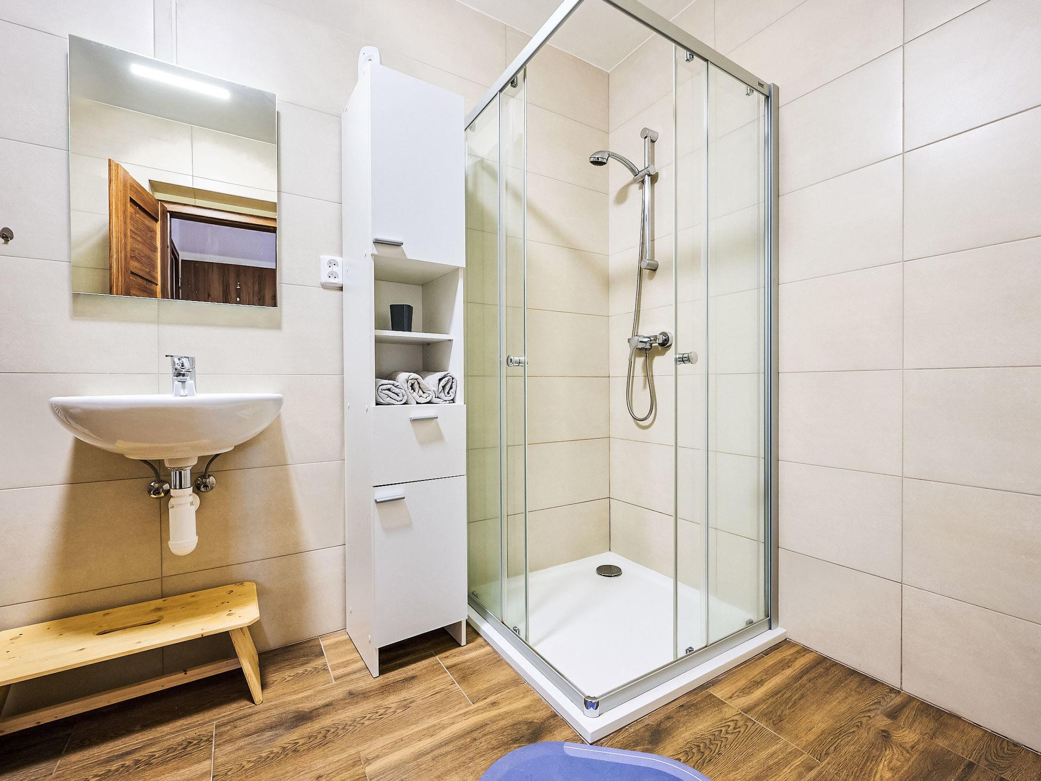 4-room apartment on the ground floor. Modern furnishings: open living room with panoramic window with 1 sofabed and TV. Exit to the terrace. 1 room with 2 beds and 1 x 1 bunk beds. Open living room with 1 sofabed, dining table and TV. Exit to the terrace. 1 room with 3 beds and 1 double bed. Kitchenette (oven, dishwasher, 4 ceramic glass hob hotplates, kettle, microwave, freezer, electric coffee machine) with dining table. 2 showers/WC. Floor heating. Terrace furniture, barbecue. Facilities: washing machine. Internet (WiFi). Please note: suitable for families. Non-smokers only. The house is divided into 2 apartments with a common entrance.
