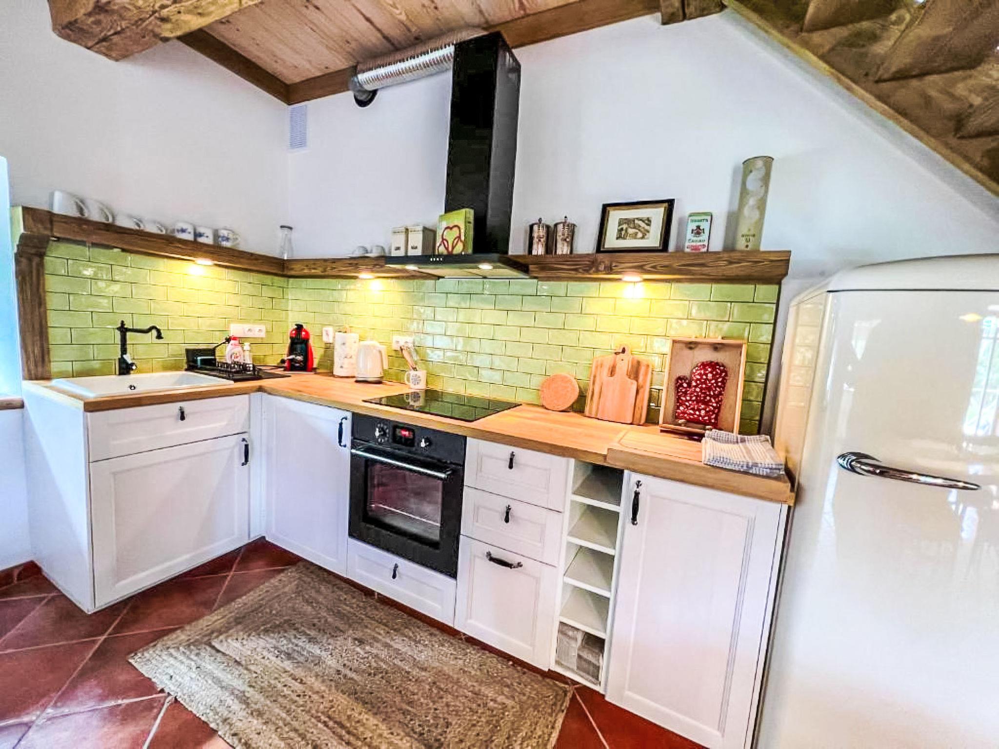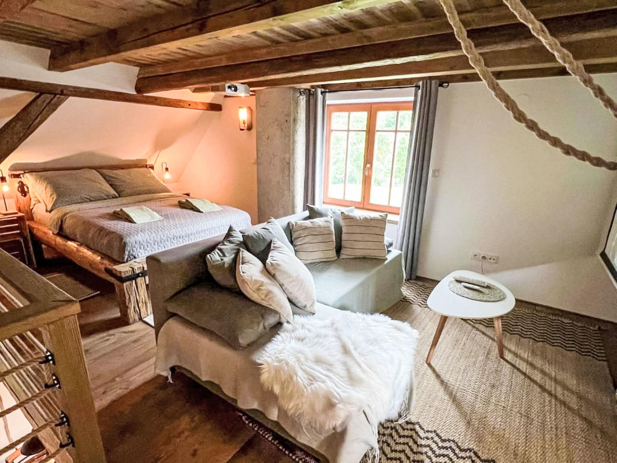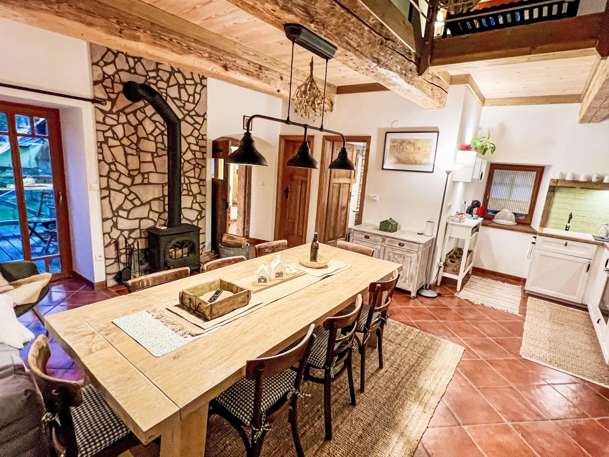 3-room cottage 65 m2. Object suitable for 2 adults + 3 children. Rustic and cosy furnishings: open living/dining room with Scandinavian wood stove, dining table, TV and DVD. Exit to the terrace. Kitchenette (oven, dishwasher, 4 ceramic glass hob hotplates, toaster, kettle, microwave, electric coffee machine). Shower, sep. WC. Heating. Upper floor: open gallery with 1 sofabed (length 180 cm), 1 double bed and Home cinema. 2nd upper floor: 1 small children's room with sloping ceilings with 2 beds (80 cm, length 180 cm). View of the mountains and the garden. Facilities: hair dryer. Internet (WiFi, free). Please note: suitable for families. Non-smokers only. Maximum 1 small pet/ dog allowed. Instead of an enclosed bedroom, some sleeping areas are located in an open-plan area (gallery, alcove, etc.).