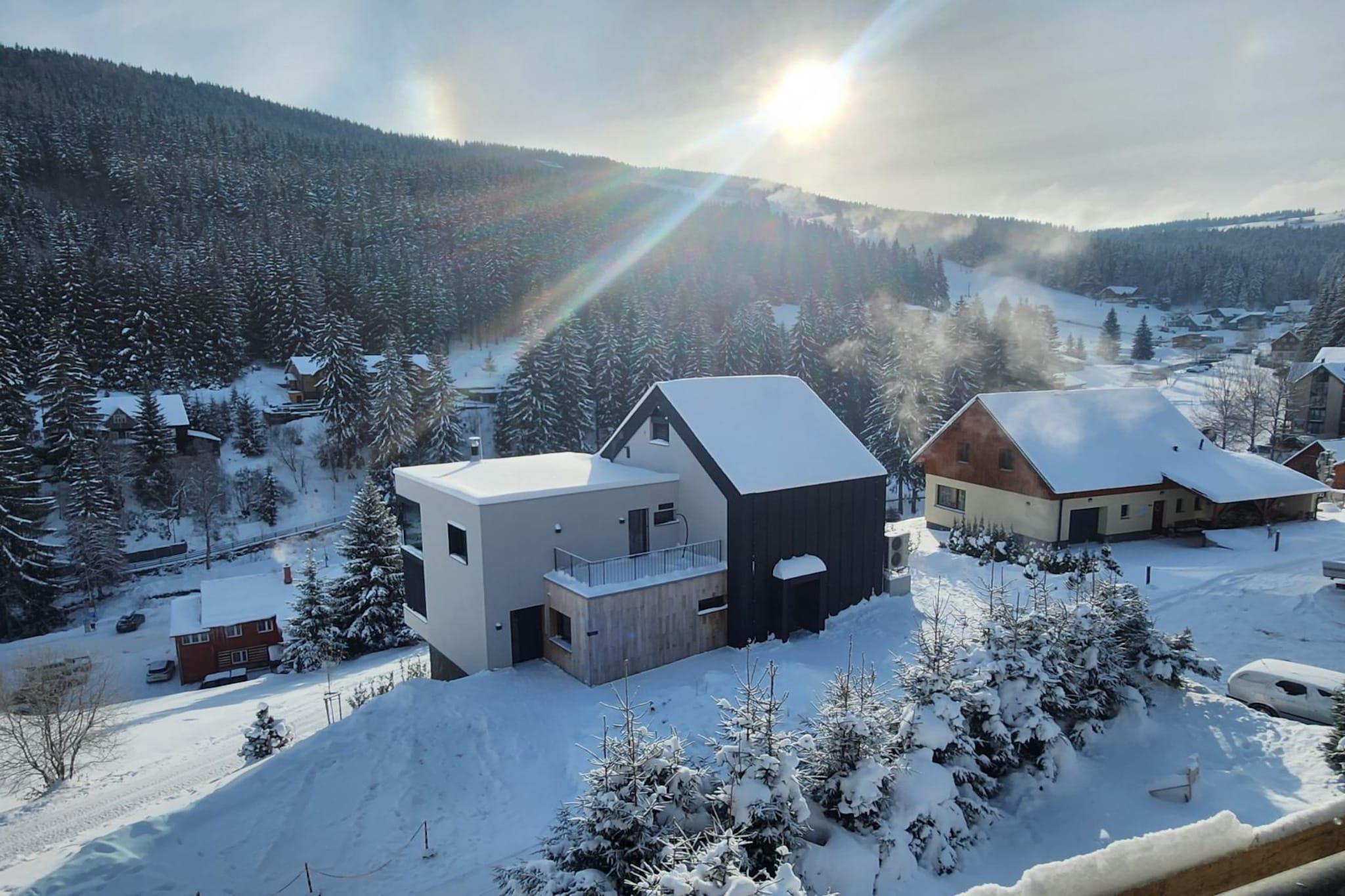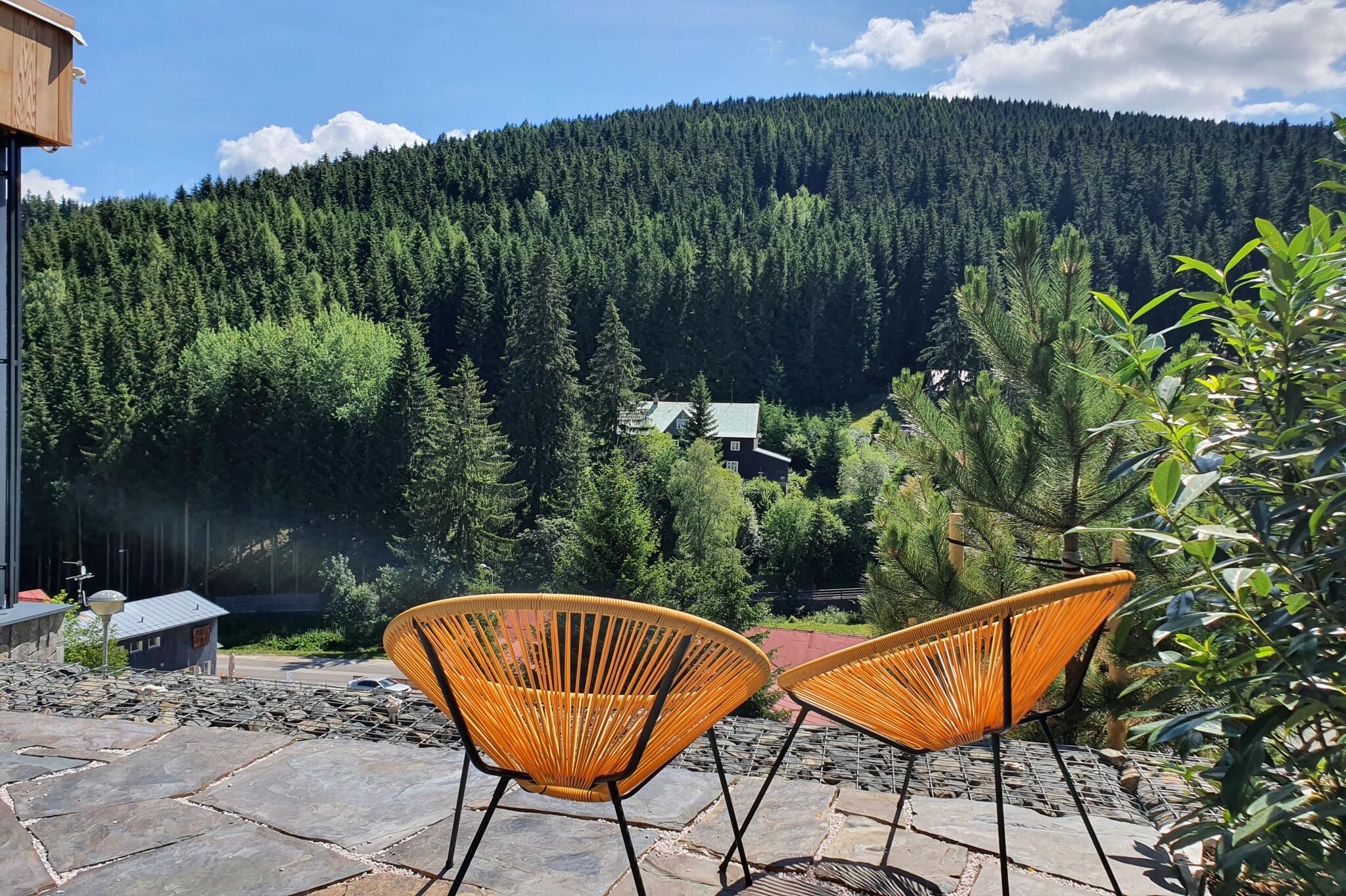 Oplev den perfekte blanding af natur og komfort i denne luksuslejlighed i Krkonoše-bjergene. Forestil dig at starte din dag med en kop kaffe på terrassen og se ud på de majestætiske bjergtoppe. Uanset om du er ivrig efter at vandre de nærliggende stier eller køre på skiløjperne kun få minutter væk, tilbyder denne beliggenhed uendelige muligheder for eventyr. Efter en dag udendørs kan du slappe af med en drink, mens du ser solen gå ned over bjergene. Denne moderne bygning byder på to smukt indrettede lejligheder, som hver har store vinduer, der indrammer det fantastiske bjerglandskab. Interiøret kombinerer luksuriøse træ- og stenmaterialer, hvilket skaber en hyggelig, men elegant atmosfære. Gratis privat parkering er tilgængelig, hvilket sikrer din bekvemmelighed under hele dit ophold. Lejligheden i stueetagen er perfekt til 3 gæster og omfatter et komfortabelt soveværelse, en stue med en sovesofa og et fuldt udstyret køkken. Det moderne badeværelse og yderligere faciliteter, såsom en barneseng og høj stol efter anmodning, sikrer et behageligt ophold. For skiløbere er der et fælles skiopbevaringsområde. Lejligheden har også en rummelig 25m² terrasse. For større grupper kan du overveje at booke loftslejligheden, som kan rumme op til 5 personer. Placeringen er ideel, med både byens centrum og skiløjperne kun en kort gåtur væk, og tilbyder det bedste fra begge verdener til eventyr og afslapning.