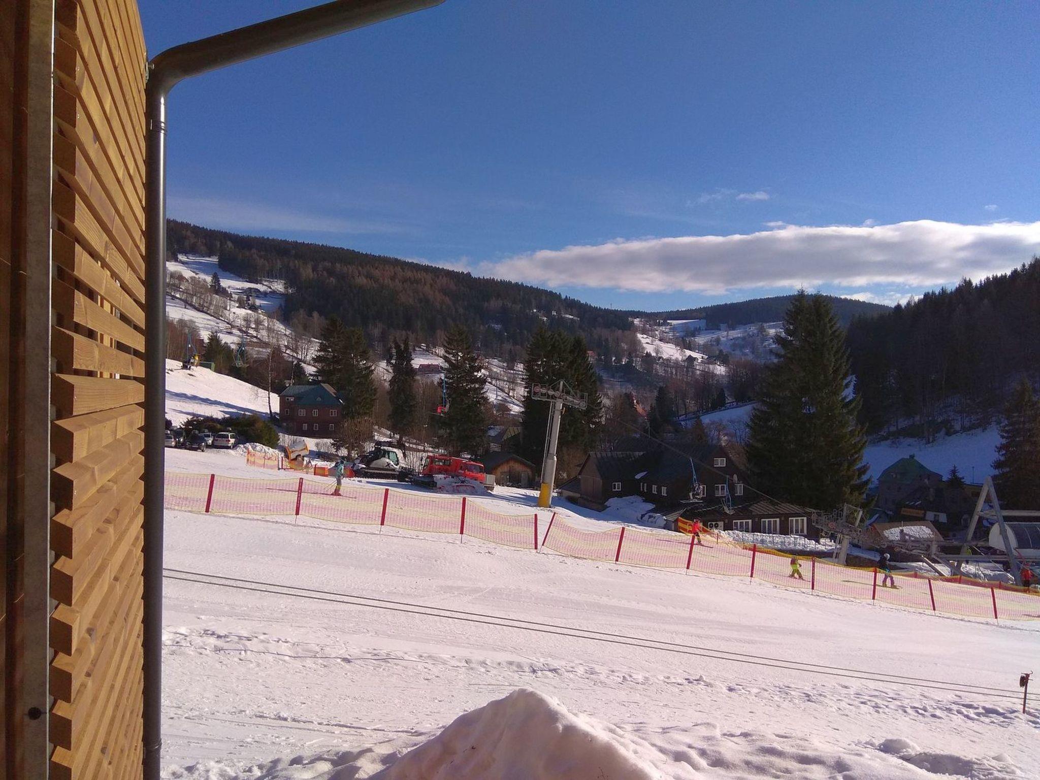 "Ski-In Ski-Out Mountain Duplex Portášky2", 2-room maisonette 65 m2. Bright, modern furnishings: living room with satellite TV. Kitchenette (2 ceramic glass hob hotplates, toaster, kettle, microwave, electric coffee machine) with dining table. Sep. WC. Heating. Upper floor: 1 room with 2 beds and 1 double bed. Shower/WC. Terrace. Terrace furniture. Beautiful view of the countryside. Facilities: hair dryer. Internet (WiFi, free). Please note: suitable for families. Non-smokers only. Maximum 1 small pet/ dog allowed.