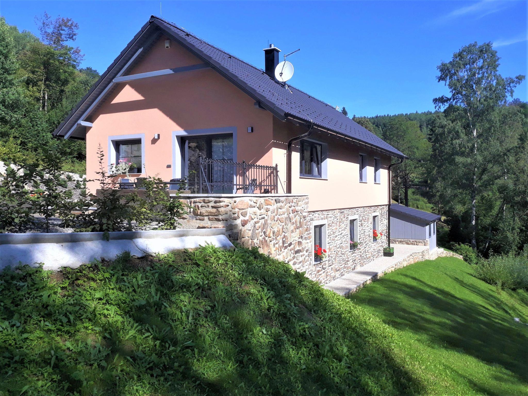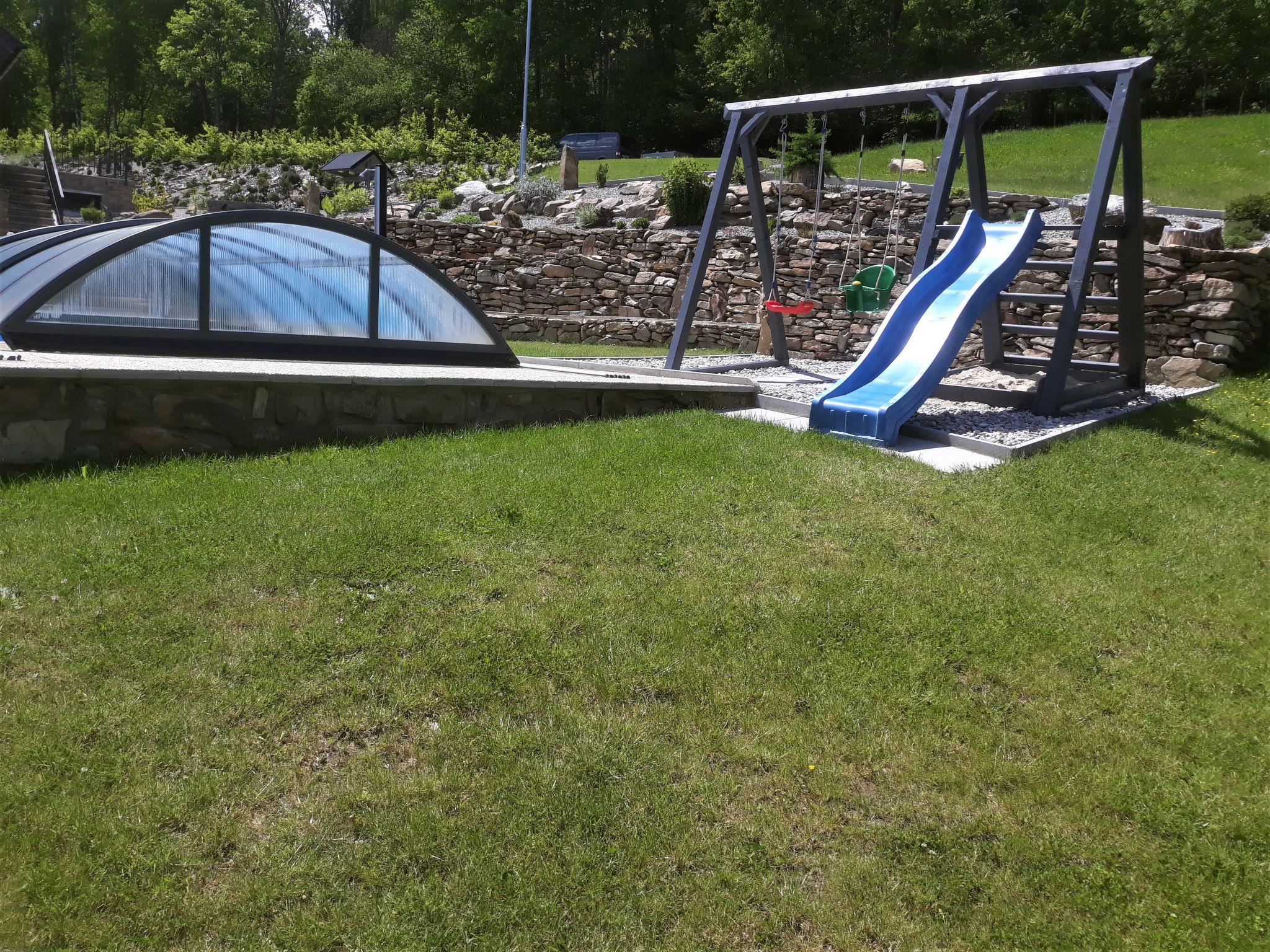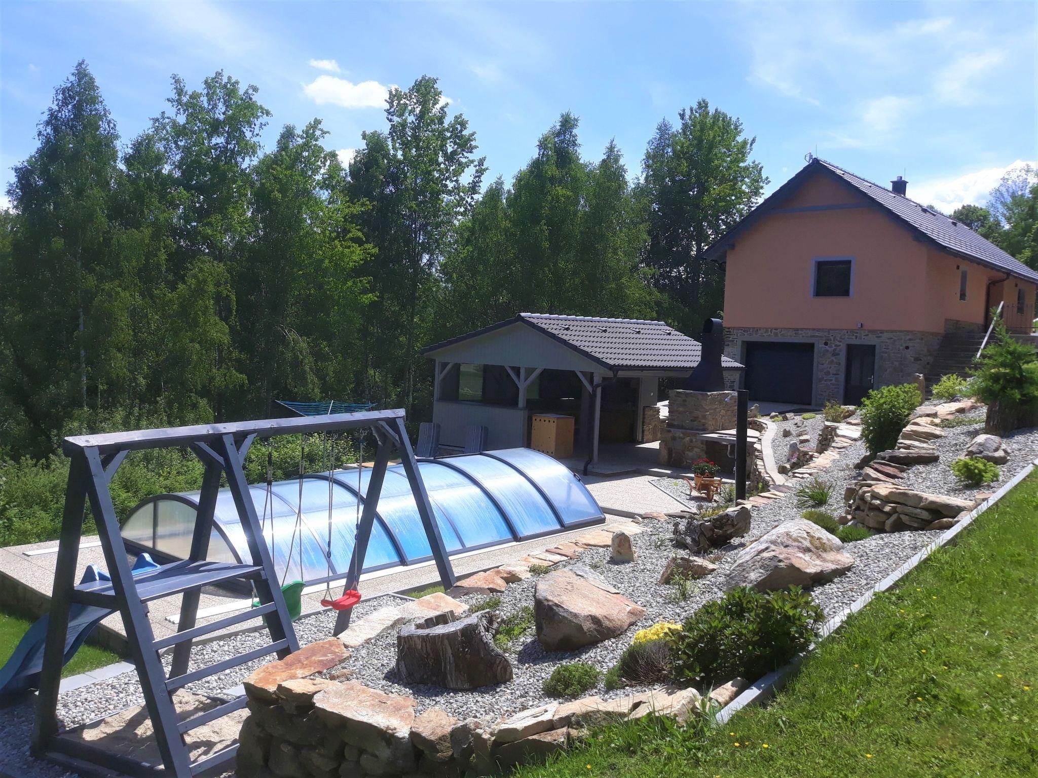 Lažištka/Nebahovy 8 km from Prachatice: Comfortable house, 2 storeys, detached, built in 2017, surrounded by trees. In a quiet, sunny position. Private: property 1'500 m2 with lawn, swimming pool (5 x 3 m, depth 125 cm, seasonal availability: 15.Jun. - 15.Sep.). Outdoor shower, pergola, garden furniture, barbecue house, children's playground (slide, swing). In the house: sauna, central heating system, washing machine. Parking (for 3 cars) on the premises. Shop 2 km, restaurant 8 km, bus stop "Nebahovy, Lažištka rozcestí" 750 m, outdoor swimming pool 8 km, indoor swimming pool 8 km. Nearby attractions: Helfenburk 22 km, Boubínský prales 25 km, Ceský Krumlov, Ceské Budejovice 35 km, Hluboká nad Vltavou, Národní park Šumava 37 km. Well-known ski regions can easily be reached: Libín 12 km, Zadov 40 km. Well-known lakes can easily be reached: Lipno 50 km. The owner does not accept any youth groups.