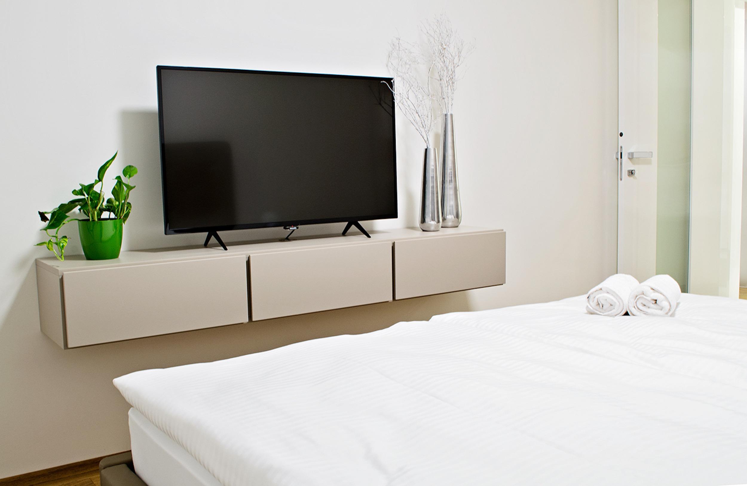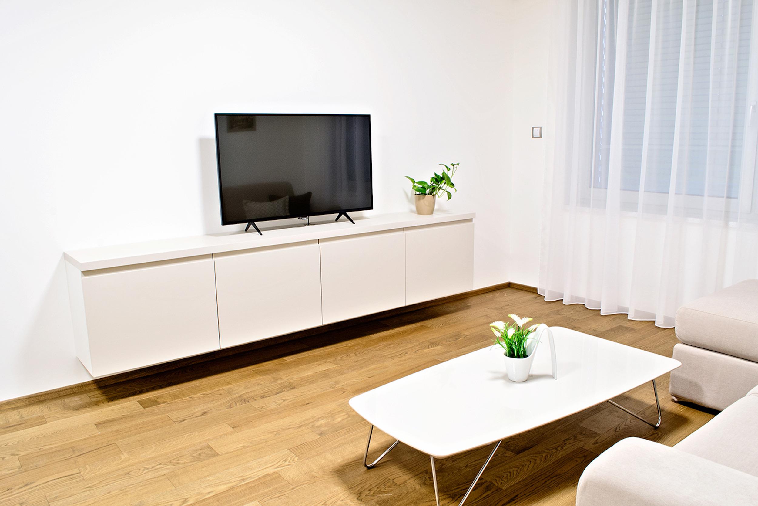 Im großzügigen Wohnzimmer mit 2 Couchlandschafte und Flachbildfernsehen lässt es sich vortrefflich erholen. Die Couchen verwandeln sich schnell in ein bequemes Doppelbett (1,2x2m) und Einzelbet (0,7x1,8m).