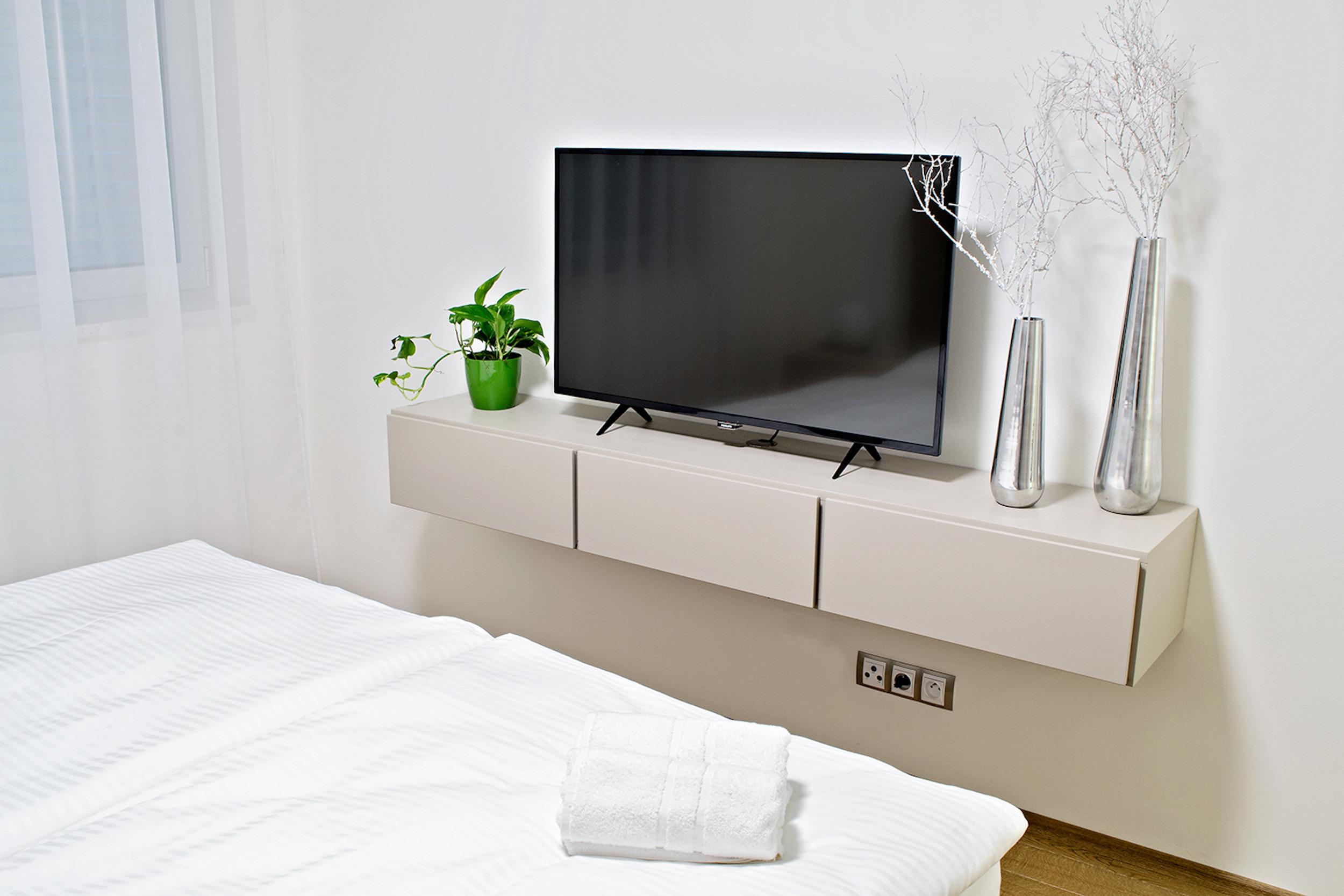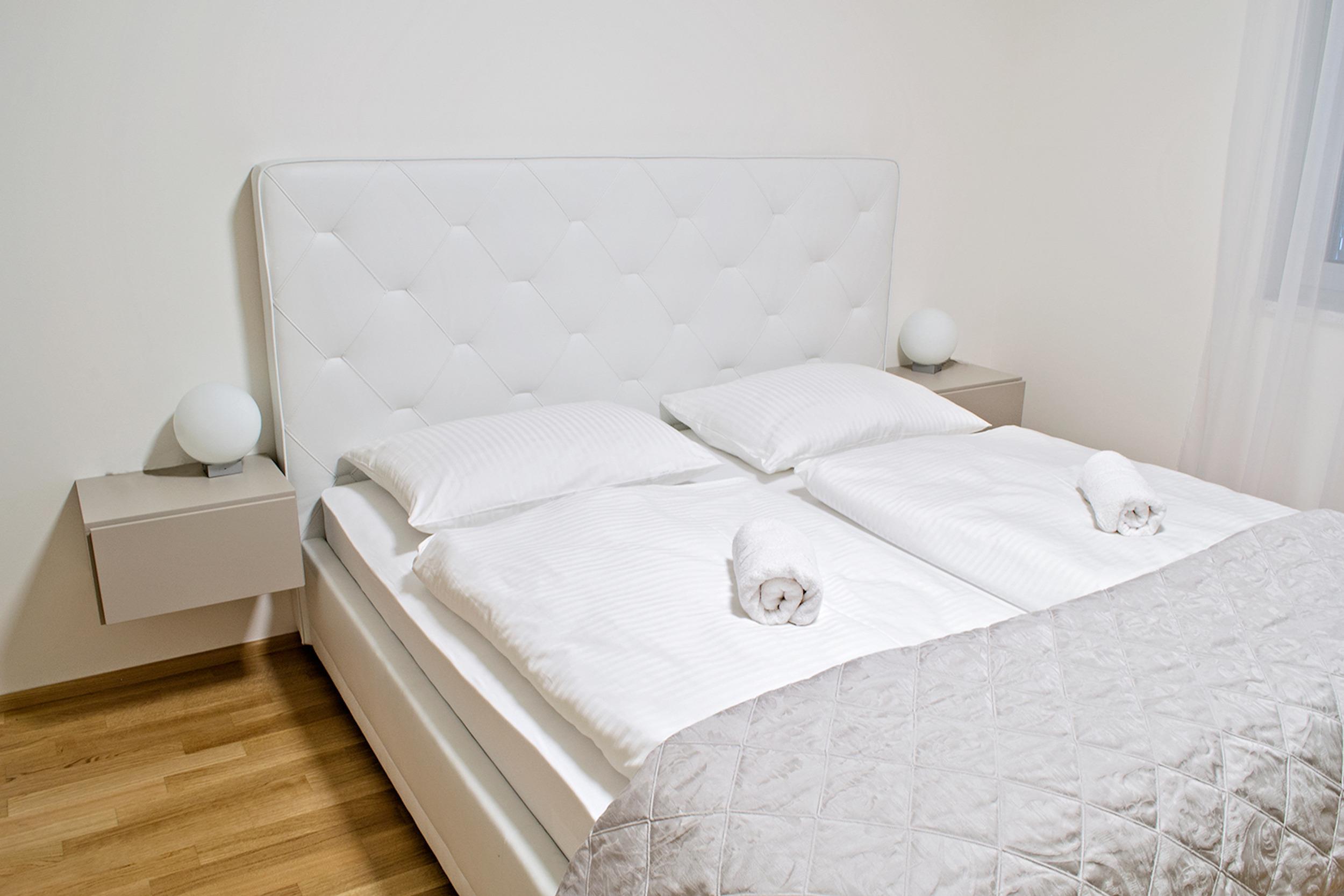 Sie ist ca. 69m² groß und bietet 4 Personen Platz. Zentral gelegen am Wenzelsplatz und dem Nationalmuseum bietet diese Ferienwohnung mit ihren edlen Möbeln für Paare und Familien ausreichend Platz. Die Wohnung besteht aus einem großen Schlafzimmer mit Doppelbett (1,8x2m) und einem Wohnzimmer mit Sofa. Ihr Gepäck können Sie bequem im großen Kleiderschrank verstauen. Entspannt können Sie vom Bett aus einen Film im großen Flachbildschirm-TV anschauen.