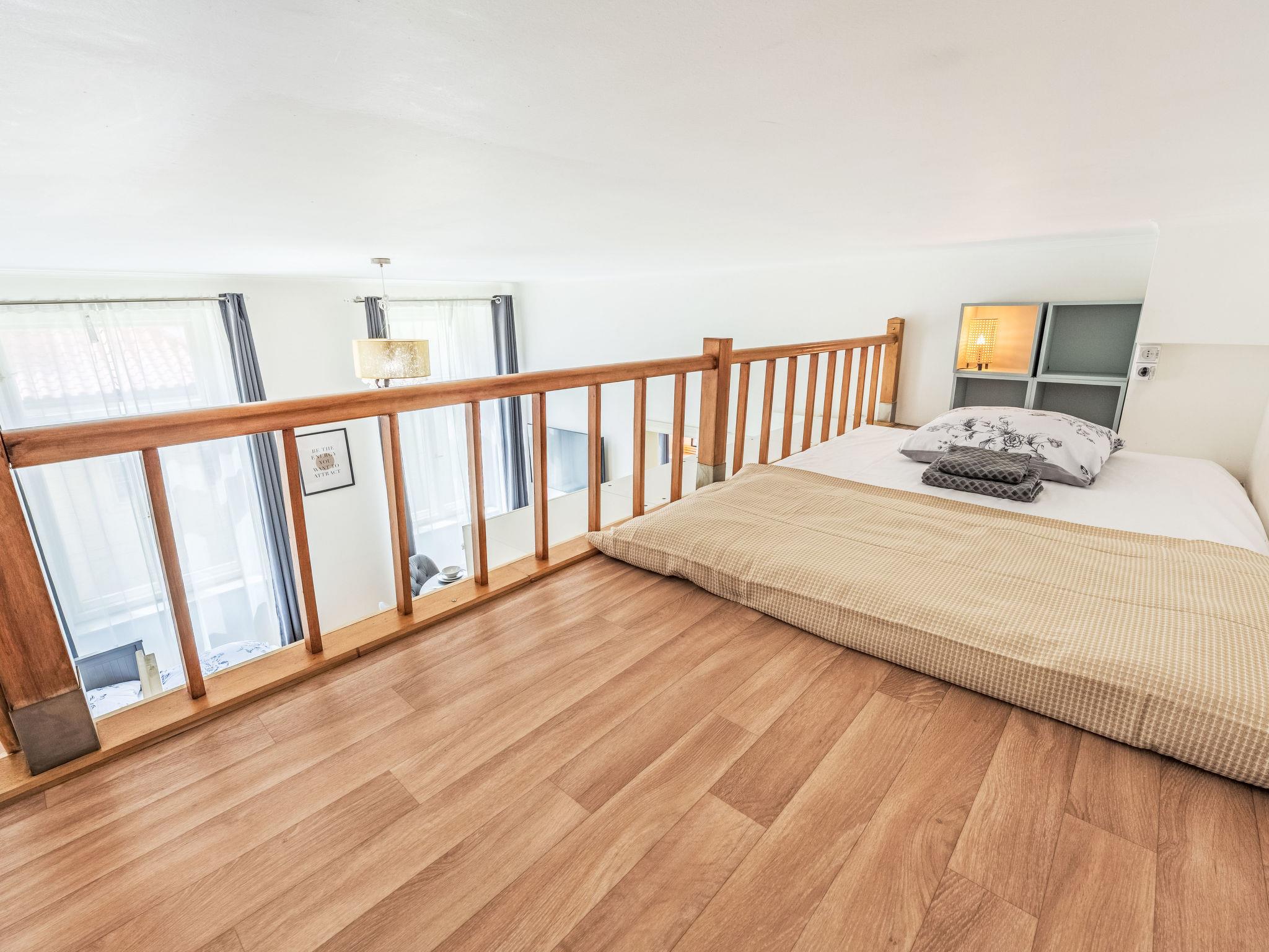 2-room apartment 48 m2 on 2nd floor. Bright, fully renovated, very beautiful and modern furnishings: entrance hall. Living/dining room with 1 double sofabed, dining table and TV. 1 room with 1 double bed. Small gallery with 2 sleeping facilities. Kitchenette (dishwasher, 2 induction hot plates, toaster, kettle, microwave, freezer, electric coffee machine). Shower/WC. Facilities: washing machine, baby cot, hair dryer. Internet (WiFi, free). Please note: suitable for families apartment courtyard side. Non-smokers only. Maximum 1 pet/ dog allowed. Smoke alarm, fire extinguisher. Instead of an enclosed bedroom, some sleeping areas are located in an open-plan area (gallery, alcove, etc.).