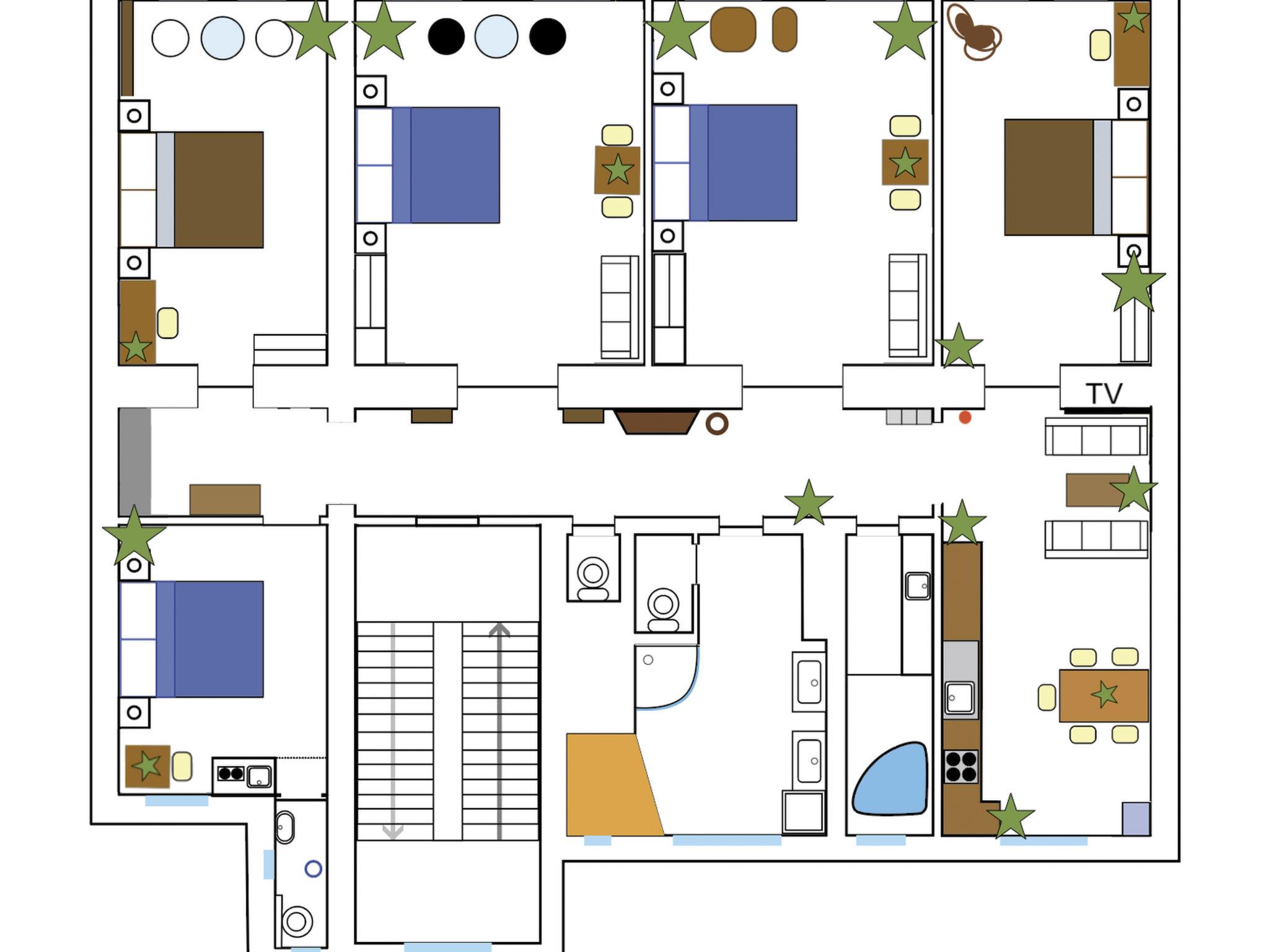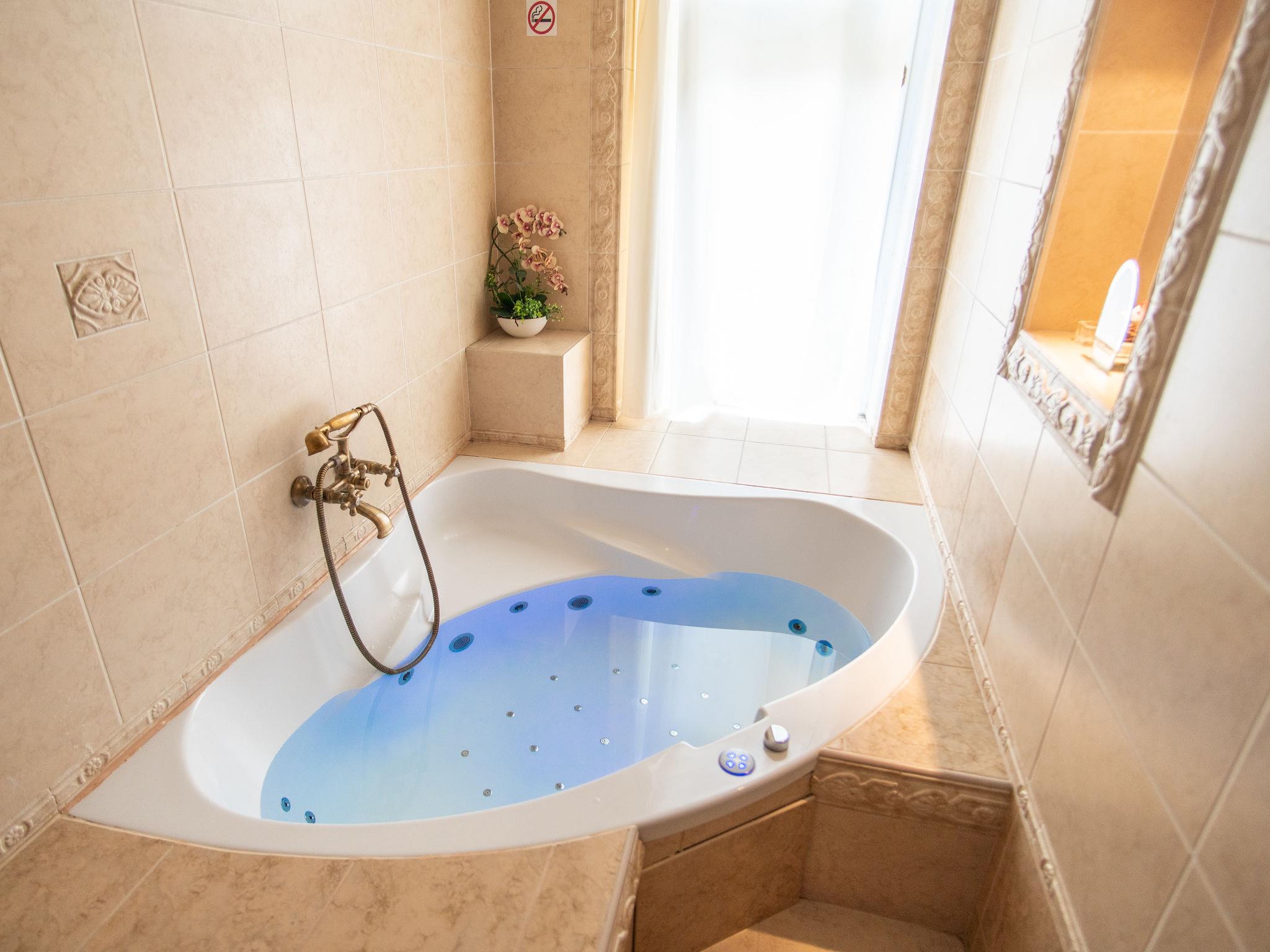 "Spa Residence", 6-room apartment 170 m2 on 2nd floor. Spacious and bright, fully renovated, modern and cosy furnishings: 1 room with 1 double bed, kitchen corner, separate WC and TV (flat screen). 2 rooms, each room with 2 sofabeds and 1 double bed. 2 rooms, each room with 1 double bed. Large kitchen (oven, dishwasher, 4 ceramic glass hob hotplates, toaster, kettle, microwave, freezer) with dining table. Bathroom, shower/WC, sep. WC, hydro massage bath, Sauna. Heating. Facilities: washing machine, dryer, iron, children's high chair, baby cot, hair dryer. Internet (WiFi, free).