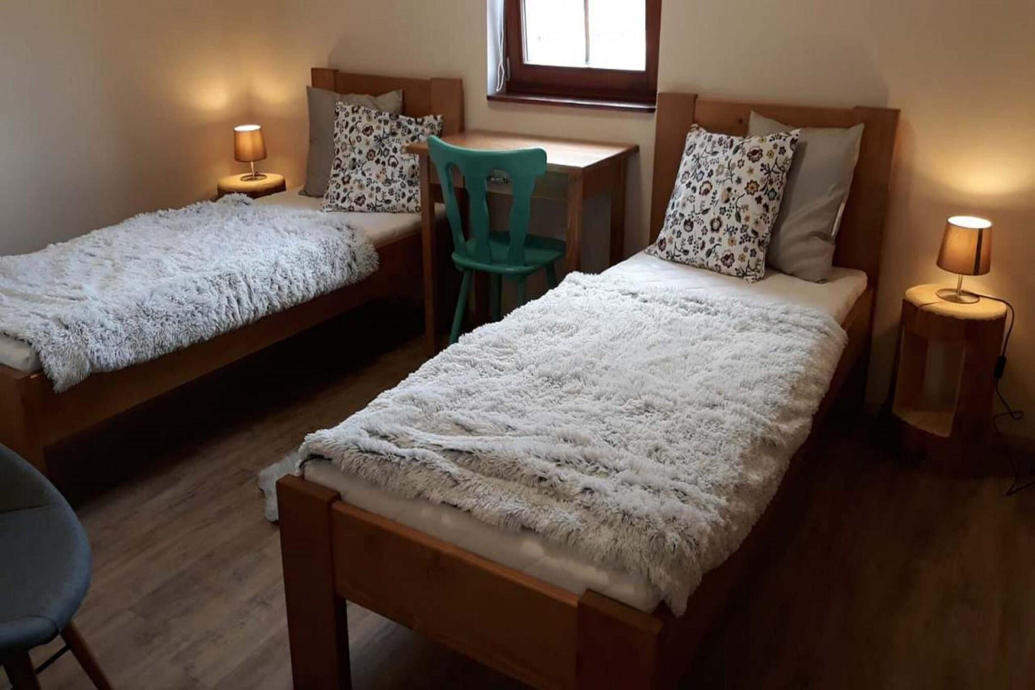 Omgivet af uberørt natur og skov tilbyder dette kompleks af fire nybyggede feriehuse et fredeligt tilflugtssted i den charmerende dal Prkenný Dul, nær byen Žaclér. Hvert rummelige hus på 200 m² kan rumme op til 14 personer, med tre lejligheder med to soveværelser og private sanitære faciliteter. Boligerne inkluderer også et hyggeligt fællesrum med pejs, satellit-tv og internet, hvilket sikrer komfort og afslapning for alle gæster. De veludstyrede køkkener omfatter keramiske komfurer, køleskabe, mikrobølgeovne, ovne og opvaskemaskiner, så gæsterne kan nyde praktisk tilberedning af måltider. Beliggenheden tilbyder gæster året rundt nydelse. Om vinteren tilbyder den nærliggende Family Ski Park Žaclér, kun 70 meter væk, tre pister, en skilift til børn og skiudlejning, hvilket gør den perfekt for familier. Gæster kan også få adgang til Bret Sports Wellness Complex for yderligere skifaciliteter, eller besøge andre nærliggende skisportssteder såsom Janské Lázne, Pec pod Snežkou og Mladé Buky. For ikke-skiløbere byder området på vandreture, sightseeing og udflugter til lokale attraktioner såsom Adršpach-klippeformationerne og Dvur Králové. Byen Žaclér byder på restauranter, butikker og skiudlejning, alt sammen inden for 1 km. I varmere vejr kan gæsterne slappe af udendørs i haven, nyde terrassen med havemøbler eller tage en dukkert i den fælles opvarmede swimmingpool. Familier kan slappe af i legepladsen, og tennisentusiaster vil sætte pris på banen på stedet.