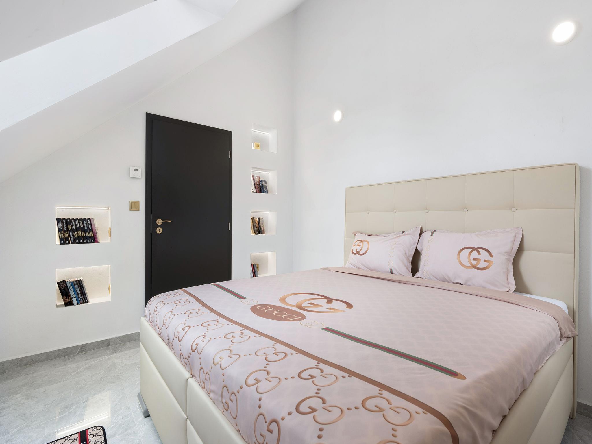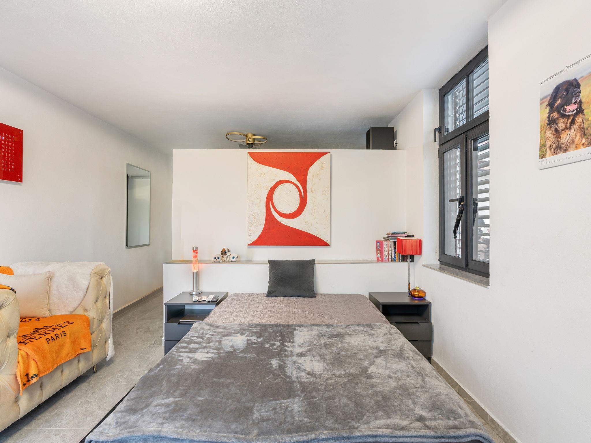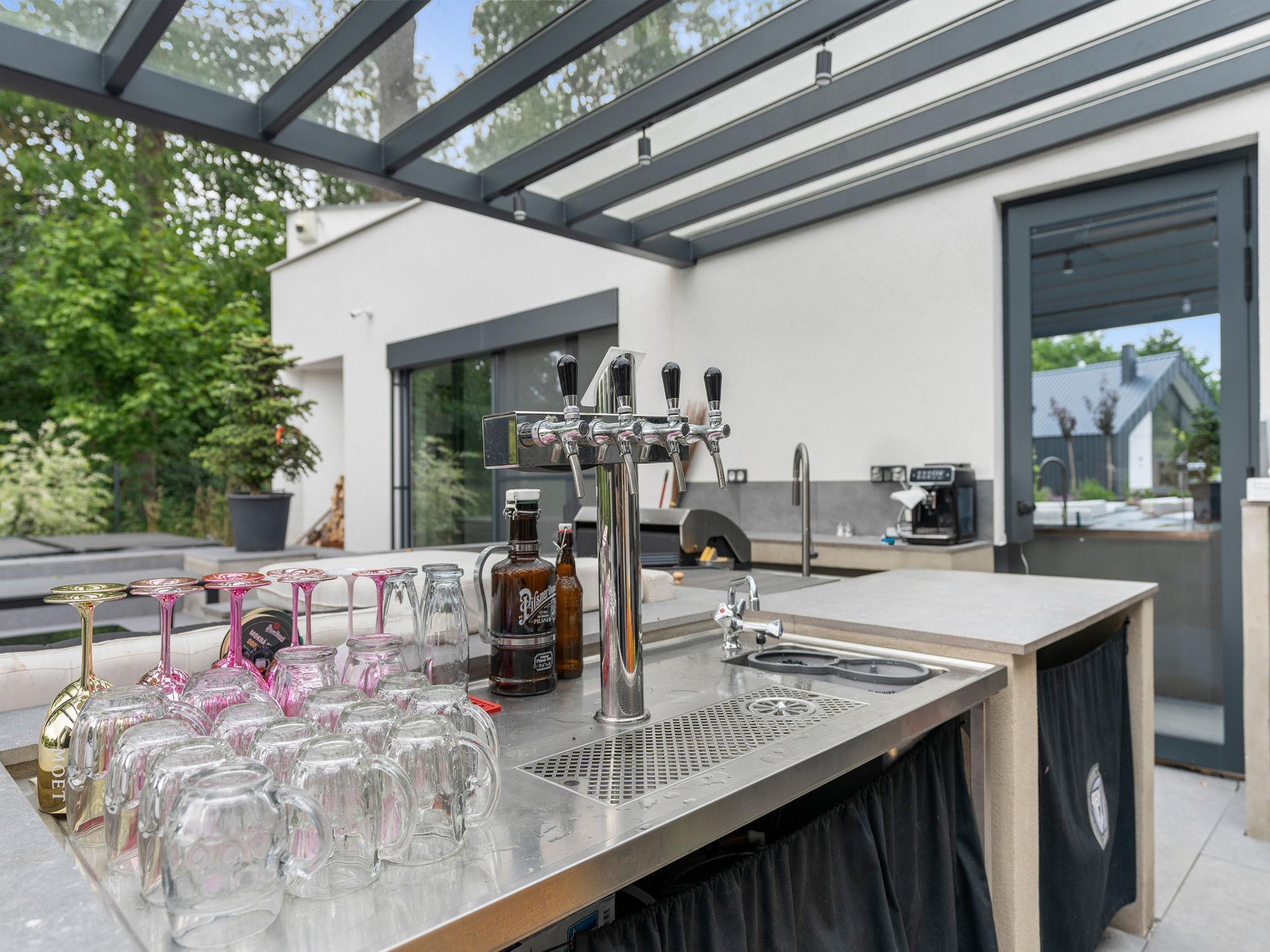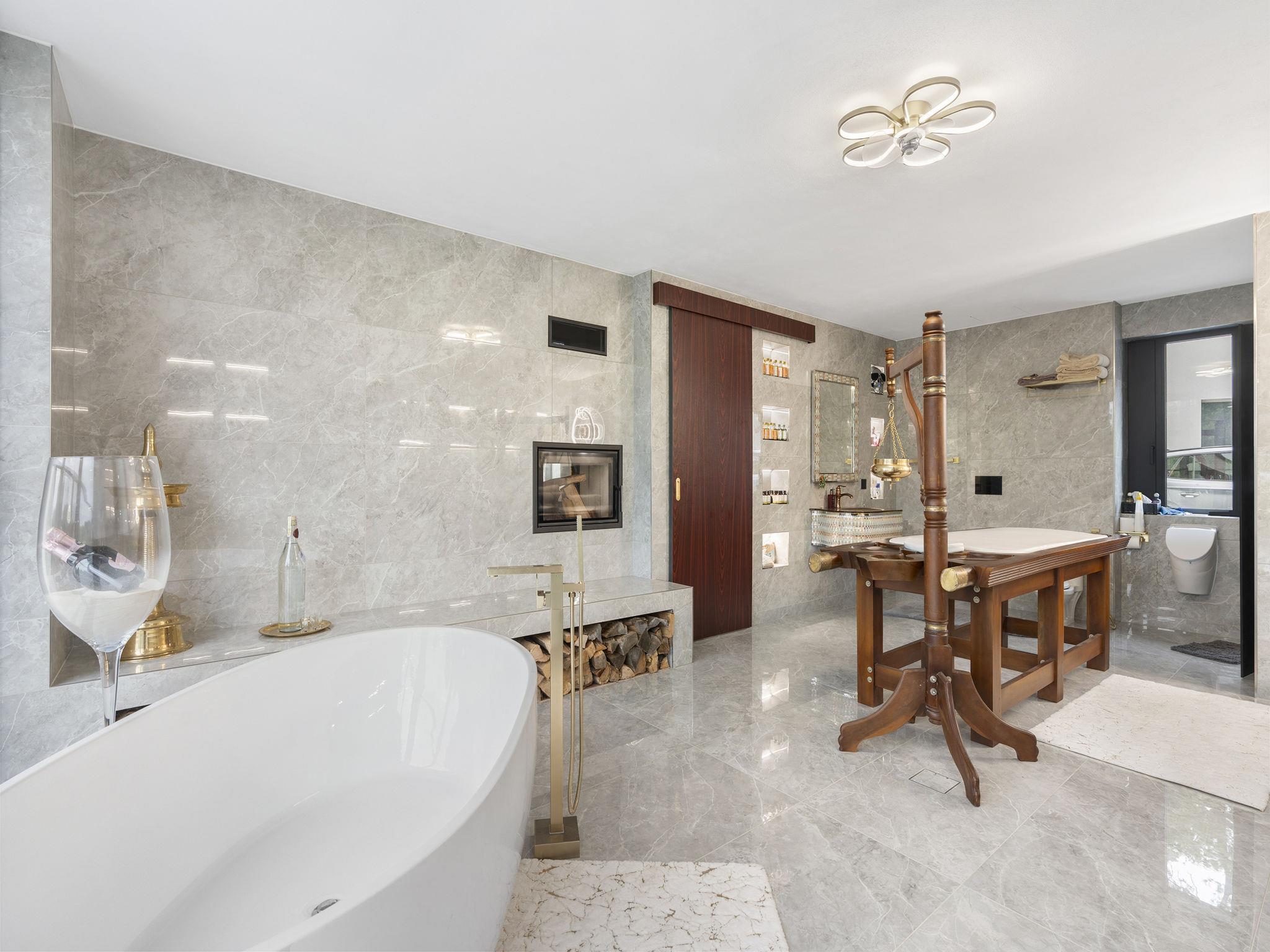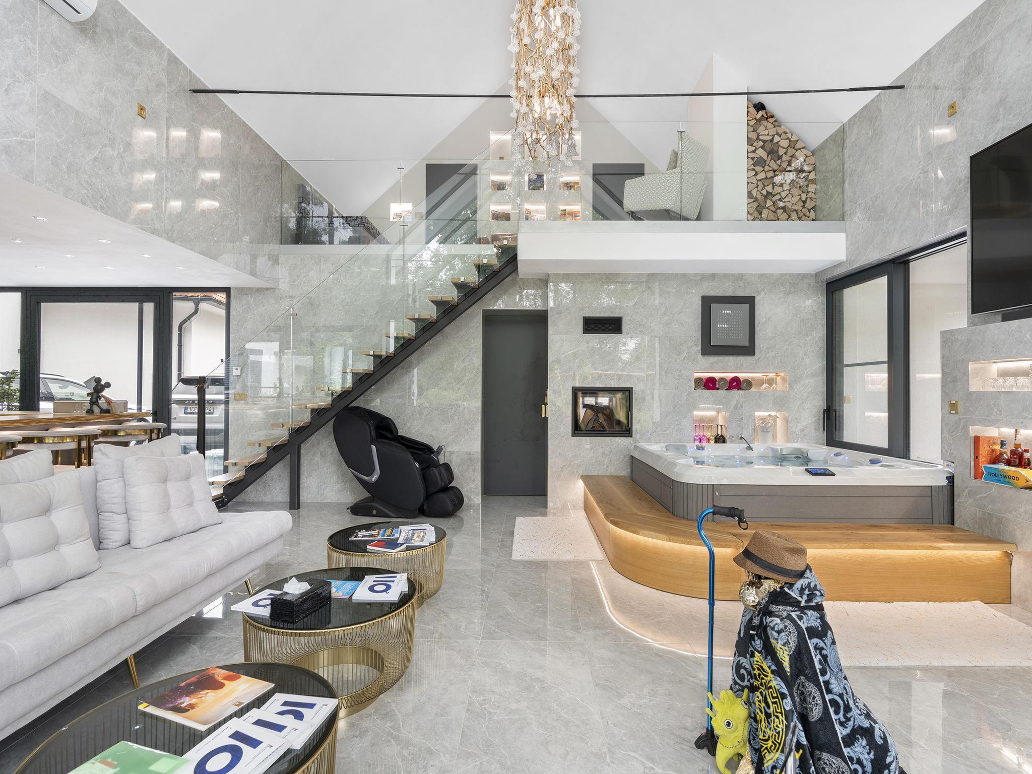 "Ayurvedic Palace", 7-room house 250 m2 on 2 levels. Modern and luxurious furnishings: large living room with hydro massage bath and TV. 1 room with 1 double bed, shower/WC and TV. Walk-through room with shower/WC. 1 room with 1 double bed and TV. Exit to the terrace. 1 room with 1 double bed and TV. Exit to the terrace. Open kitchen (oven, dishwasher, 4 induction hot plates, kettle, microwave, electric coffee machine, Capsules for coffee machine (Nesperesso)) with dining table. Hydro massage bath. Upper floor: 1 room with 1 double bed, shower/WC and TV. 1 room with 1 double bed, shower/WC and TV. Terrace. Terrace furniture. Facilities: Internet (WiFi, free). Please note: non-smoking house. Maximum 2 pets/ dogs allowed. No lift. The dominant feature of this property is an open living room with an unconventional duplex solution (ceiling height 9 meters). Teppanyaki style with seating for 10 people - suitable for cooking courses or other forms of shared gastronomy, which is also reflected in the kitchen equipment: Professional MIELE coffee machine, 3x AEG oven, ice cream maker, chocolate fountain, pancake maker and other professional kitchen equipment. Double-sided fireplace. Indoor hydromassage bathtub for 6 people, 190 diagonal TV, home cinema. 3 x highly efficient electric massage chair with 180 relaxation programs. The indoor Tepanyaki is followed by a summer kitchen with seating for up to 20 people with a grill and tap equipment and cooling for 4 drinks. Private outdoor Swim Spa hydro massage bath with countercurrent (length 4 m). On request: 3 x rooms with 1x bed and 1x double bed (180 cm), shared bathroom with shower and toilet.