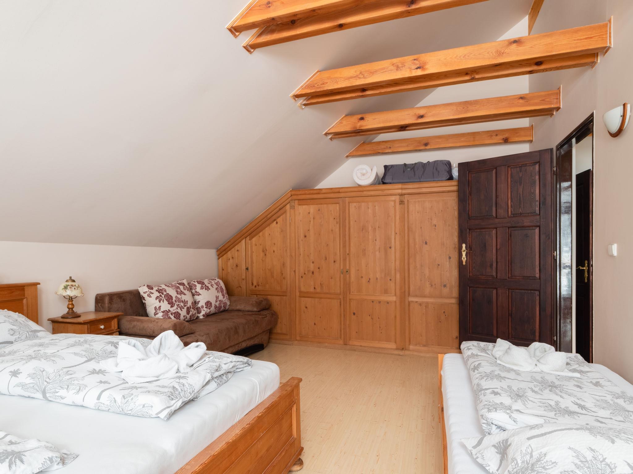 7-room house 238 m2 on 2 levels. Living room with open-hearth fireplace, dining table, dining nook and TV (flat screen), radio. Exit to the swimming pool. Kitchen (oven, dishwasher, 4 ceramic glass hob hotplates, toaster, kettle, microwave, freezer, electric coffee machine). Shower, 2 sep. WC's, Sauna. Electric heating. Upper floor: 3 double bedrooms, each room with TV (flat screen). 2 rooms, each room with 1 bed, 1 double bed and TV (flat screen). 1 double bedroom with shower/WC. Shower, sep. WC. Terrace. Terrace furniture, barbecue. View of the countryside. Facilities: washing machine, children's high chair, baby cot. Internet (WiFi, free). Suitable for families. CZ41393