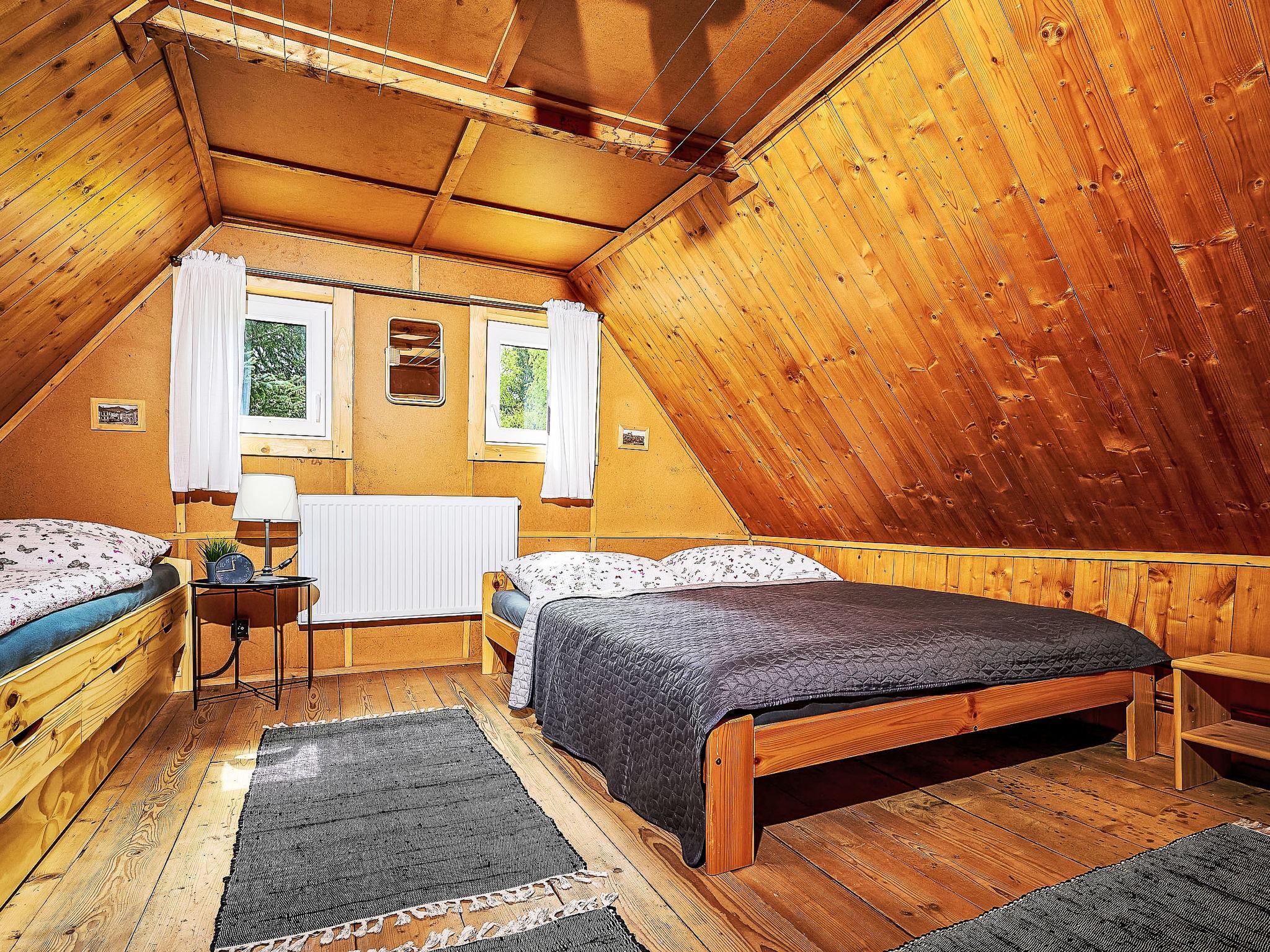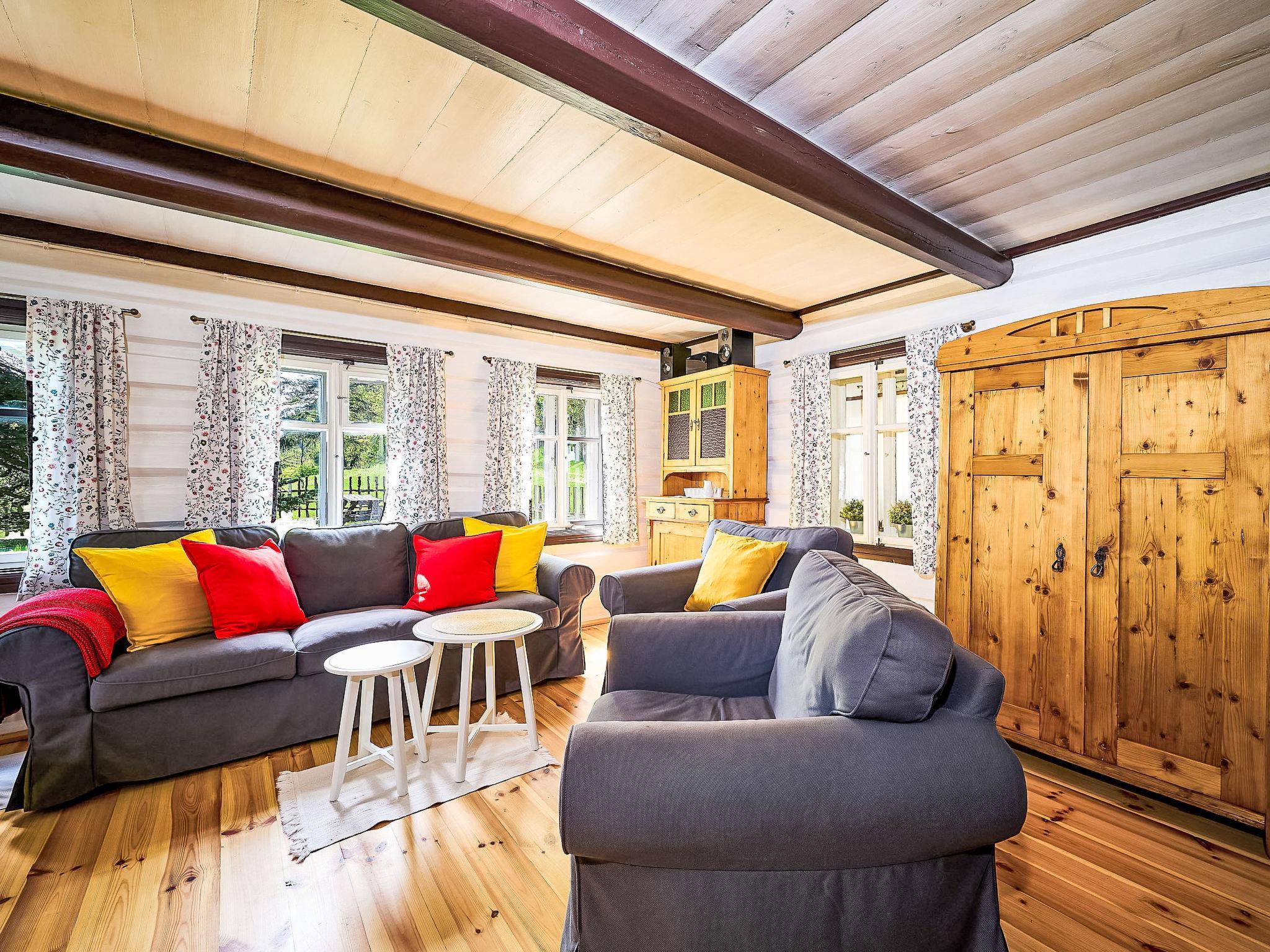 3-room cottage. Object suitable for 6 adults + 1 child. Very beautiful and stylish furnishings: living/dining room with Scandinavian wood stove, TV and electric heating. Kitchenette (oven, dishwasher, 4 ceramic glass hob hotplates, toaster, kettle, microwave, electric coffee machine). Shower/WC. Heating, boiler. Upper floor: 1 room with 1 double bed. 1 room with 2 beds, 1 double bed and 1 pull-out bed. Terrace. Terrace furniture. Beautiful view. Facilities: washing machine, hair dryer. Internet (WiFi, free). Please note: suitable for families. Non-smoking house.