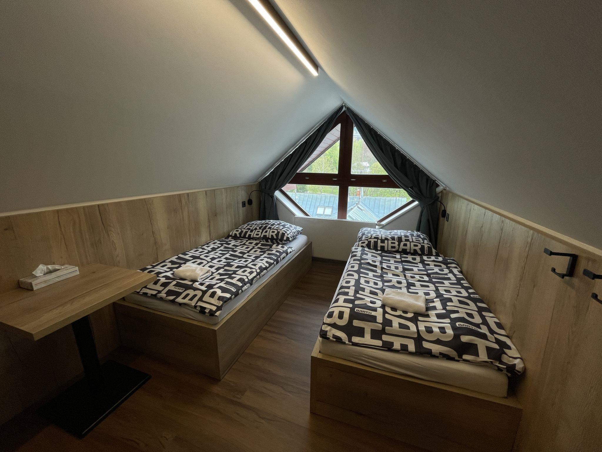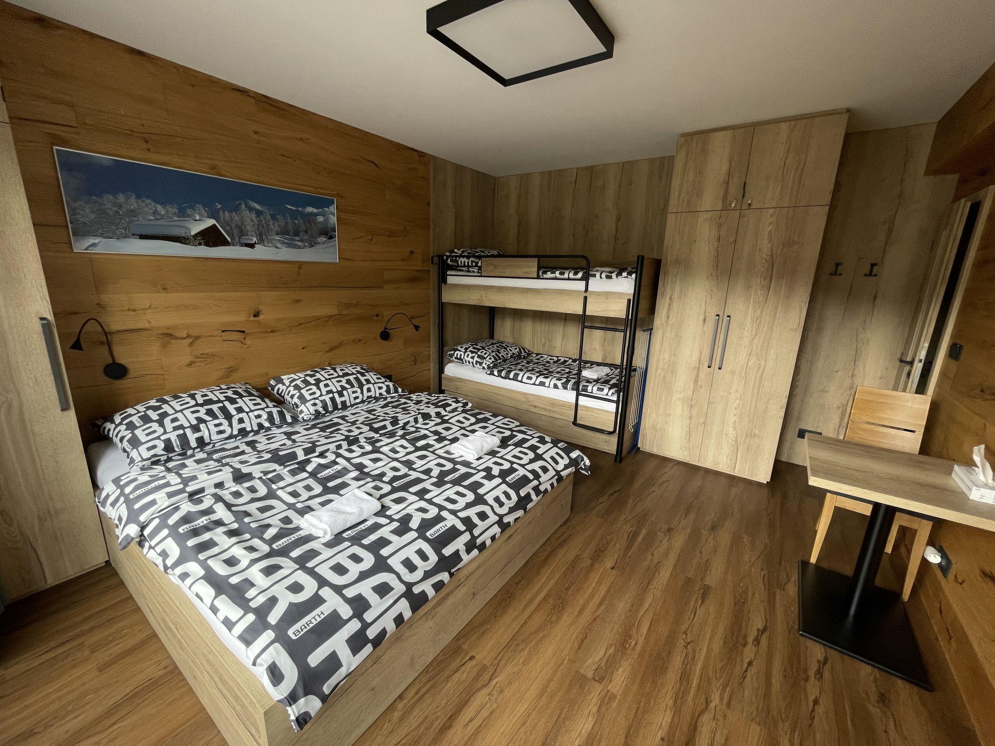 "Špindleruv Mlýn 61", 5-room maisonette 130 m2 on 2 levels, on the top floor. Renovated, luxurious furnishings: living room with sloping ceilings with dining table and TV. Exit to the balcony. 1 room with 1 x 2 bunk beds, 1 double bed and 1 pull-out bed. Kitchenette (oven, dishwasher, 4 ceramic glass hob hotplates, microwave, freezer, electric coffee machine). Shower/WC, sep. WC. Upper floor: 1 room with sloping ceilings with 1 bed and 1 double bed. 1 room with sloping ceilings with 1 bed and 1 double bed. 1 room with sloping ceilings with 2 beds. Shower/WC. Large balcony. Balcony furniture. Beautiful view of the countryside. Facilities: sauna. Internet (WiFi, free). Parking (roofed, 2 cars). Suitable for families.