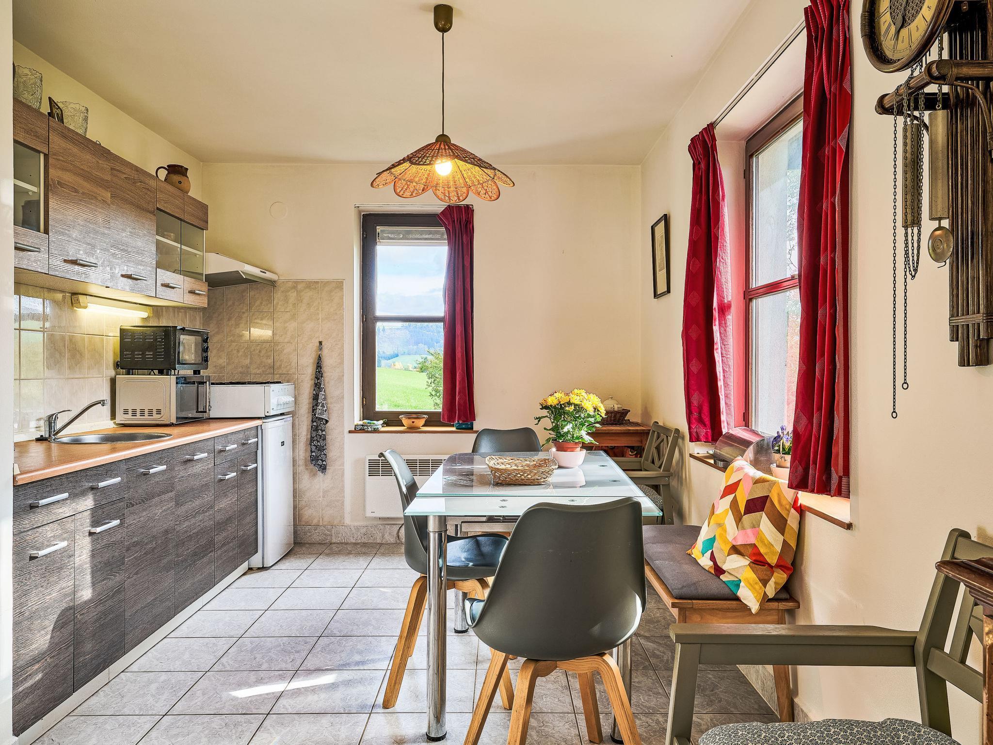 4-room chalet 100 m2 on 2 levels. Bright, fully renovated in 2024, cosy furnishings: living room with Scandinavian wood stove, satellite TV and flat screen. Exit to the terrace. Open kitchen (4 hot plates, oven, dishwasher, toaster, kettle, microwave, freezer, electric coffee machine) with dining table. Bath/WC, sep. WC. Electric heating. Upper floor: 1 room with 2 beds. 1 room with 2 beds. 1 room with 1 double bed. Sep. WC. Terrace 11 m2. Terrace furniture. Beautiful panoramic view of the valley and the countryside. Facilities: washing machine, iron, children's high chair, baby cot (extra). Internet (WiFi, extra). Please note: suitable for families. Non-smoking house. Maximum 2 pets/ dogs allowed.