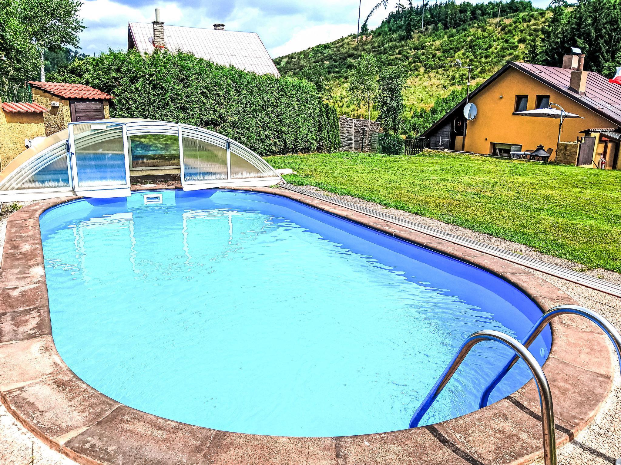 Comfortable house "Dolníky u Trutnova", 3 storeys, detached. On the outskirts, in a quiet, sunny position. Private: property (fenced), swimming pool (8 x 3 m, depth 120 cm, seasonal availability: 01.May. - 30.Sep.) with shutter cover. Basketball, terrace, garden furniture, barbecue, fireplace, children's playground (swing). In the house: hot tub, infrared sauna, trampoline, central heating system, washing machine. Roofed, parking (for 3 cars) on the premises. Shop 2 km, restaurant 1 km, bus stop "Trutnov, Bojište, U kríže" 1.6 km, outdoor swimming pool 4.5 km, indoor swimming pool 4 km, public bathing area 1.2 km. Ski lift 10 km, slopes 10 km. Nearby attractions: Trutnov 4 km, Rozhledna Žaltman, ZOO Dvur Králové 22 km, Adršpašské skály 25 km, zámek Ratiborice%3F babicino údolí 25 km, zámek Kuks 26 km. Well-known ski regions can easily be reached: Mladé Buky, Petríkovice 10 km, Radvanice 15 km, Cerná Hora/Janské Lázne 16 km, Herlíkovice 32 km, Špindleruv Mlýn 39 km. Well-known lakes can easily be reached: rybníky Dolce 1 km, vodní nádrž Les Království 25 km, vodní nádrž Rozkoš 28 km.