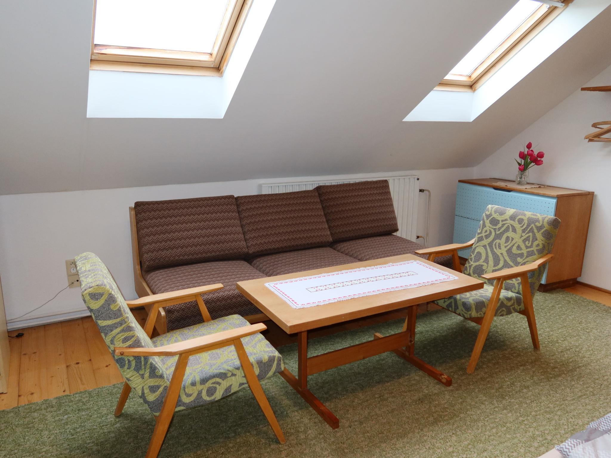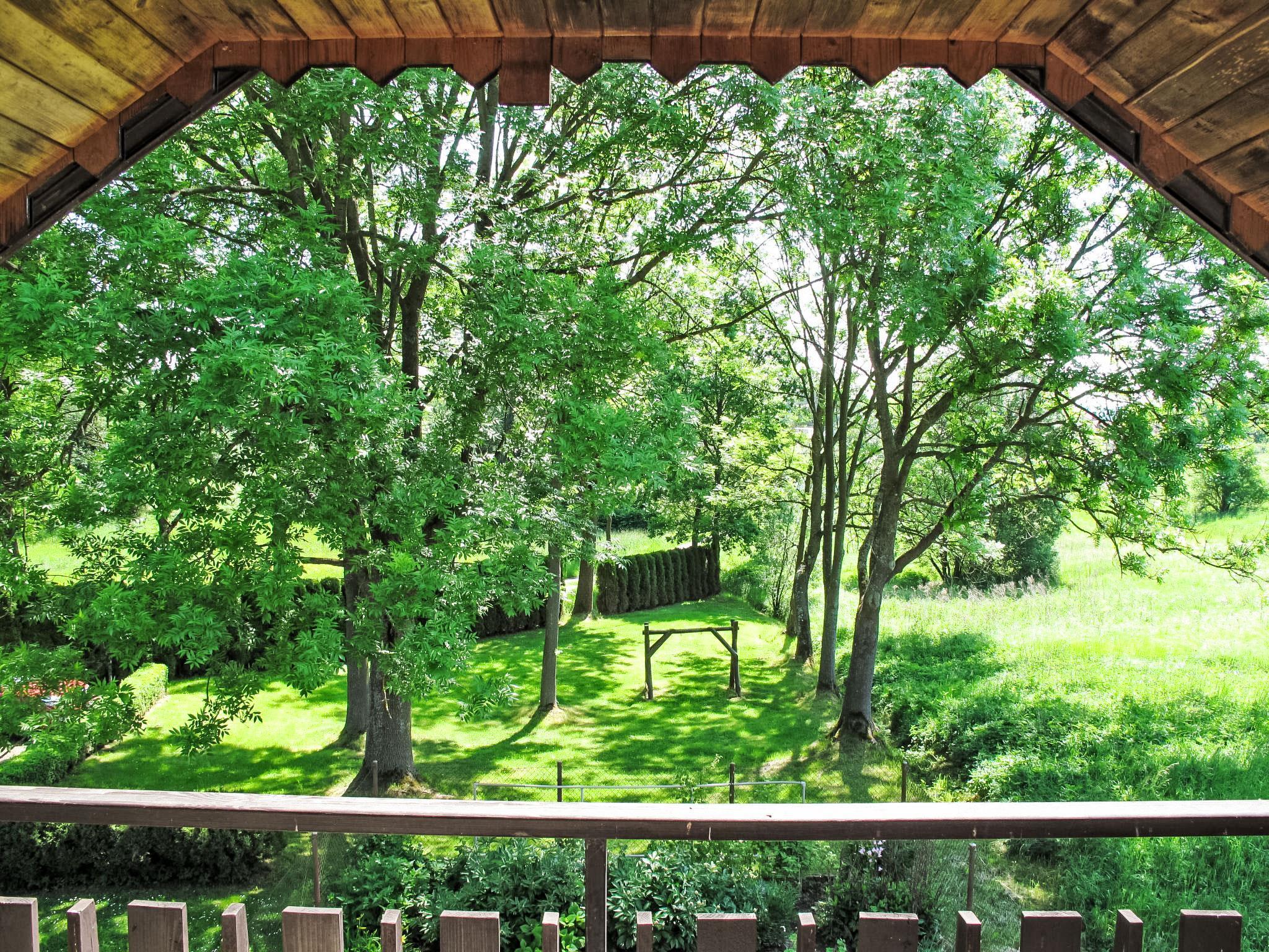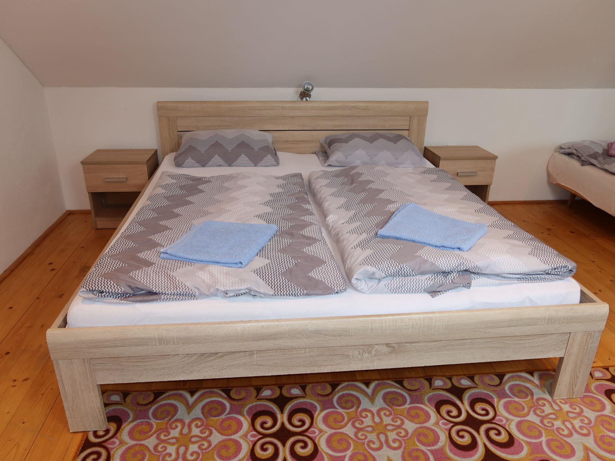 4-room semi-detached house 120 m2 on 2 levels. Practical furnishings: living/dining room 30 m2 with satellite TV (flat screen), radio. Exit to the garden. 1 room with 1 double bed. Kitchenette (oven, dishwasher, 4 ceramic glass hob hotplates, microwave, freezer, electric coffee machine). Bath/shower, bidet, sep. WC. Gas heating. Upper floor: walk-through room 30 m2, with sloping ceilings with 3 beds (82 cm, length 192 cm), 1 sofabed (150 cm, length 200 cm). 1 room with sloping ceilings with 1 bed (82 cm, length 192 cm), 1 double bed. Exit to the loggia. Sep. WC. Beautiful view of the countryside. Facilities: washing machine, baby cot. Please note: suitable for families. Non-smoking house. Maximum 2 pets/ dogs allowed. Fire extinguisher. One of the bedrooms on the upper floor leads to another bedroom with loggia.