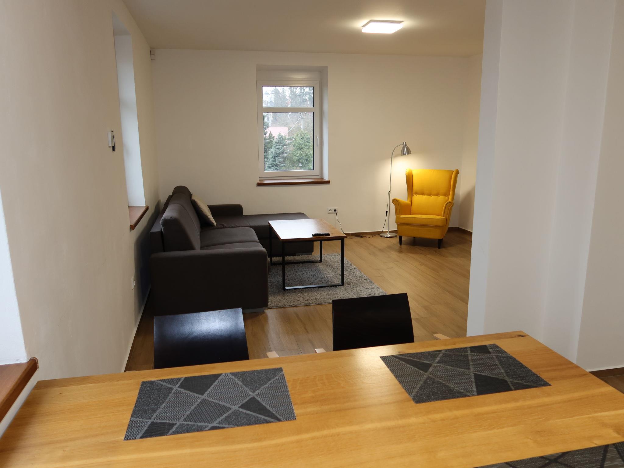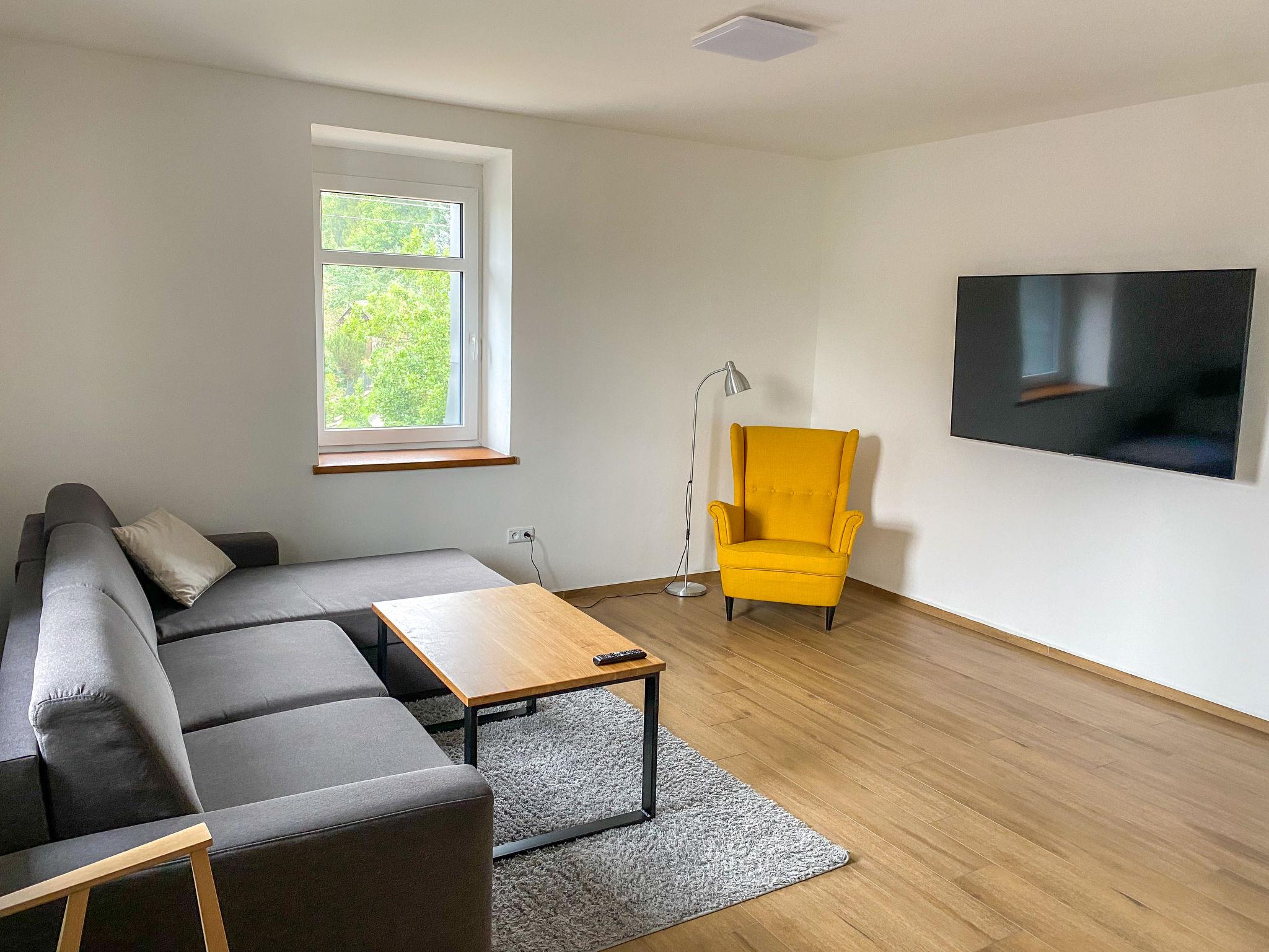 2-room apartment 60 m2, on the upper floor. Spacious and bright, fully renovated in 2021, very comfortable and beautiful furnishings: open large living room with 1 double sofabed (140 cm, length 190 cm), TV (flat screen). 1 room with 2 beds (100 cm, length 200 cm), 1 double bed (200 cm, length 200 cm). Open kitchen (oven, dishwasher, 4 induction hot plates, toaster, kettle, microwave, freezer) with dining table. Shower/WC. Floor heating. Facilities: washing machine, children's high chair, baby cot. Internet (WiFi, free). Please note: suitable for families. Non-smoking house. Private entrance. (Private entrance leading from the internal staircase.).