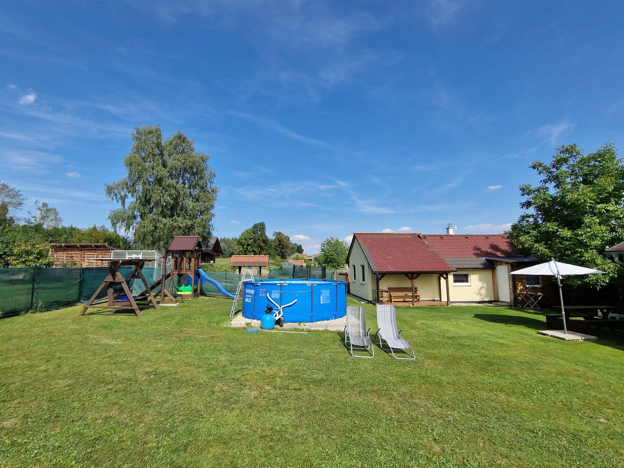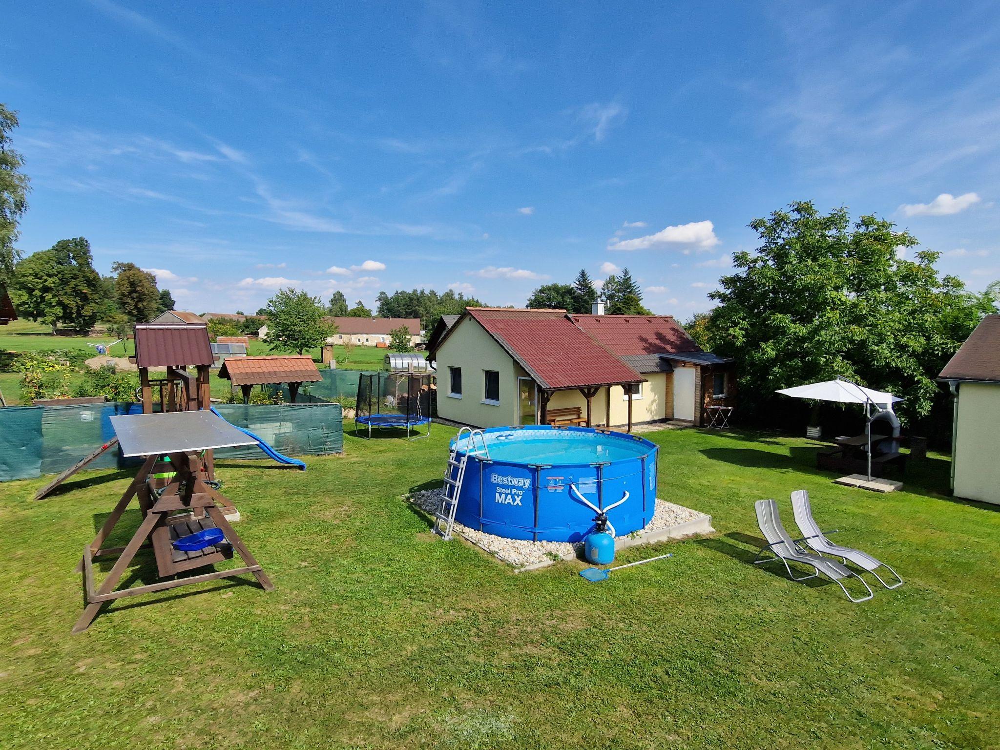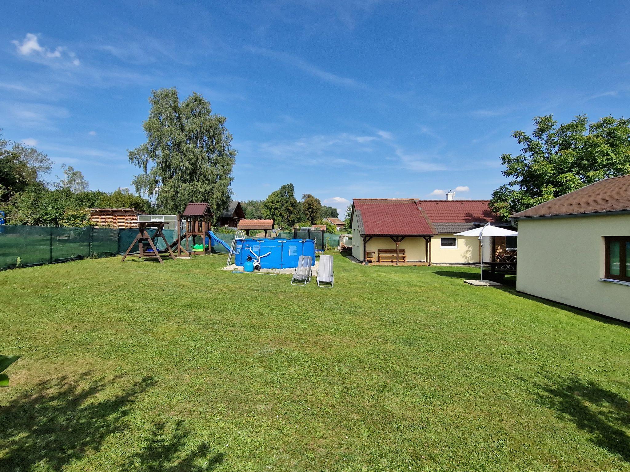 Cosy bungalow "Velký Ratmírov", detached. In a quiet, sunny position. Private: property 100 m2 (fenced), swimming pool (above ground) round (3.6 m diameter, depth 120 cm, seasonal availability: 01.Jun. - 30.Sep.). Garden furniture, barbecue, children's playground. In the complex: trampoline. Parking. Shop, restaurant 500 m, bus stop "Velký Ratmírov" 500 m, railway station "Debolín" 2.5 km. Fishing possibilities 2 km. Nearby attractions: Zámek Kardašova Recice, Pluhuv Ždár 10 km, Zámek, muzeum Jindrichuv Hradec 10 km, Zámek Cervená Lhota, Jemcina, Dírná 14 km, Zoopark Na Hrádecku 14 km, Hrad a zámek Stráž nad Nežárkou 16 km, Provaznické muzeum Karla Klika 16 km. Well-known lakes can easily be reached: Velká Holná 6 km. Hiking paths: Ceská Kanada 20 km, Trebon 30 km.