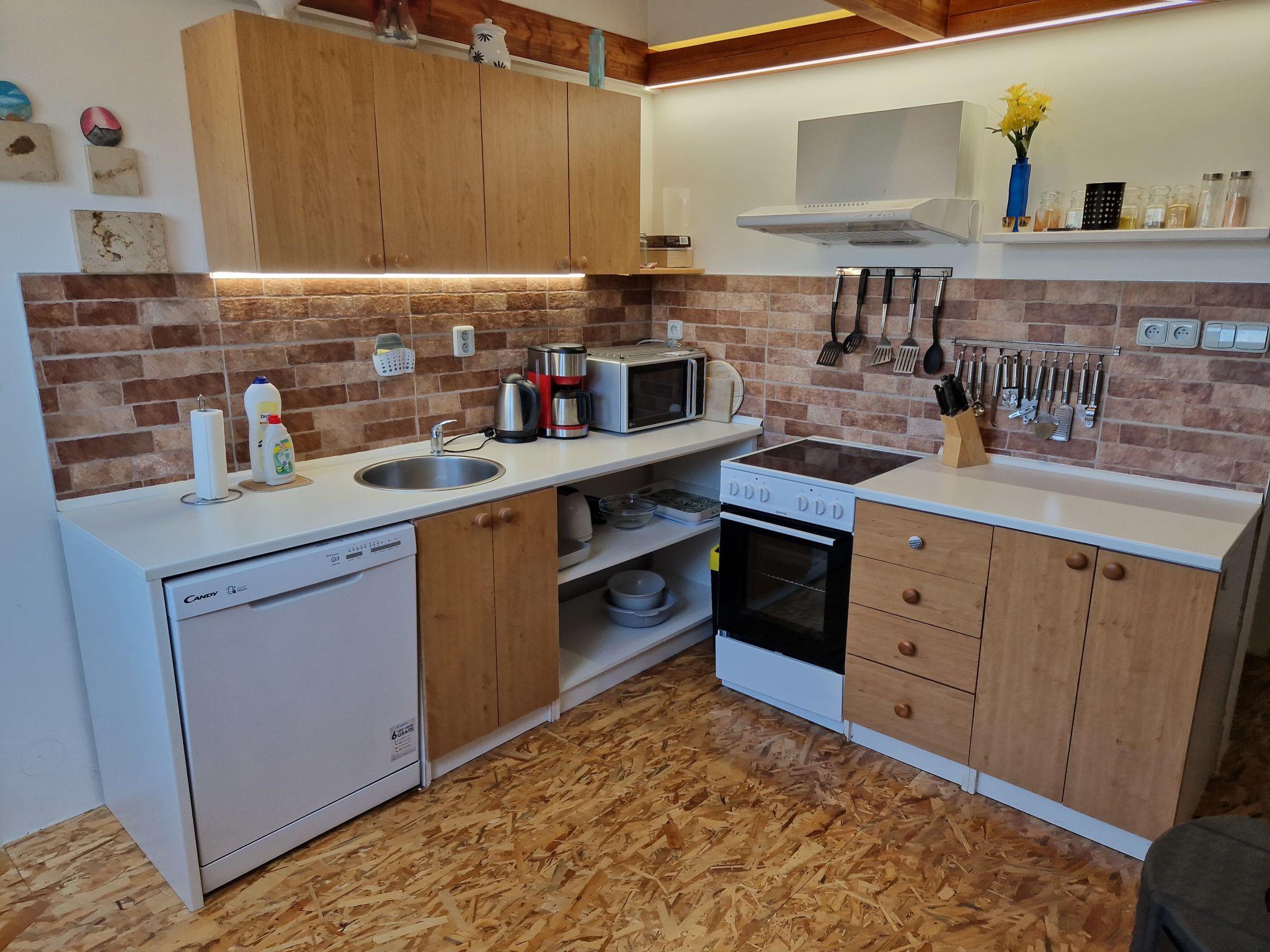 3-room house. Living/dining room with wood-burning stove. 1 room with 1 double bed. Walk-through room with 1 bed and 1 x 2 bunk beds. Open kitchen (oven, dishwasher, 4 ceramic glass hob hotplates, kettle, microwave, electric coffee machine) with kitchen corner. Shower, sep. WC. Wood heating. Facilities: Internet (WiFi, free). Please note: suitable for families. Non-smoking house.
