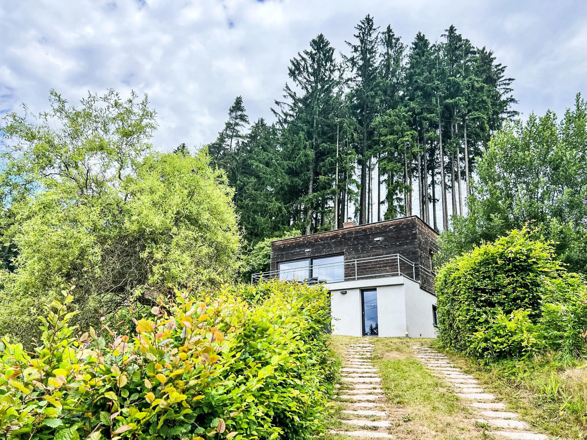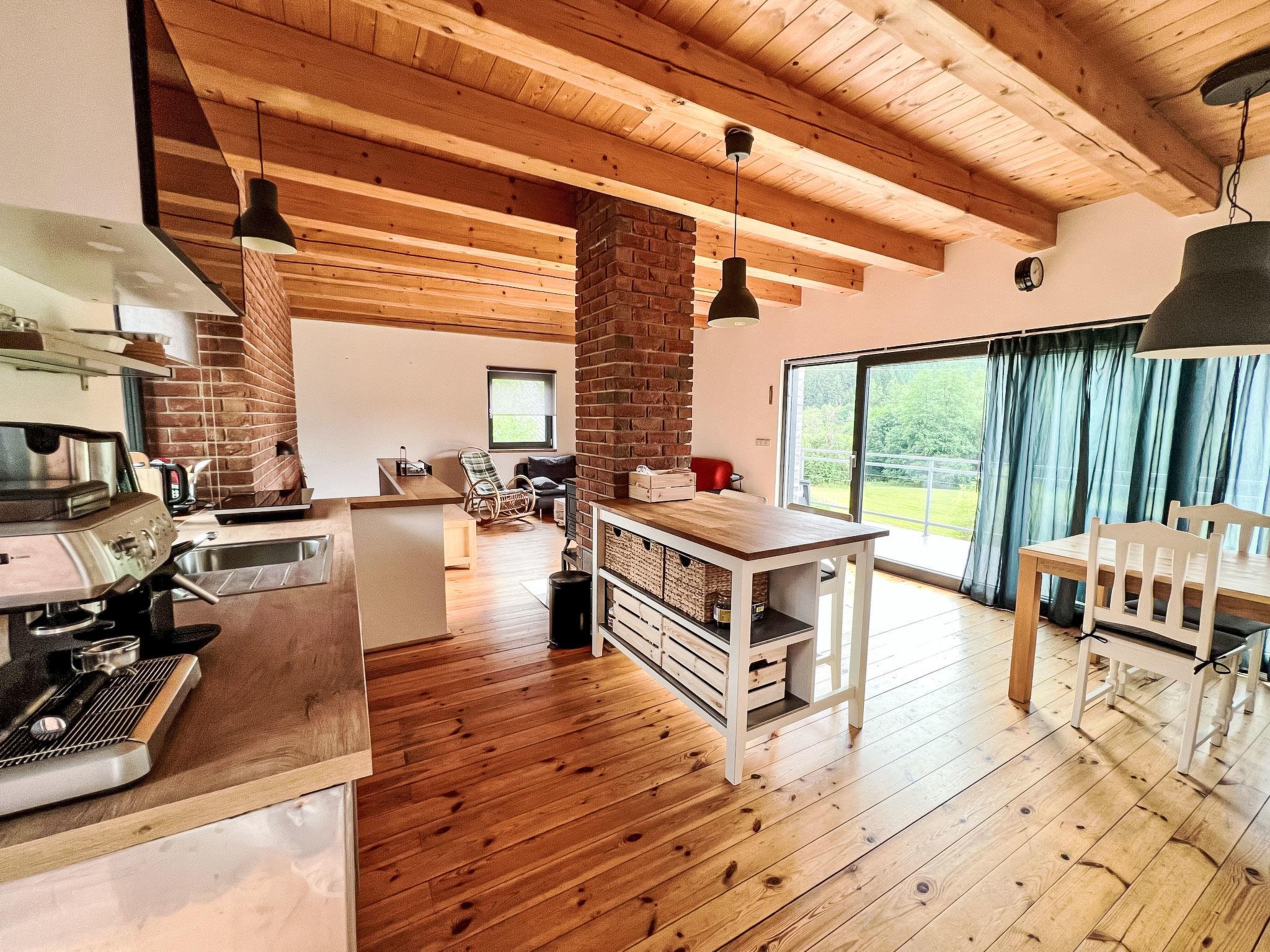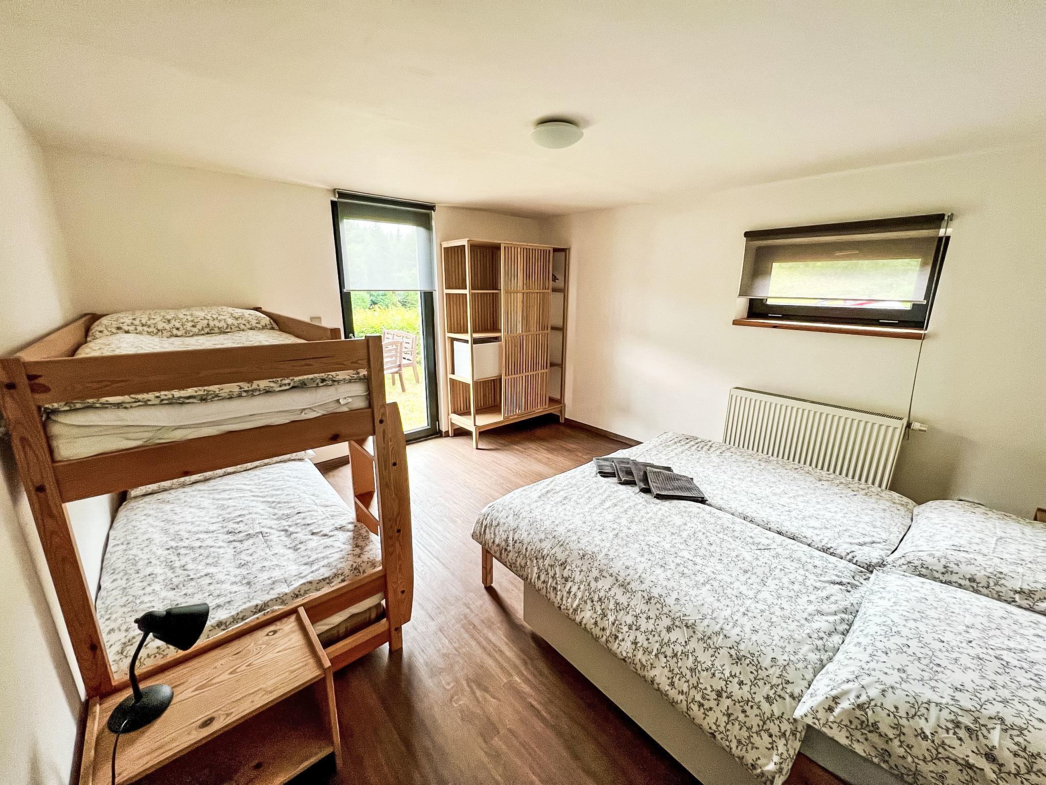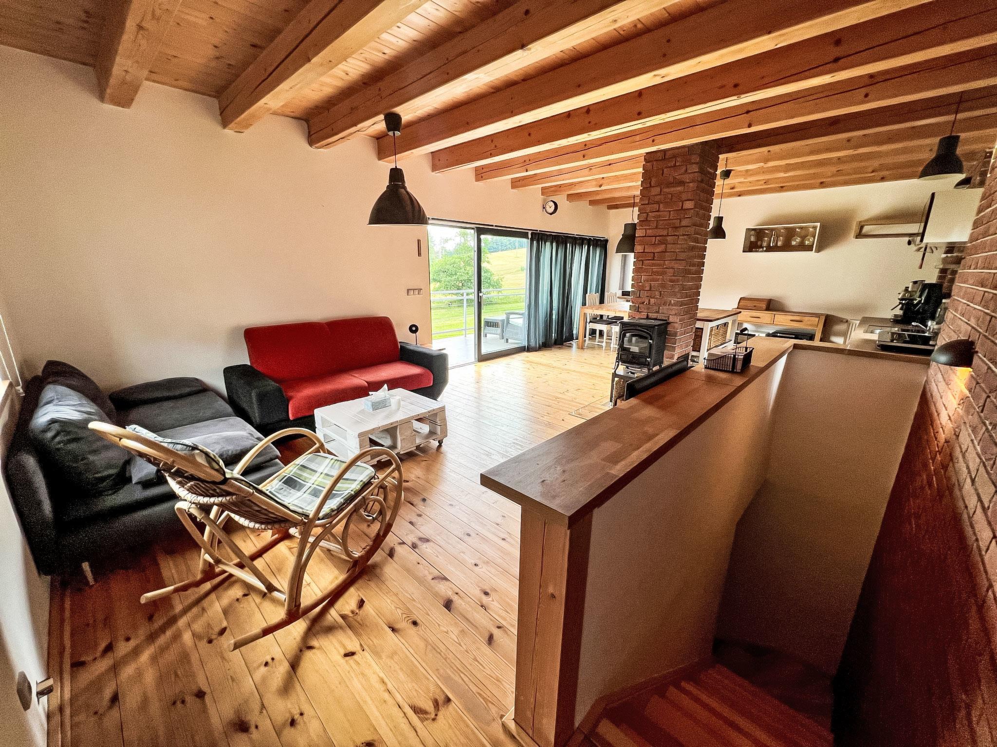 3-room chalet on 2 levels. 1 room with 1 double bed. Exit to the garden. 1 room with 1 x 2 bunk beds, 1 double bed. Exit to the garden. Shower/WC, sep. WC, Sauna. Upper floor: (steep stair) large living room with panoramic window with 1 double sofabed, Scandinavian wood stove and TV. Exit to the terrace. Kitchenette (oven, dishwasher, 4 induction hot plates, toaster, kettle, microwave, freezer, electric coffee machine) with dining table. Electric heating, wood heating. 2 terraces. Terrace furniture. Beautiful view of the countryside. Facilities: washing machine. Internet (WiFi, free). Please note: non-smoking house. Maximum 1 pet/ dog allowed.