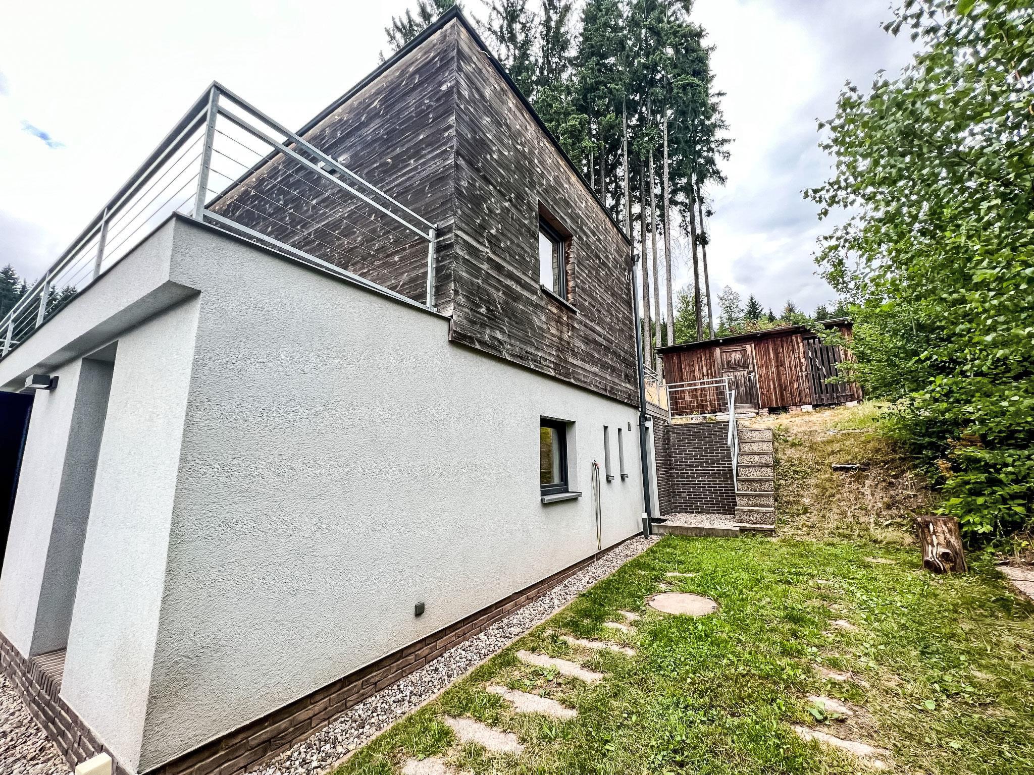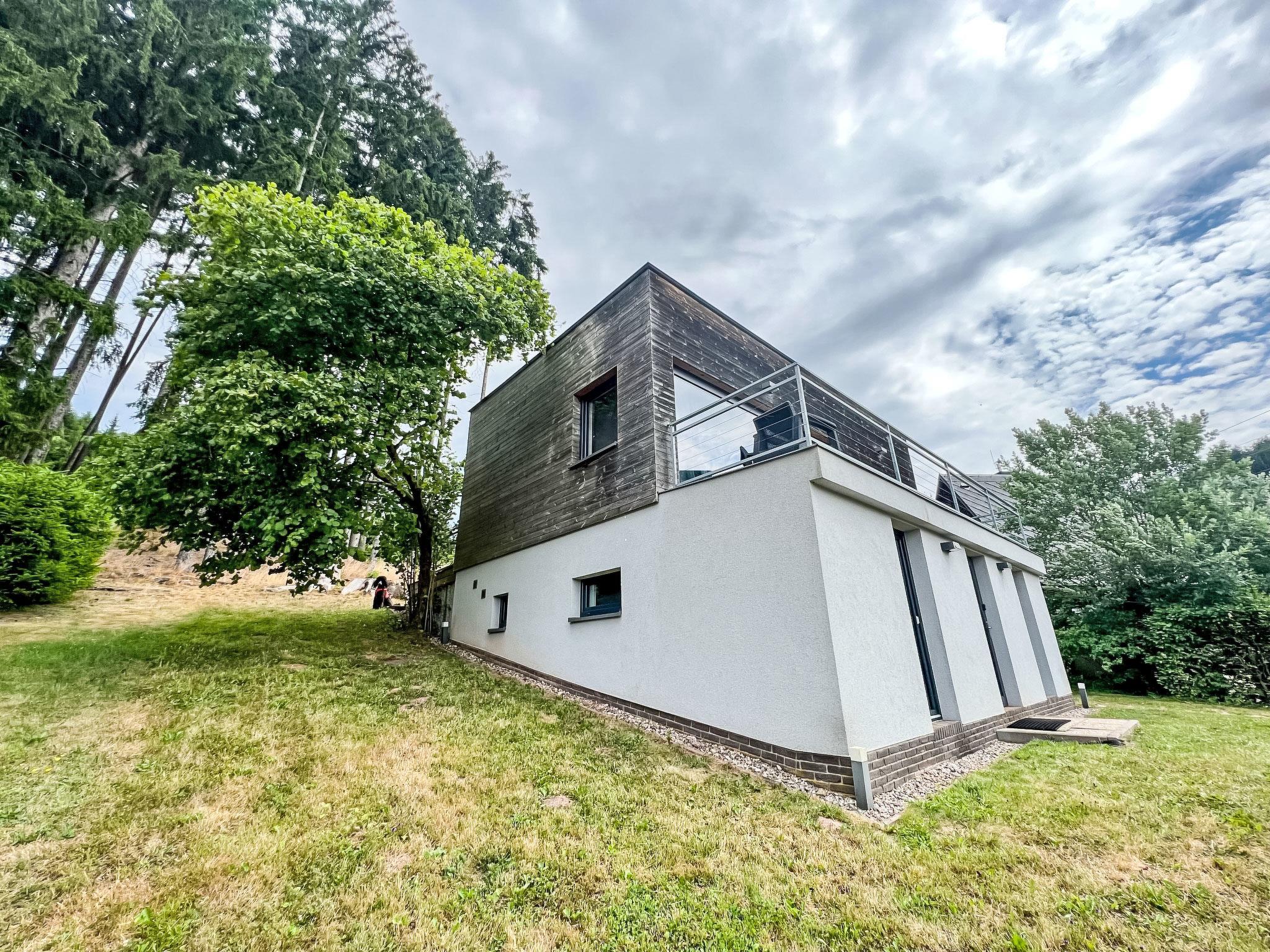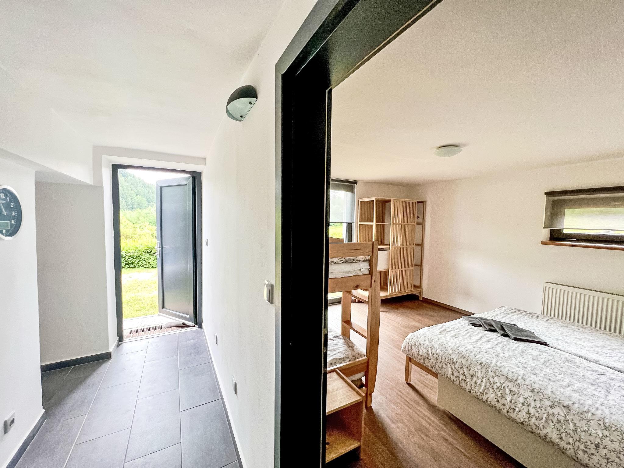 3-room chalet on 2 levels. 1 room with 1 double bed. Exit to the garden. 1 room with 1 x 2 bunk beds, 1 double bed. Exit to the garden. Shower/WC, sep. WC, Sauna. Upper floor: (steep stair) large living room with panoramic window with 1 double sofabed, Scandinavian wood stove and TV. Exit to the terrace. Kitchenette (oven, dishwasher, 4 induction hot plates, toaster, kettle, microwave, freezer, electric coffee machine) with dining table. Electric heating, wood heating. 2 terraces. Terrace furniture. Beautiful view of the countryside. Facilities: washing machine. Internet (WiFi, free). Please note: non-smoking house. Maximum 1 pet/ dog allowed.