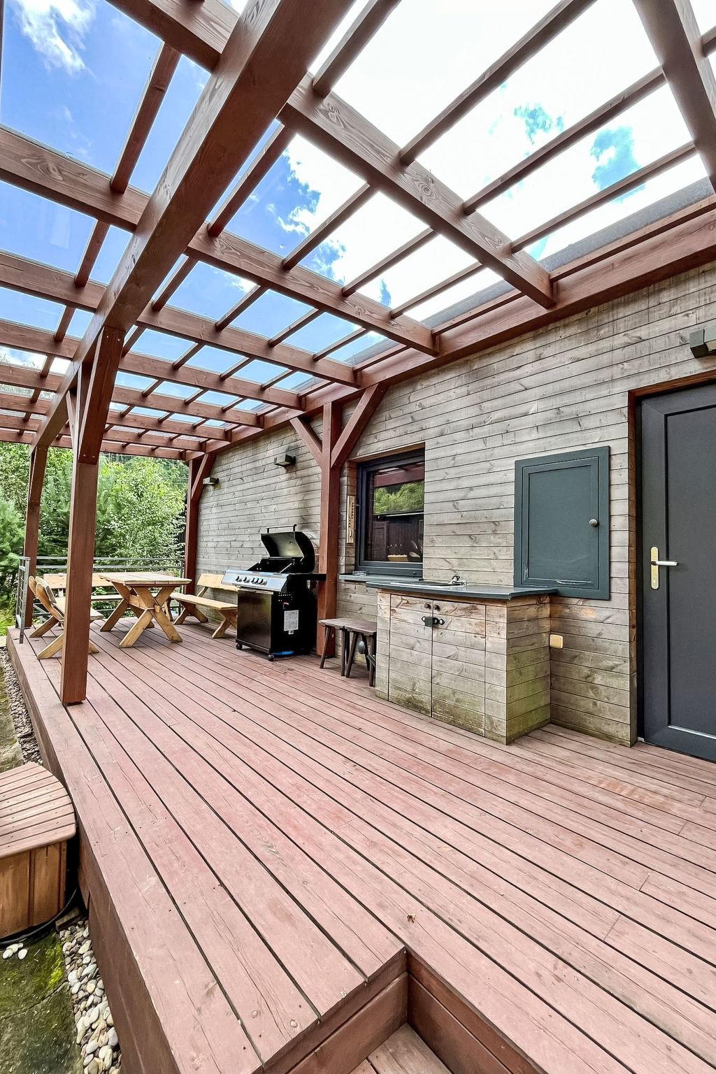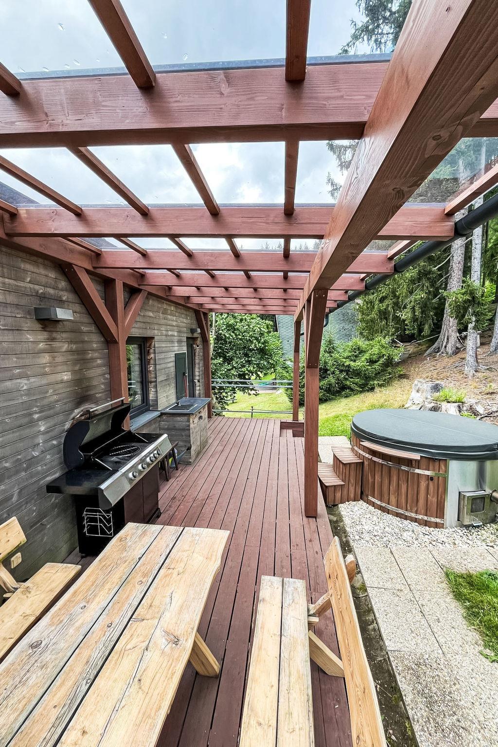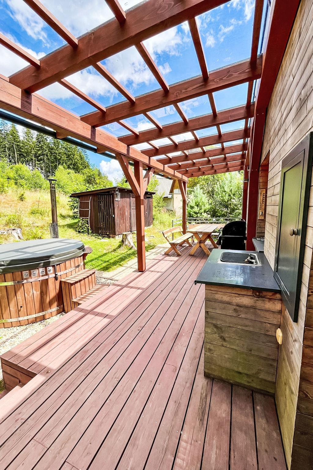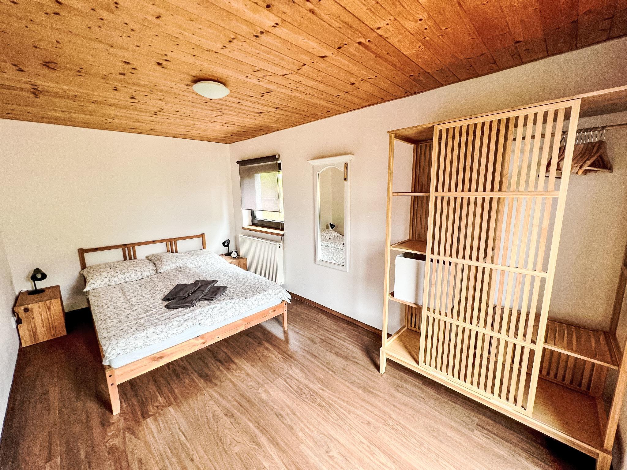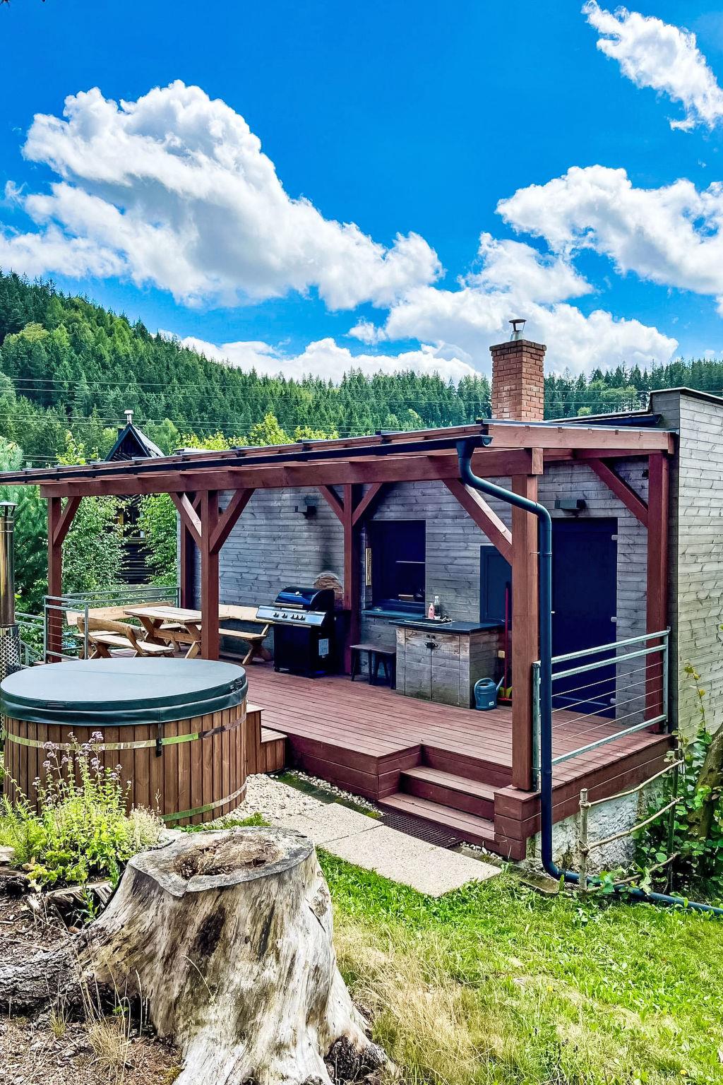 Cosy chalet "Peklo Hrádecek", 2 storeys, detached. Outside the resort, in a quiet, sunny position, along the wooded area, 7 km from the skiing area. Private: property. Hot tub, terrace, garden furniture, barbecue, fireplace. In the house: WiFi, sauna, storage room for bicycles, storage room for skis, central heating system. Parking (for 5 cars) at the house. Grocery 5 km, shopping centre 7 km, restaurant 400 m, bus stop "Vlcice" 500 m, railway station "Trutnov" 7 km, indoor swimming pool 8 km. Golf course (18 hole) 5 km, riding stable 3.5 km, walking paths from the house, cycle lane 50 m, ski rental 7 km, ski school 7 km, children's ski school 7 km, cross country ski track 500 m. Nearby attractions: Zábavní park Balduv svet, 7 km, Rozhledna Eliška, Tvrz Stachelberg 9 km, Stezka Korunami stromu Janské Lázne 15 km, Lanovka na Snežku, Pec pod Snežkou 22 km, Zoo Dvur Králové 25 km, Vyhlídkové lety Vrchlabí, Zámek Kuks 27 km. Well-known ski regions can easily be reached: Mladé Buky 7 km, Janské Lázne 13 km, Pec pod Snežkou 24 km. Hiking paths: Krkonošský národní park, CHKO Broumovsko, Adršpašsko-teplické skály.