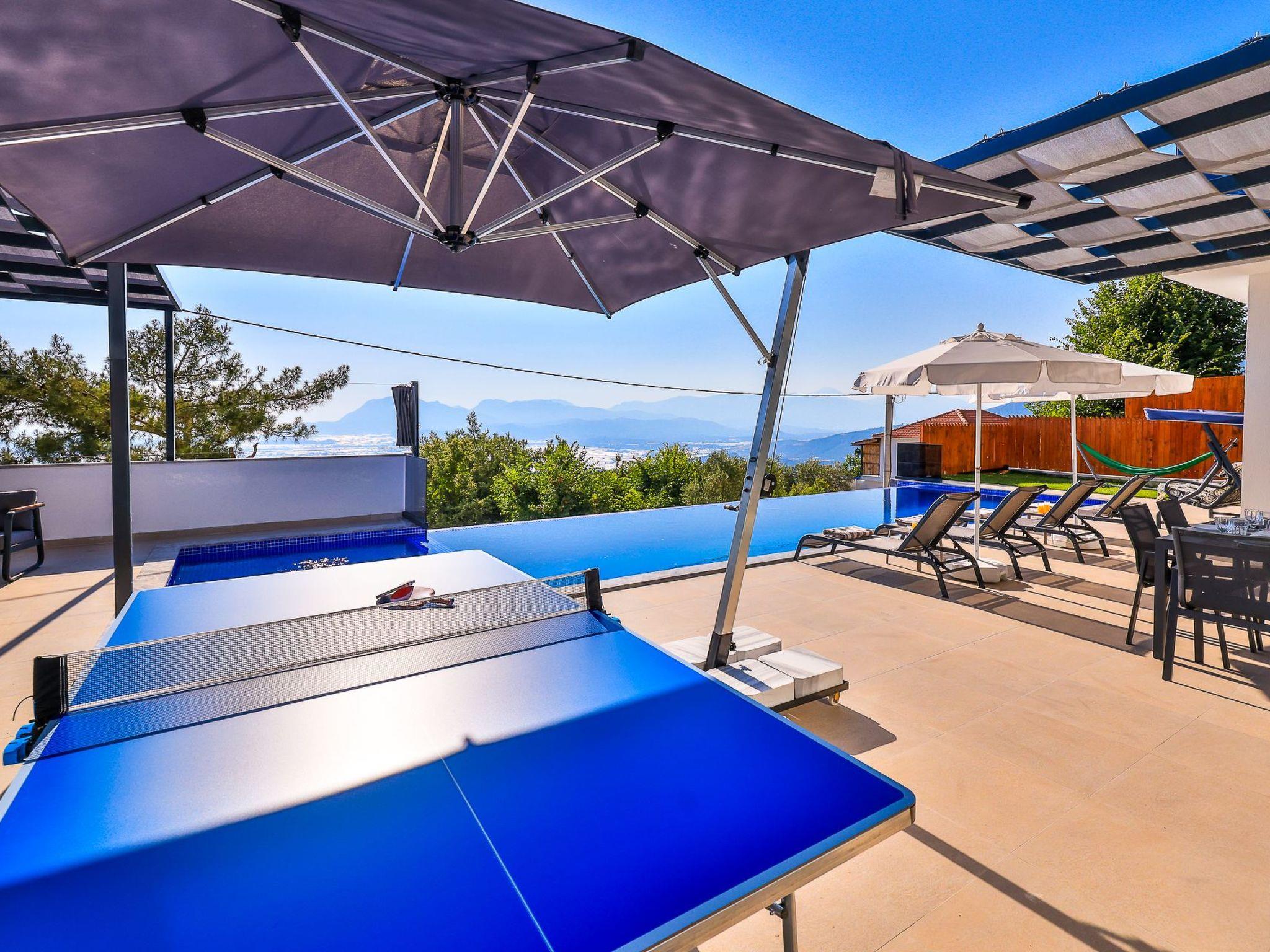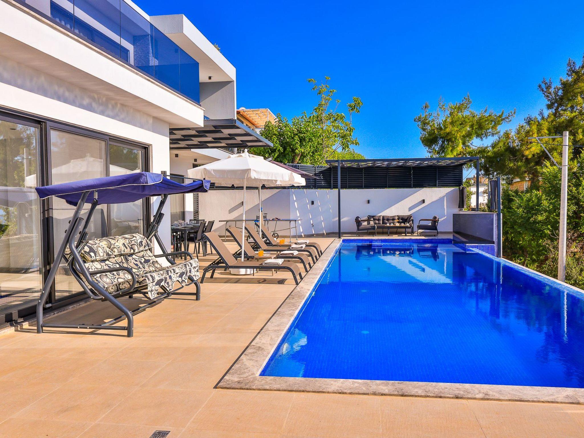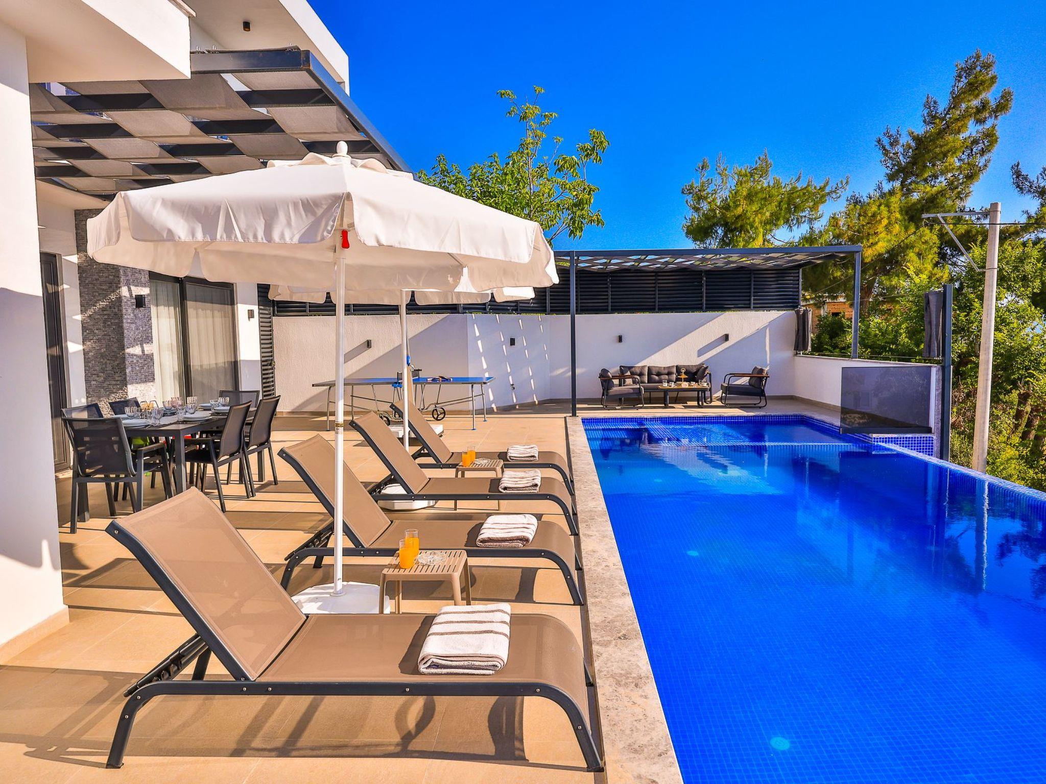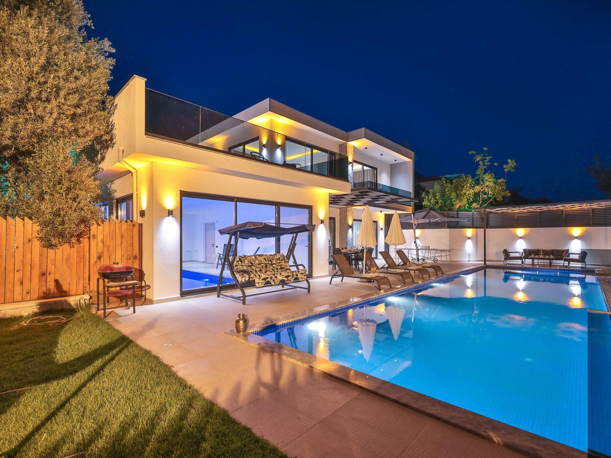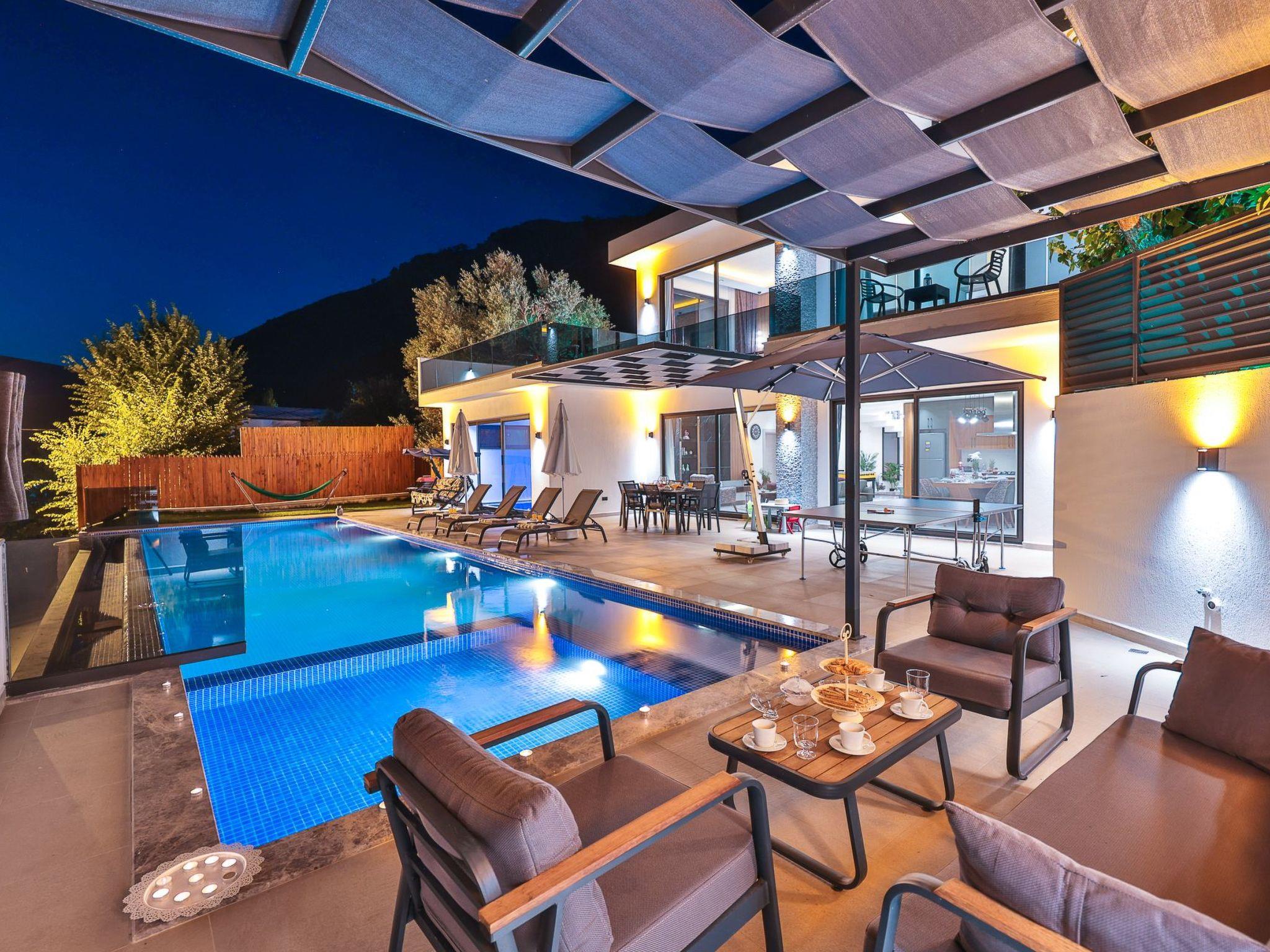 Our villa, which has a comfortable design, is ideal for large families and groups of friends. It offers amenities such as a table tennis table, table football, hammock, swing, okey, backgammon to guarantee an enjoyable holiday. The villa is located in Üzümlü village and has a private pool with a fully screened small garden.