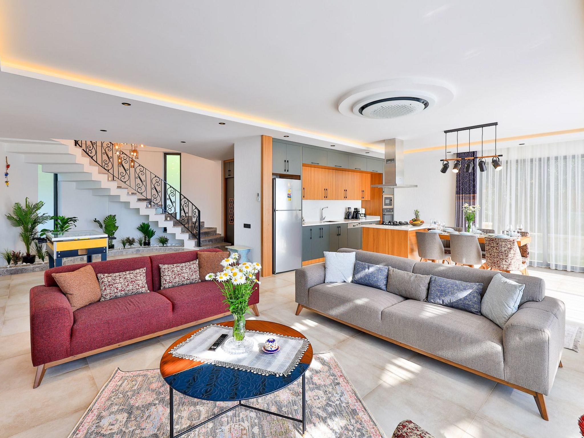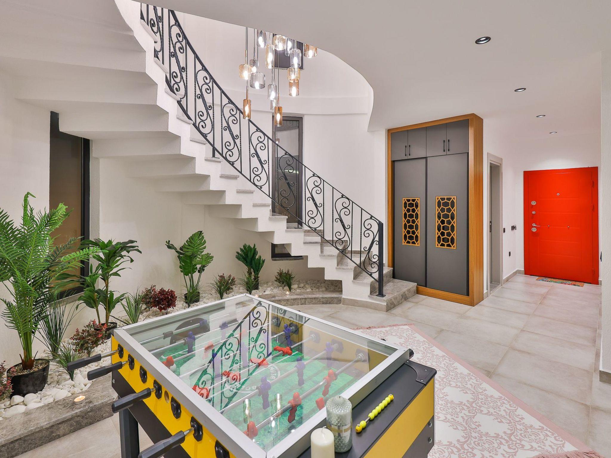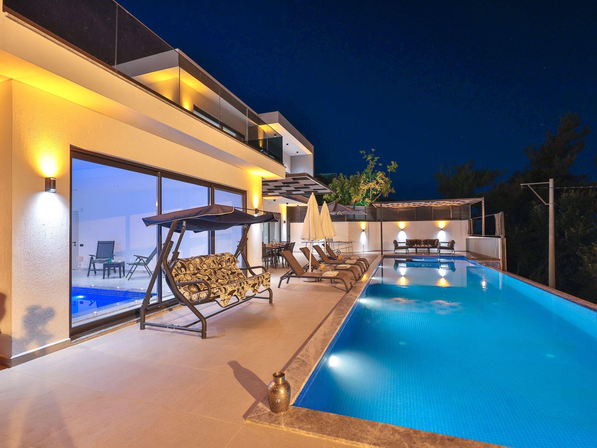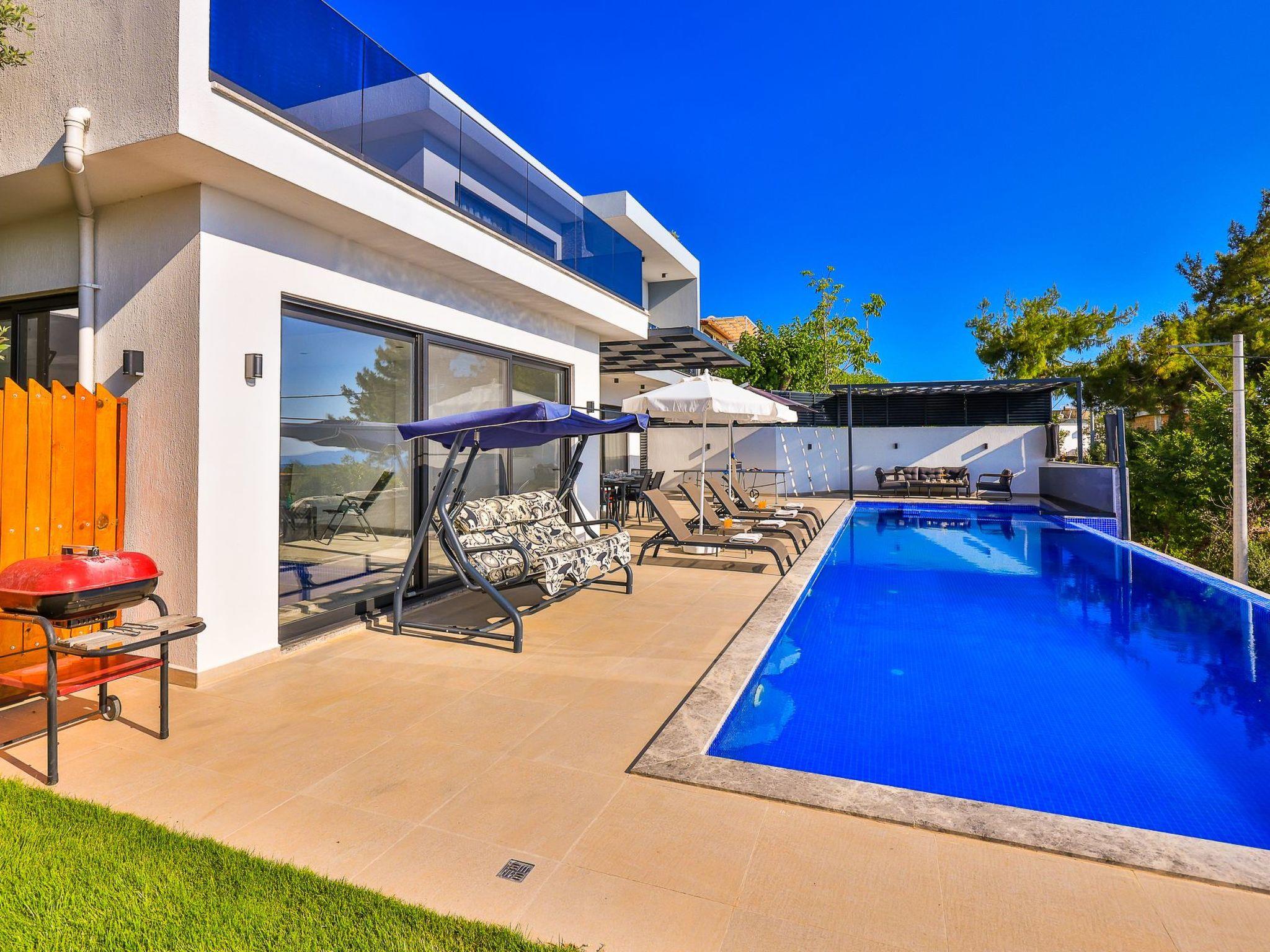Our villa, which has a comfortable design, is ideal for large families and groups of friends. It offers amenities such as a table tennis table, table football, hammock, swing, okey, backgammon to guarantee an enjoyable holiday. The villa is located in Üzümlü village and has a private pool with a fully screened small garden.