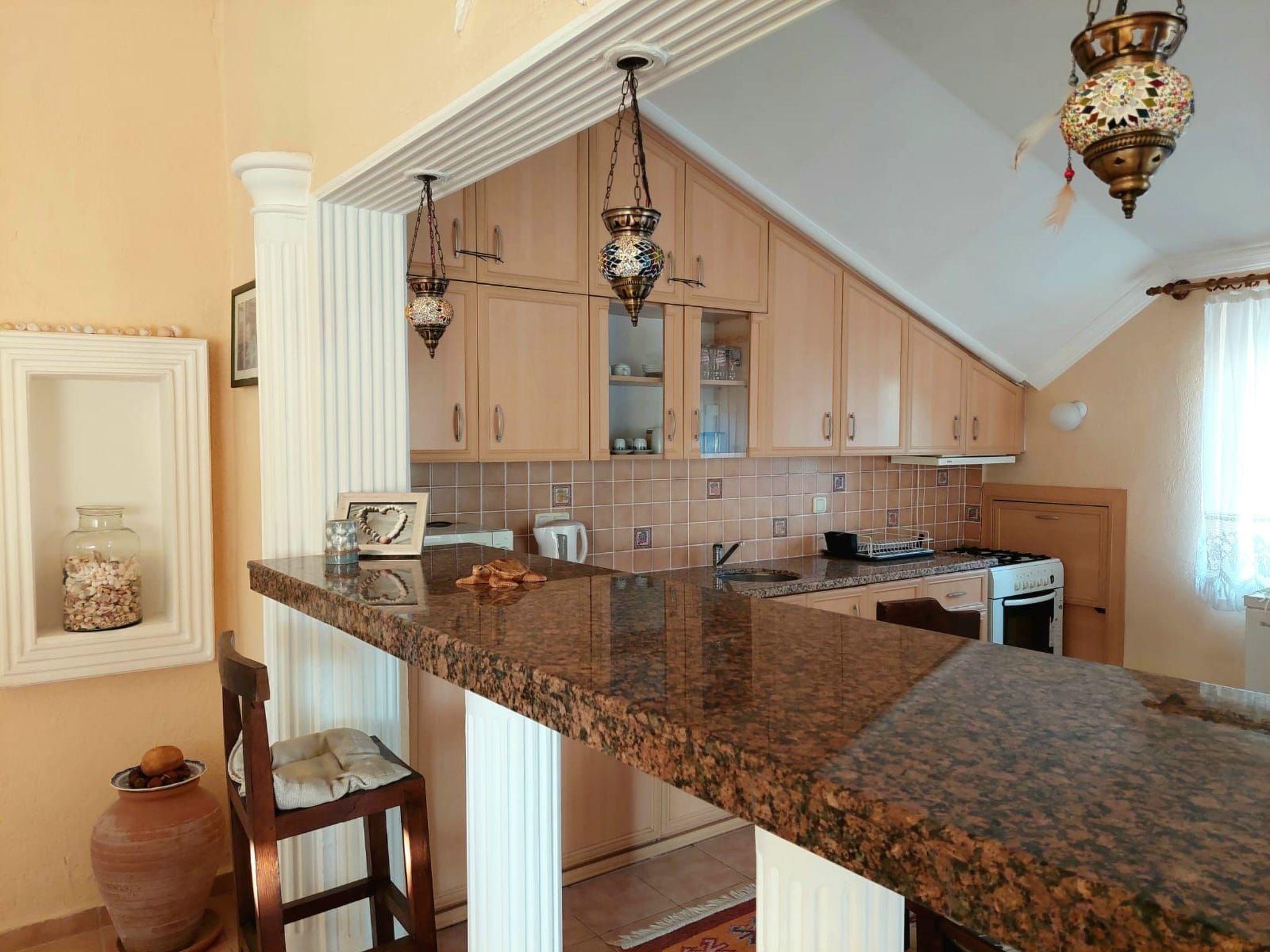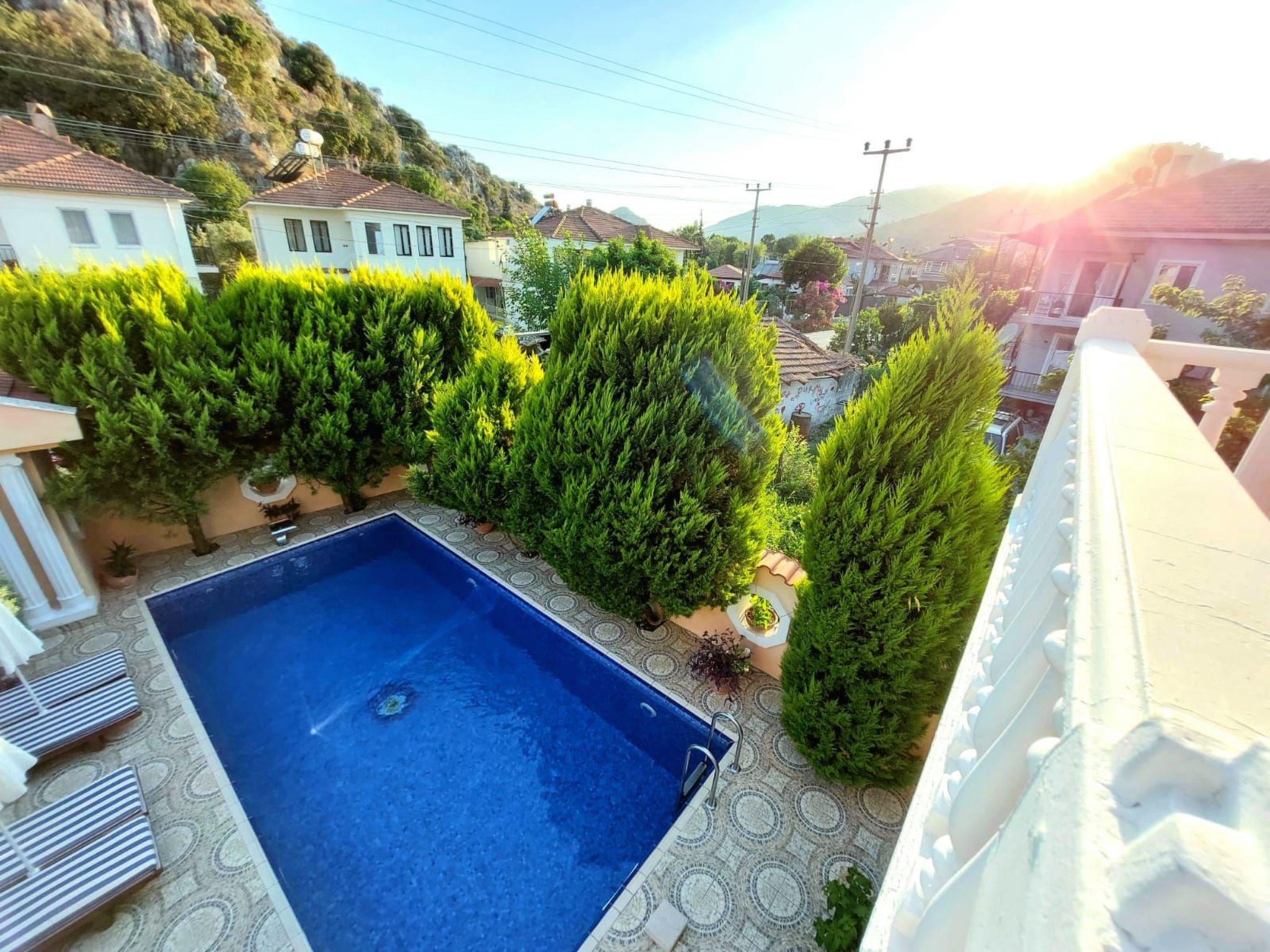 Suitable for elderly people with mobility issues but not having a wheel chair access.Smoking is not allowed in the propertyNo pets allowedSelf-cateringCheck In : 16:00 (onwards)Check Out : 10:00 (latest)Facilities:General: Air conditioning in every room. CD/DVD player in the lounges.Standard Utilities: Gas Hob and Electric Oven, Microwave, Fridge/Freezer, Dishwasher, Washing Machine, Kettle, Toaster, IronRooms: 5 Bedrooms (2 of them en-suite), 2 shared family bathroomsOther: Linen provided, we provide towels for bathroom and swimming, to save your suitcase space.Parking: Permitted on the road parking spaces.Outdoors: The garden is well maintained with mature shrubs and flowers, also green lawn on the outdoor sitting and BBQ area. Salt system 36sqm private pool and sun terrace.Further details:If you want to travel around the area by a car or scooter, it is easy to arrange and very cheap. We also have the local Saturday market in town on each weekend within minutes from the villa. Transfers can also be arranged.Distances:•Dalaman International Airport: 25km.