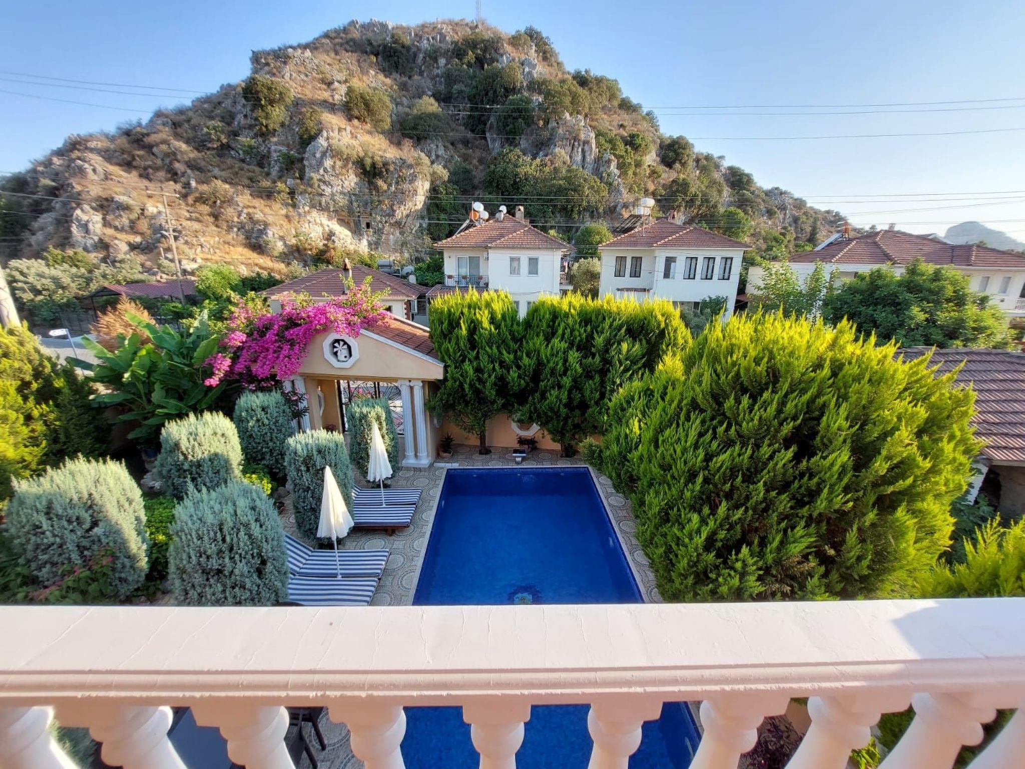 SELF CATERING HOLIDAY VILLA FOR RENT IN DALYANVilla | 5 bedrooms | 4 Bathroom |Sleeps 11+2This modern 5-bedrooms private villa with private pool built in one of the most beautiful areas of south west Turkey called Dalyan, that is famous with its three thousand years old Lycian Rock Tombs, Caretta Caretta Iztuzu Beach, Dalyan River, Mud Baths, Sultaniye Hot Springs and many other attractions. Dalyan is set on the winding Dalyan River that flows between the Mediterranean Sea and Lake Koycegiz.This villa which is fitted out to the highest standards, is set in a quiet residential area of Dalyan and only a 5 minutes walk to the town centre that is surrounded with variety of shops and riverside restaurants to suit every taste.This five bedroom villa is individually furnished to a very high standard as all modern amenities including air conditioning in every room, marble floors, and well refurbished new bathrooms. Kitchen is fully equipped with fridge freezer, washing machine, dishwasher, oven and hob, electric kettle and toaster. This villa has the opportunity of viewing the world famous Lycian Rock Tombs and mountains from the balconies.This cosy villa is set on 500sqm private land on the Iztuzu Beach road surrounded by the walls, lemon/spruces pines, and begonvilles for increasing your privacy. Villa’s private 36sqm natural salt system swimming pool with 1,65mt deep is set on the left side of the garden as you walk into the villa. This pool has spacious area for outdoor shower and sun loungers to enjoy the sunshine. The other side of the garden which is also surrounded by plants and tree varieties has the outdoor sitting and dining area with BBQ.As you walk into the villa;Ground Floor: There is a spacious open plan kitchen and living room which has 2 sofas both for three and 2 armchairs having access to a big balcony with Lycian Rock Tomb view. There are 3 bedrooms on this floor. First bedroom has 3 single beds and a TV hang on the wall. This room also has access to a spacious balcony overlooking to the pool. Second bedroom is en-suite with a big size double bed. The third bedroom has 2 single beds which is also en-suite. There is also one shared big family bathroom on this floor. All bedrooms have wardrobes and armchairs.The independent indoor marble stairs leads you upstairs to the separate access door of the first floor.First Floor: Open plan kitchen and living room that is half separated by a marble breakfast bar stand. This fresh and light full living area has a decorative fire place with otantic accessories, TV unit, 2 sofas and 2 arm chairs. Both kitchen and living room have access to their own the spacious terraces with Rock Tomb and mountain views. There are 2 bedrooms and a shared big size family bathroom which has shower, bath and toilet on this floor. First bedroom has 2 single beds. Second bedroom has a big size double bed. Both bedrooms have wardrobes, armchairs and balcony access.Max. Capacity: 13 Pax. Our rates includes 11 Pax. (+2 Pax with no age difference can sleep with an additional price.)Will consider: Minimum 5 night stays or longer staysNotes: