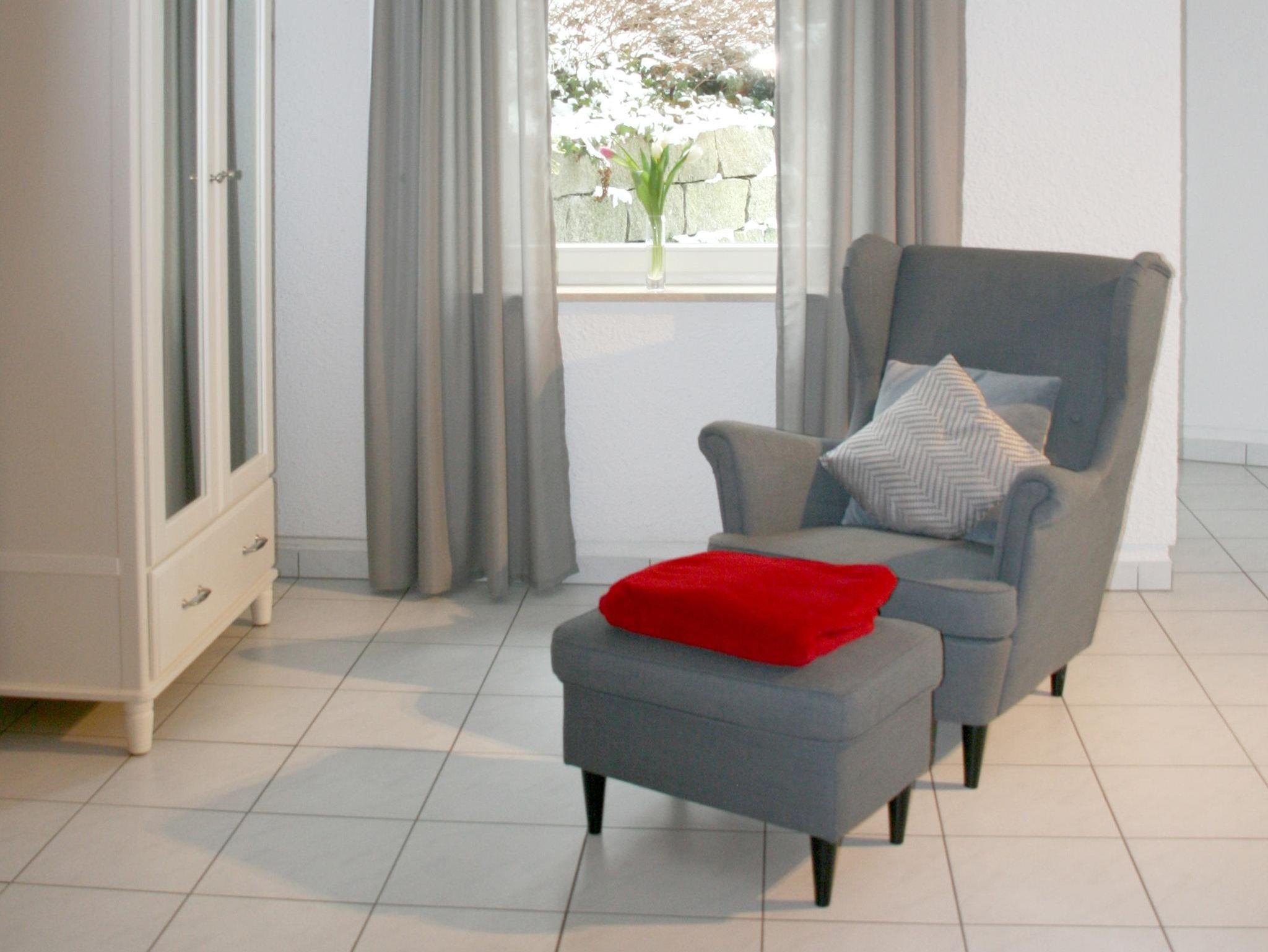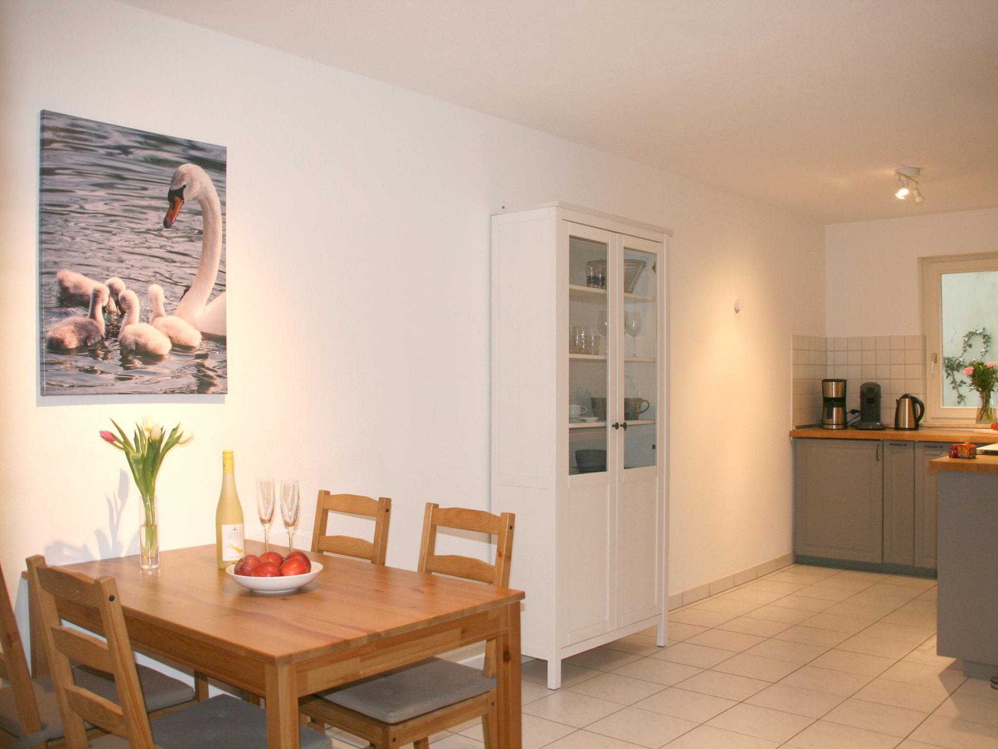 Die 62 Quadratmeter große Ferienwohnung ist stilvoll modern und gemütlich eingerichtet. Die Wohnung verfügt über ein Badezimmer und einen offenen Wohn- Schlaf- und Essbereich mit einer großzügigen offenen Küche, in der Sie Ihrer Kreativität freien Lauf lassen können. Die Küchenzeile ist mit Backofen, Ceranfeld (4 Platten), Spülmaschine, Spüle, Kühlschrank mit Gefrierfach, Kaffeemaschine, Wasserkocher, Toaster und Geschirr voll ausgestattet. Das offene Wohn- und Schlafzimmer verfügt über ein Doppelbett und ein Sofa sowie TV. So bietet sich genügend Platz für zwei erwachsene Personen. Das Badezimmer verfügt über Dusche, Waschbecken, WC und Föhn. Bettwäsche und Handtücher sind vorhanden und inklusive. Die im Erdgeschoss liegende Ferienwohnung verfügt außerdem über einen direkten Zugang über die überdachte Terrasse zu einem kleinen Gartenanteil. Hier können Sie an Sommerabenden grillen und beispielsweise einen der vielen regionalen Weine kosten. Auf der Terrasse sind Gartenmöbel für 2 Personen vorhanden.