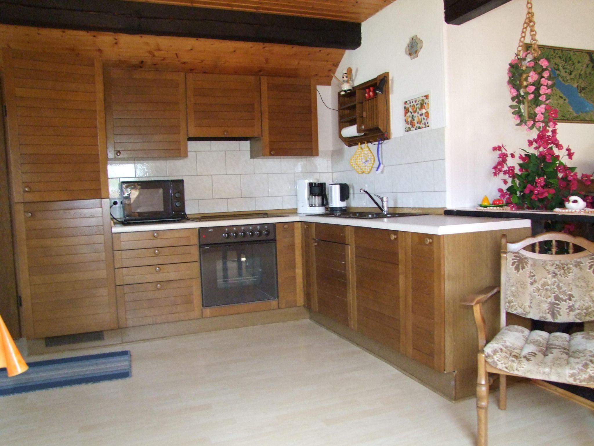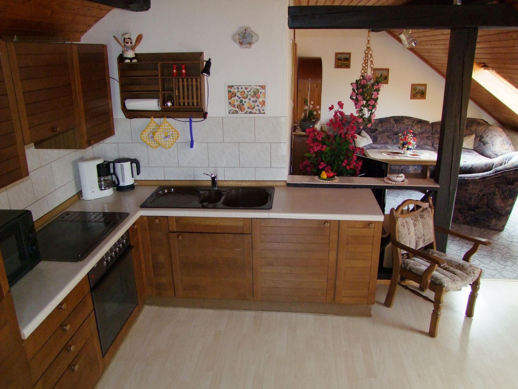 Die gemütliche Ferienwohnung im Dachgeschoss bietet Platz für bis zu drei Personen und verfügt über einen Balkon, der zum Verweilen einlädt. Sie umfasst ein kombiniertes Wohn- und Esszimmer mit integrierter Einbauküche, ein separates Schlafzimmer sowie ein Badezimmer mit Dusche und WC. Die Küche ist mit allem ausgestattet, was Sie für einen angenehmen Aufenthalt benötigen, darunter Kaffeemaschine, Wasserkocher, Toaster, Eierkocher und weitere nützliche Küchenutensilien.