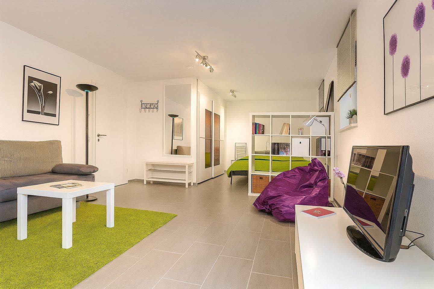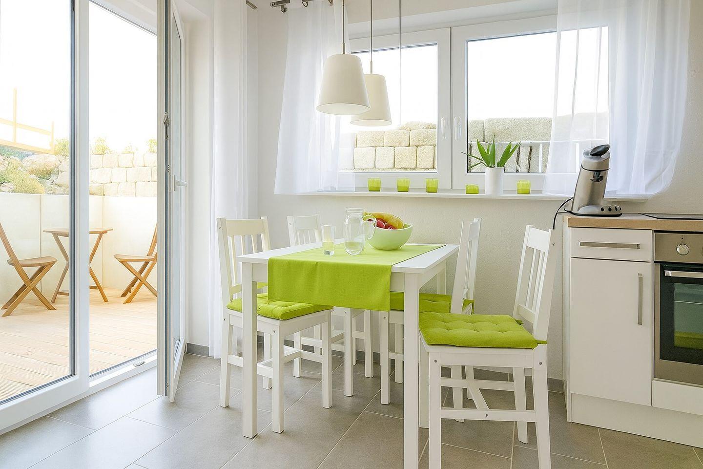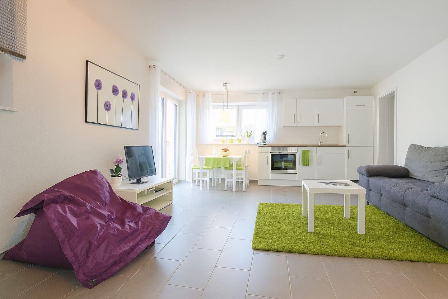 Die Wohnung ist mit hellen Möbeln eingerichtet und bietet höchsten Komfort. Der Schlafbereich mit einem 1,60m x 2,00m Doppelbett ist optisch vom Wohn-Essbereich getrennt. Eine eigene 9m² große Terrasse lädt zum ungestörten Verweilen ein. Die Küchenzeile enthält neben der üblichen Ausstattung eine Pad-Kaffeemaschine. Im Tageslichtbad steht ein Fön zur Verfügung, und im Wohnbereich finden Sie einen Fernseher mit DVD-Player. Auf Wunsch haben Sie kostenlosen Zugriff auf WLAN. Bei Bedarf können ein Kinderbett und ein Hochstuhl bereitgestellt werden. Die gesamte Ferienwohnung ist mit Fußbodenheizung ausgestattet.
