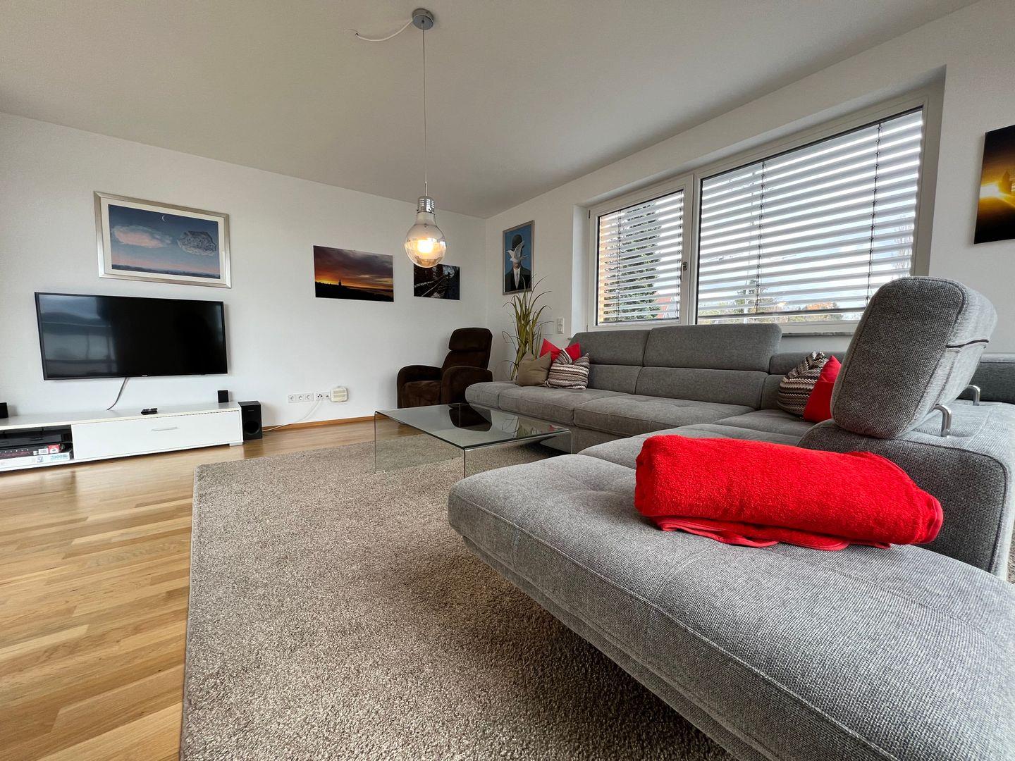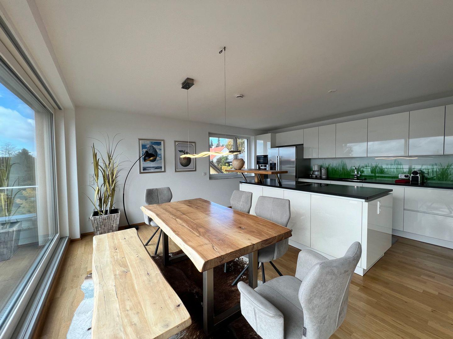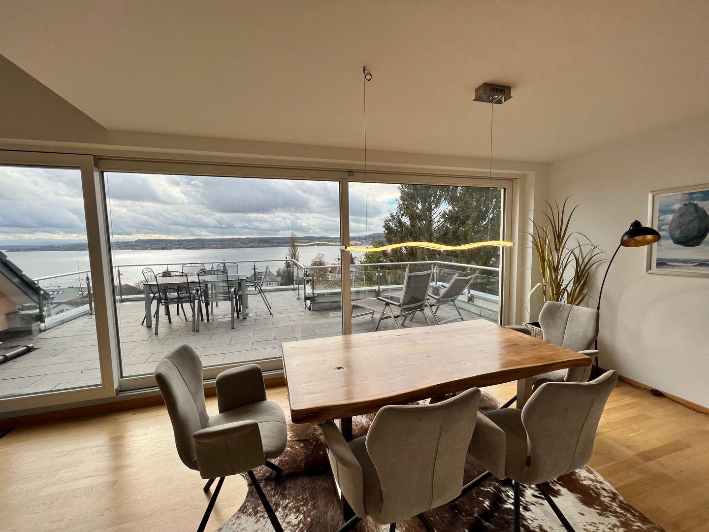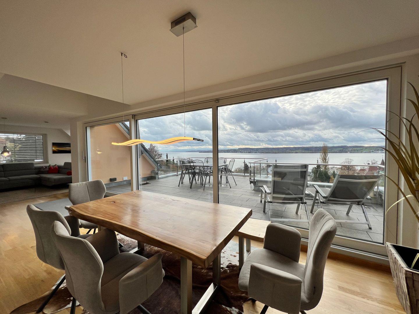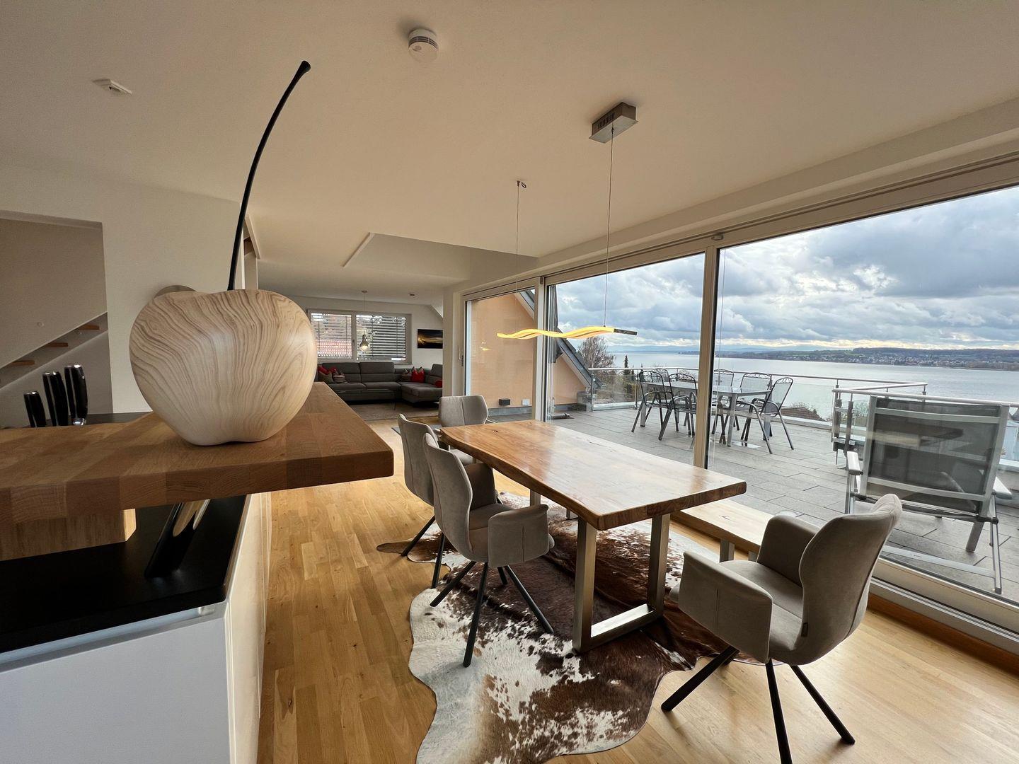 Skyline präsentiert eine elegante Design-Ausstattung auf zwei Ebenen. Hochwertige Materialien und moderne Möbel schaffen ein exklusives Wohnerlebnis. Die großzügige Dachterrasse bietet einen traumhaften Blick auf den Bodensee. Modernes Outdoor-Mobiliar lädt zu geselligen Abenden im Freien ein.