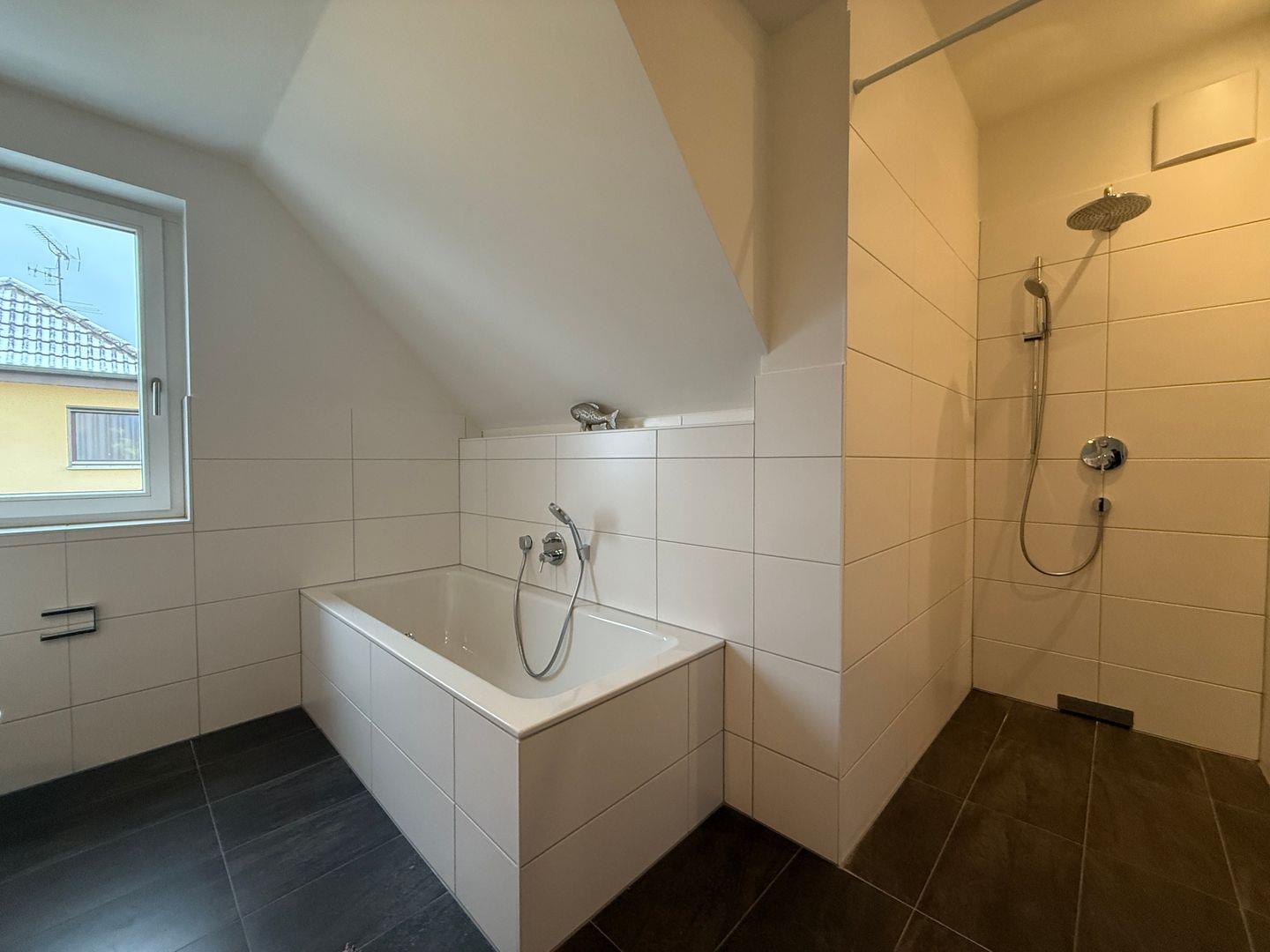 Im modernen Naturstein-Badezimmer finden Sie eine großzügige, bodenebene Regendusche, eine entspannende Badewanne, einen beleuchteten Waschtisch mit Ablagefläche sowie ein WC. Ein zusätzliches, separates Gäste-WC erhöht den Komfort.