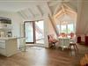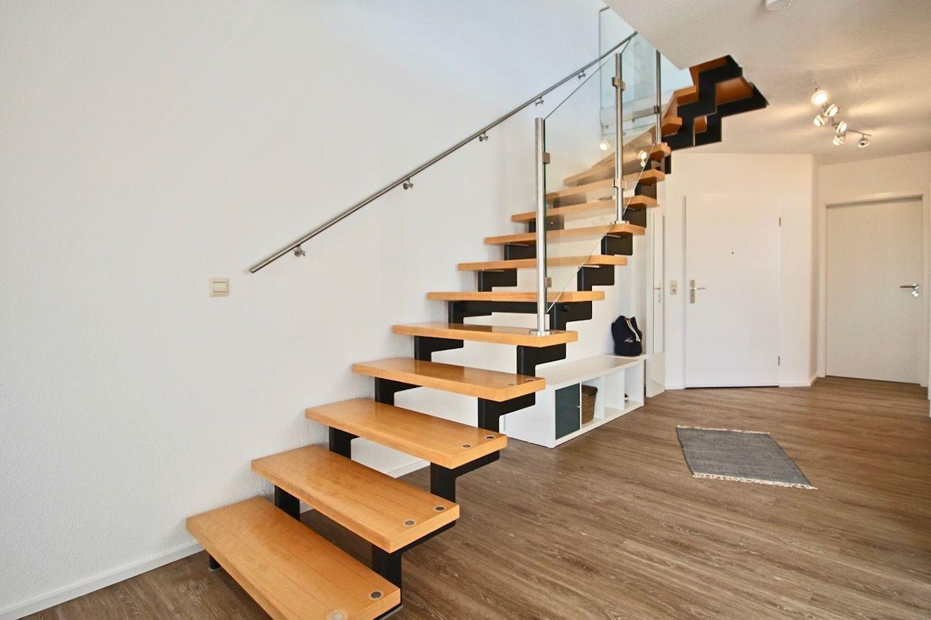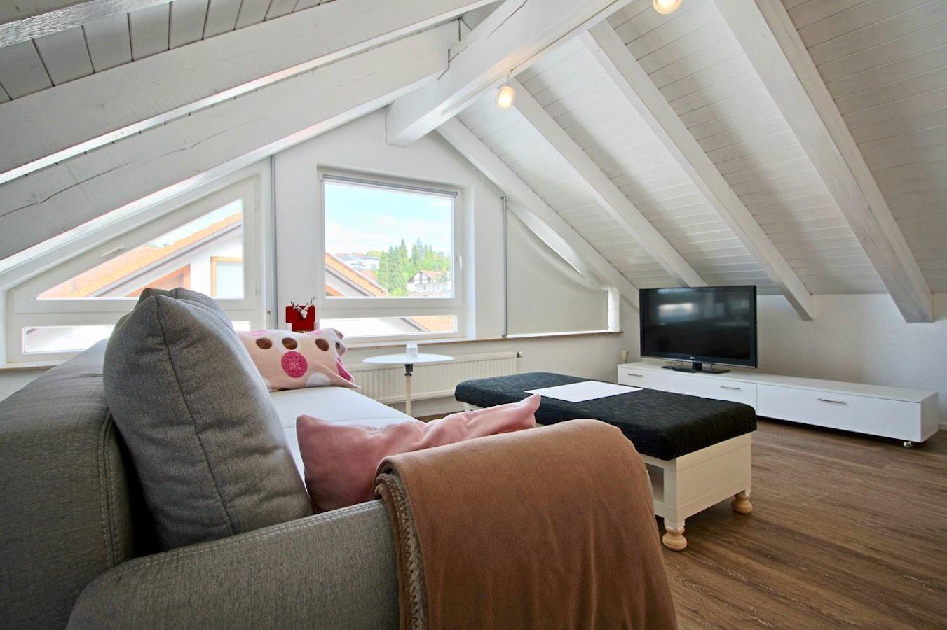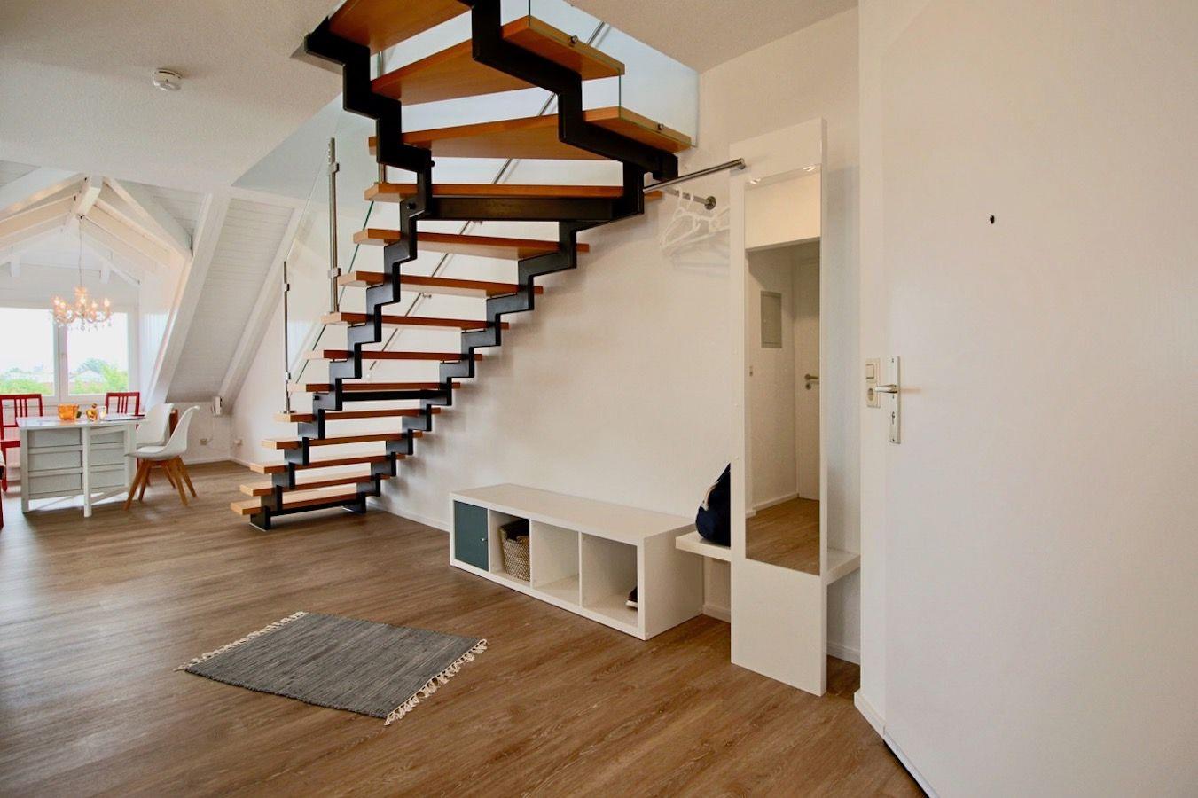 Die moderne Maisonette-Ferienwohnung erstreckt sich über zwei Etagen, bietet 78 Quadratmeter Wohnfläche und ist ideal für 2-4 Personen. Die offene Raumgestaltung verleiht der Wohnung eine helle Atmosphäre. Im unteren Bereich erwartet Sie ein moderner Wohnraum mit einer voll ausgestatteten Hochglanz-Küche, einem Küchentresen und hochwertigen Küchengeräten. Der Essplatz für 6 Personen lädt zu geselligen Mahlzeiten ein. Vom Wohnraum aus gelangen Sie auf den privaten Balkon mit herrlichem Bergblick. Eine offene Treppe führt Sie in das Obergeschoss.