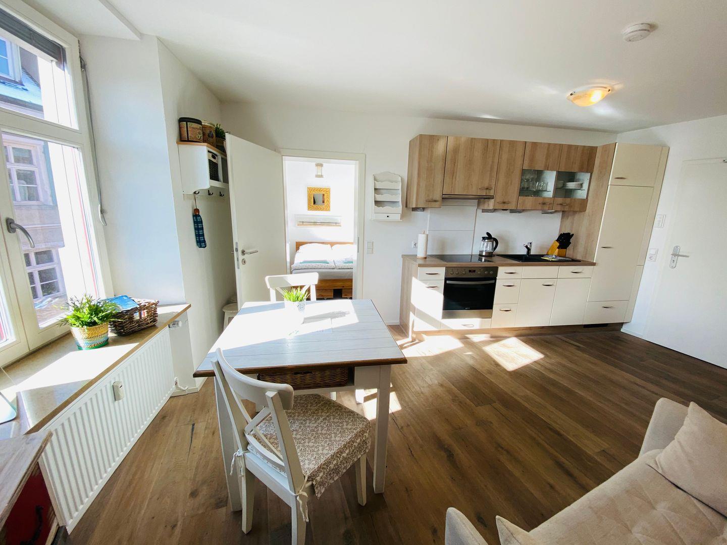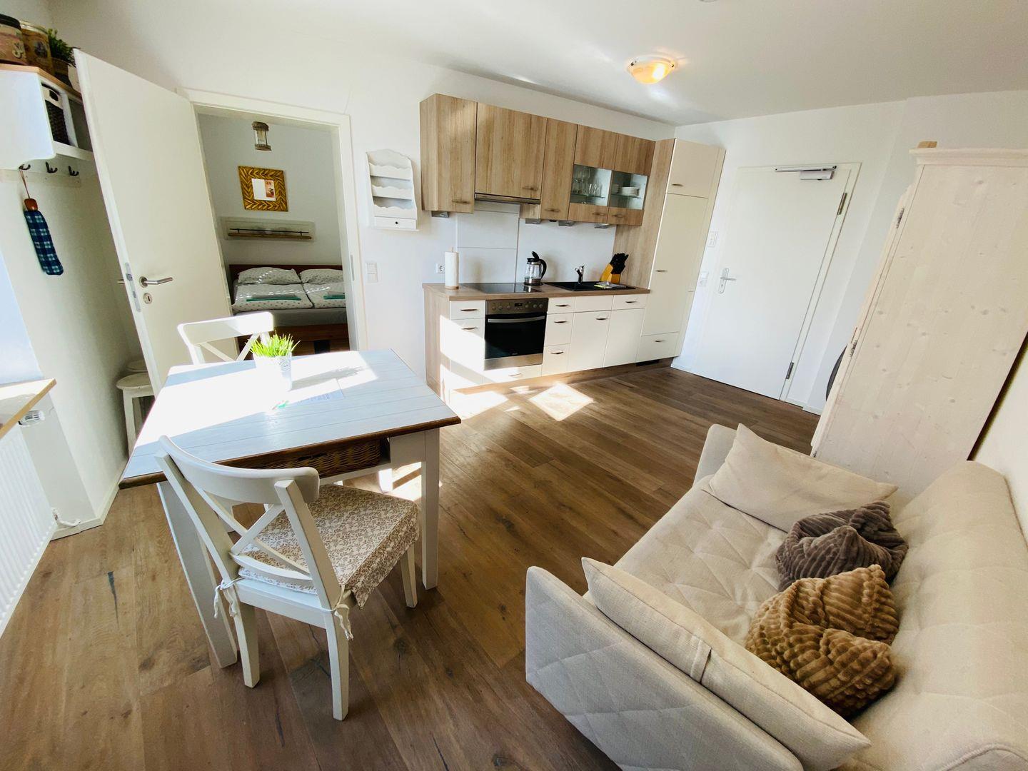 Der offene Wohn- und Essraum zeigt, wie kleine Räume und Wohnkomfort ideal harmonieren können. Der Wohnraum ist mit ausziehbaren Polstermöbeln, einem Essplatz und einer vollständig ausgestatteten modernen Küchenzeile ausgestattet. Die Einbauküche verfügt über eine Tassimo-Kaffeemaschine mit Pads, Wasserkocher, Toaster, Smoothie-Mixer, Spülmaschine, Backofen und einen Kühlschrank mit Eisfach.