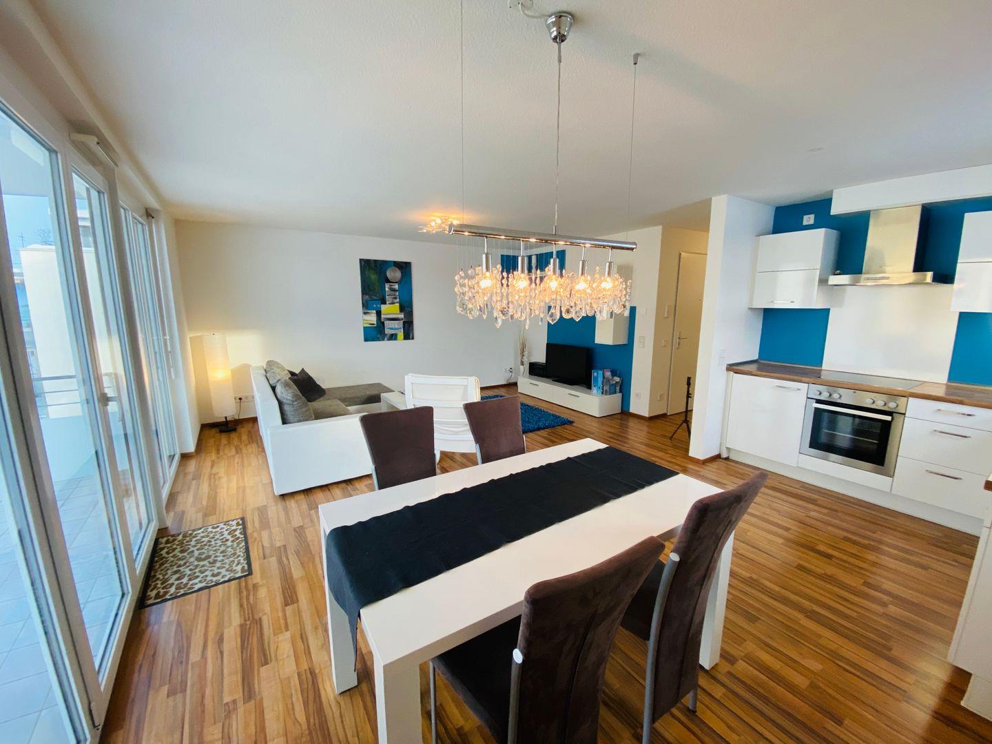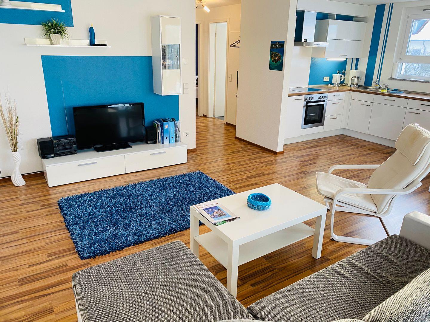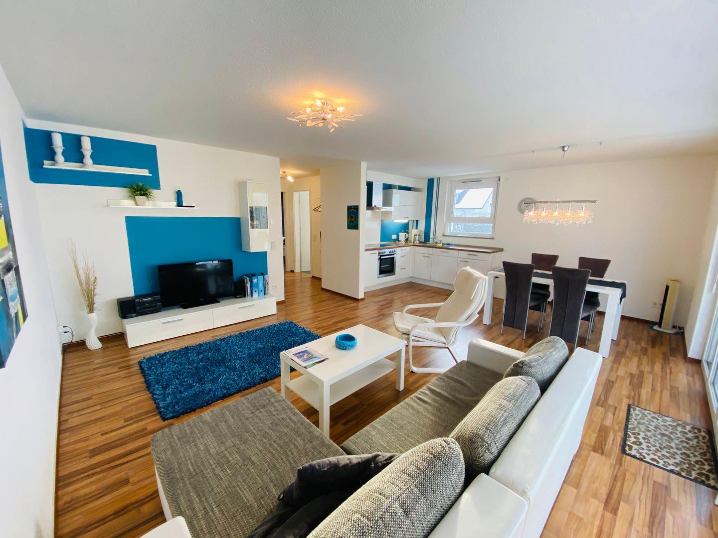 Die Ferienwohnung überzeugt durch ihre zentrale Lage sowie ihre hochwertige Ausstattung. Der Wohnbereich ist offen gestaltet und lädt zum Verweilen ein. Hier finden Sie eine voll ausgestattete Küchenzeile, die mit allem Nötigen für die Zubereitung von Mahlzeiten ausgestattet ist. Der Essplatz bietet Platz für bis zu vier Personen. Die Wohnlandschaft im Wohnzimmer kann bei Bedarf als zusätzliche Schlafmöglichkeit genutzt werden. Eine moderne Wohnwand mit TV rundet das gemütliche Ambiente ab. Vom Wohnzimmer aus gelangen Sie auf den Balkon, der mit einer Tischgruppe ausgestattet ist.