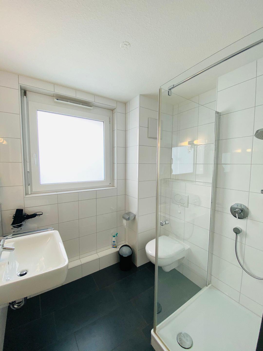 Das Schlafzimmer verfügt über ein komfortables Doppelbett und einen großzügigen Kleiderschrank, der ausreichend Stauraum bietet. Das Badezimmer präsentiert sich in modernem Design und ist mit einer Dusche, WC und Waschbecken ausgestattet.