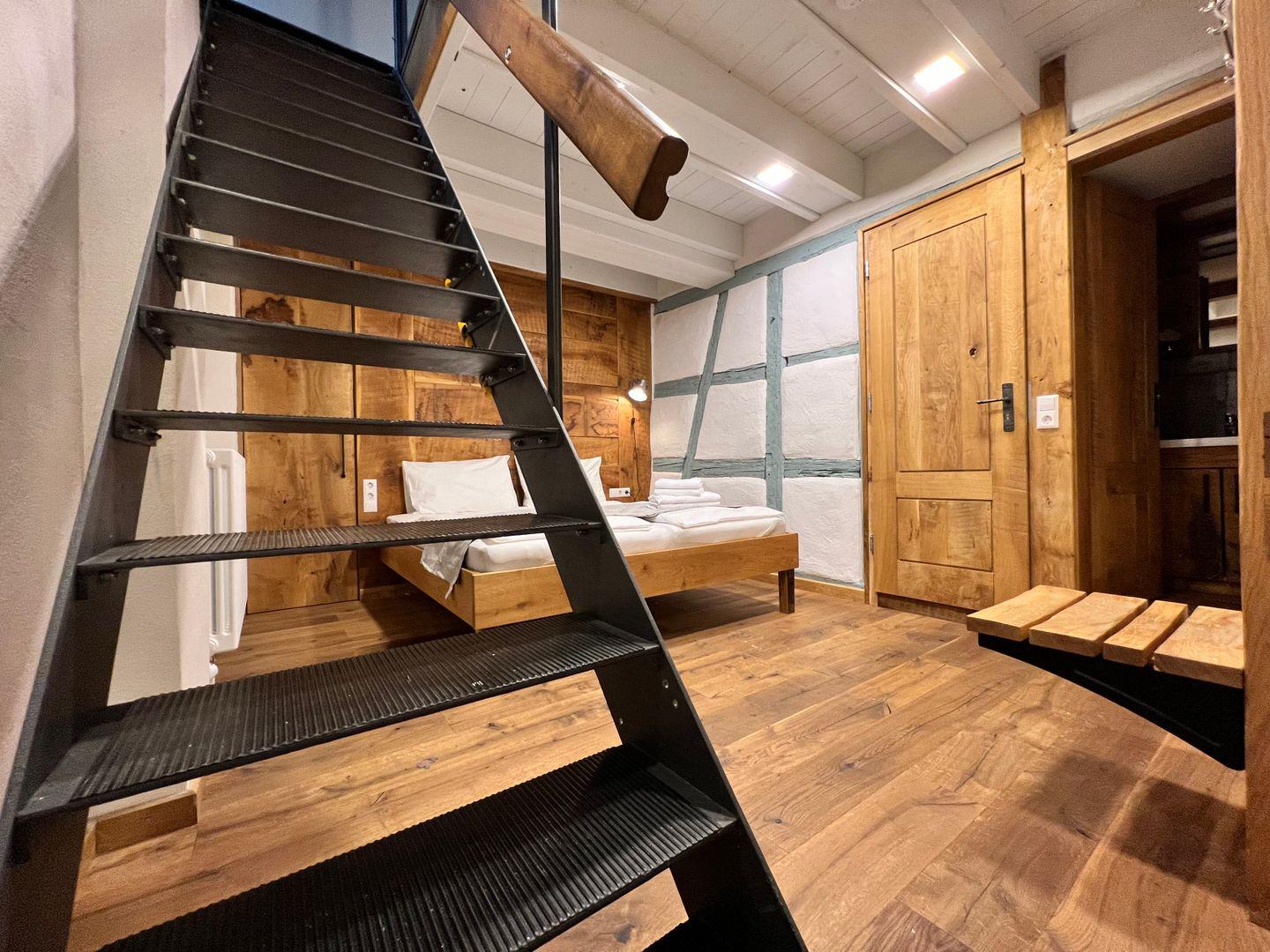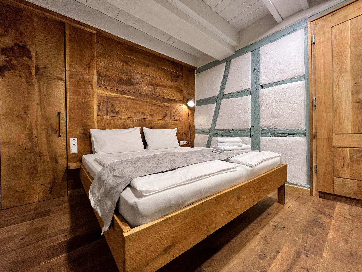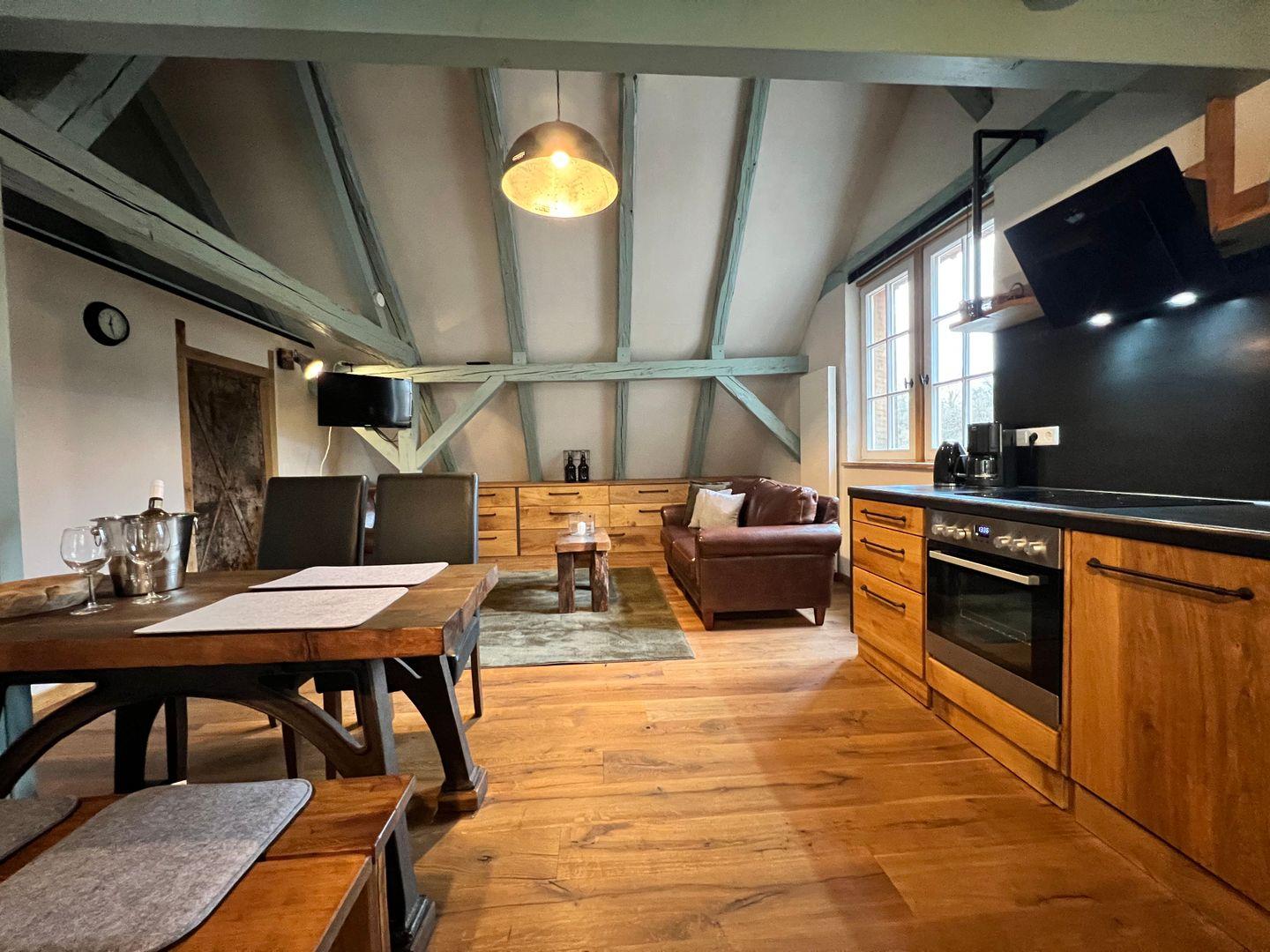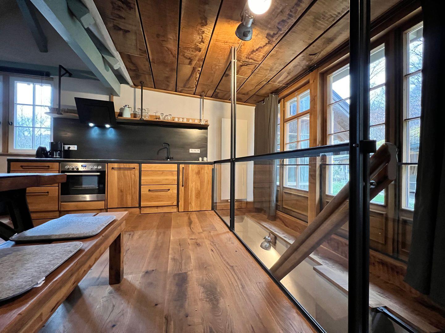 Beim Betreten der Ferienwohnung erwartet Sie ein Schlafzimmer, das von einem erfahrenen Tischler gestaltet wurde. Das Herzstück des Schlafzimmers ist ein handgefertigtes Doppelbett, das mit seinen Maßen von 180x200 cm puren Schlafkomfort verspricht. Hinter dem Doppelbett verbirgt sich eine großzügige, begehbare Garderobe. Hier findet Sie reichlich Platz, um Ihre Kleidung und persönlichen Gegenstände zu verstauen. In der zweiten Etage erwartet Sie ein geräumiger und einladender Wohn- und Essbereich. Hier finden Sie hohe Decken mit markanten Holzbalken, die dem Raum eine rustikale Eleganz verleihen. Die offene Gestaltung dieses Bereichs umfasst einen Esstisch für vier Personen, eine Küchenzeile, eine gemütliche Couch mit einem bequemen Sessel, einen Flachbildfernseher sowie eine schreinergefertigte Kommode mit integriertem Schrankbett (Liegefläche 90x200 cm). In der Ferienwohnung erwartet Sie eine maßgefertigte Küchenzeile, die keine Wünsche offen lässt. Sie ist vollständig und hochwertig ausgestattet, um euch ein komfortables Selbstversorgererlebnis zu bieten.