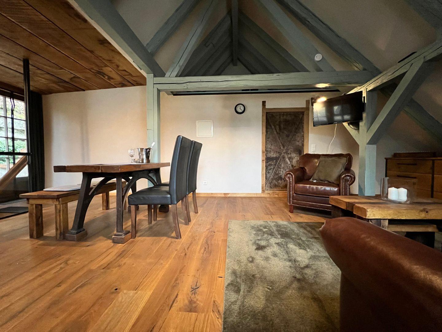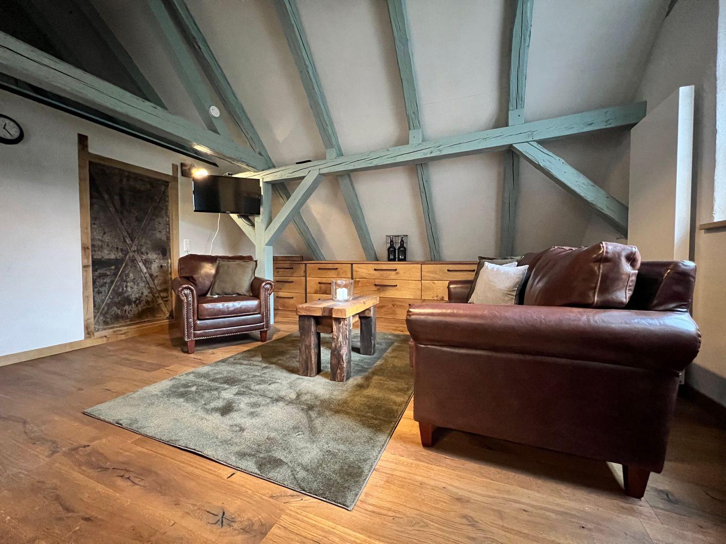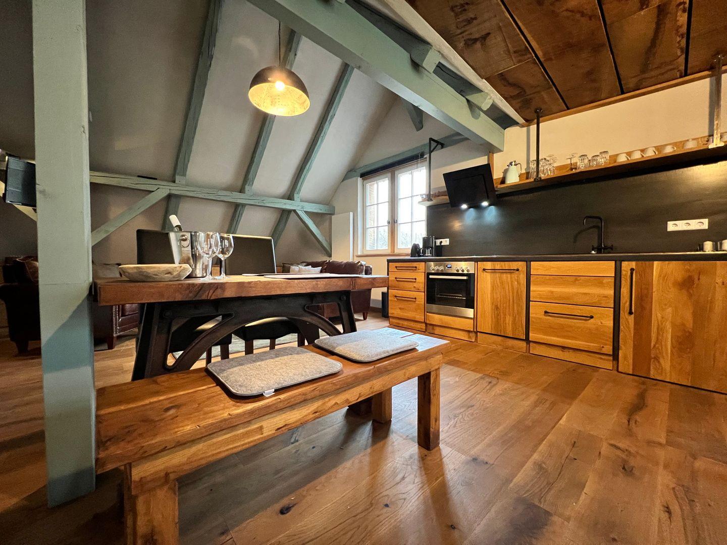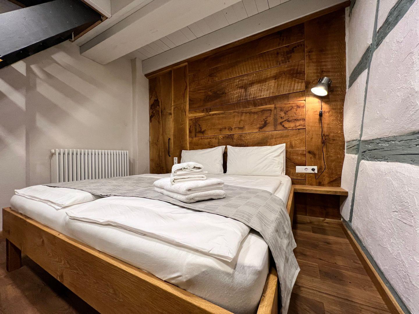 Beim Betreten der Ferienwohnung erwartet Sie ein Schlafzimmer, das von einem erfahrenen Tischler gestaltet wurde. Das Herzstück des Schlafzimmers ist ein handgefertigtes Doppelbett, das mit seinen Maßen von 180x200 cm puren Schlafkomfort verspricht. Hinter dem Doppelbett verbirgt sich eine großzügige, begehbare Garderobe. Hier findet Sie reichlich Platz, um Ihre Kleidung und persönlichen Gegenstände zu verstauen. In der zweiten Etage erwartet Sie ein geräumiger und einladender Wohn- und Essbereich. Hier finden Sie hohe Decken mit markanten Holzbalken, die dem Raum eine rustikale Eleganz verleihen. Die offene Gestaltung dieses Bereichs umfasst einen Esstisch für vier Personen, eine Küchenzeile, eine gemütliche Couch mit einem bequemen Sessel, einen Flachbildfernseher sowie eine schreinergefertigte Kommode mit integriertem Schrankbett (Liegefläche 90x200 cm). In der Ferienwohnung erwartet Sie eine maßgefertigte Küchenzeile, die keine Wünsche offen lässt. Sie ist vollständig und hochwertig ausgestattet, um euch ein komfortables Selbstversorgererlebnis zu bieten.