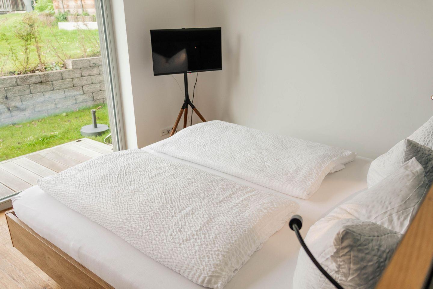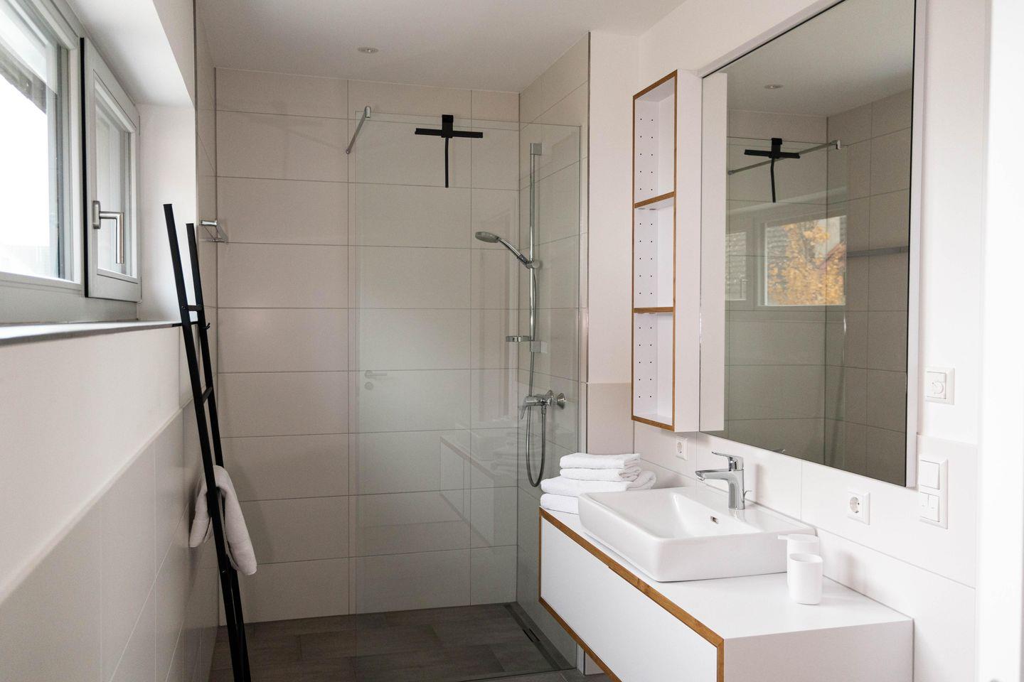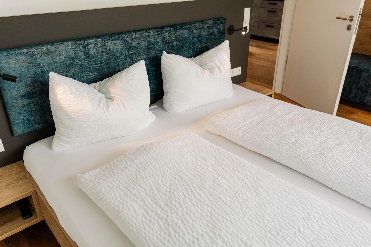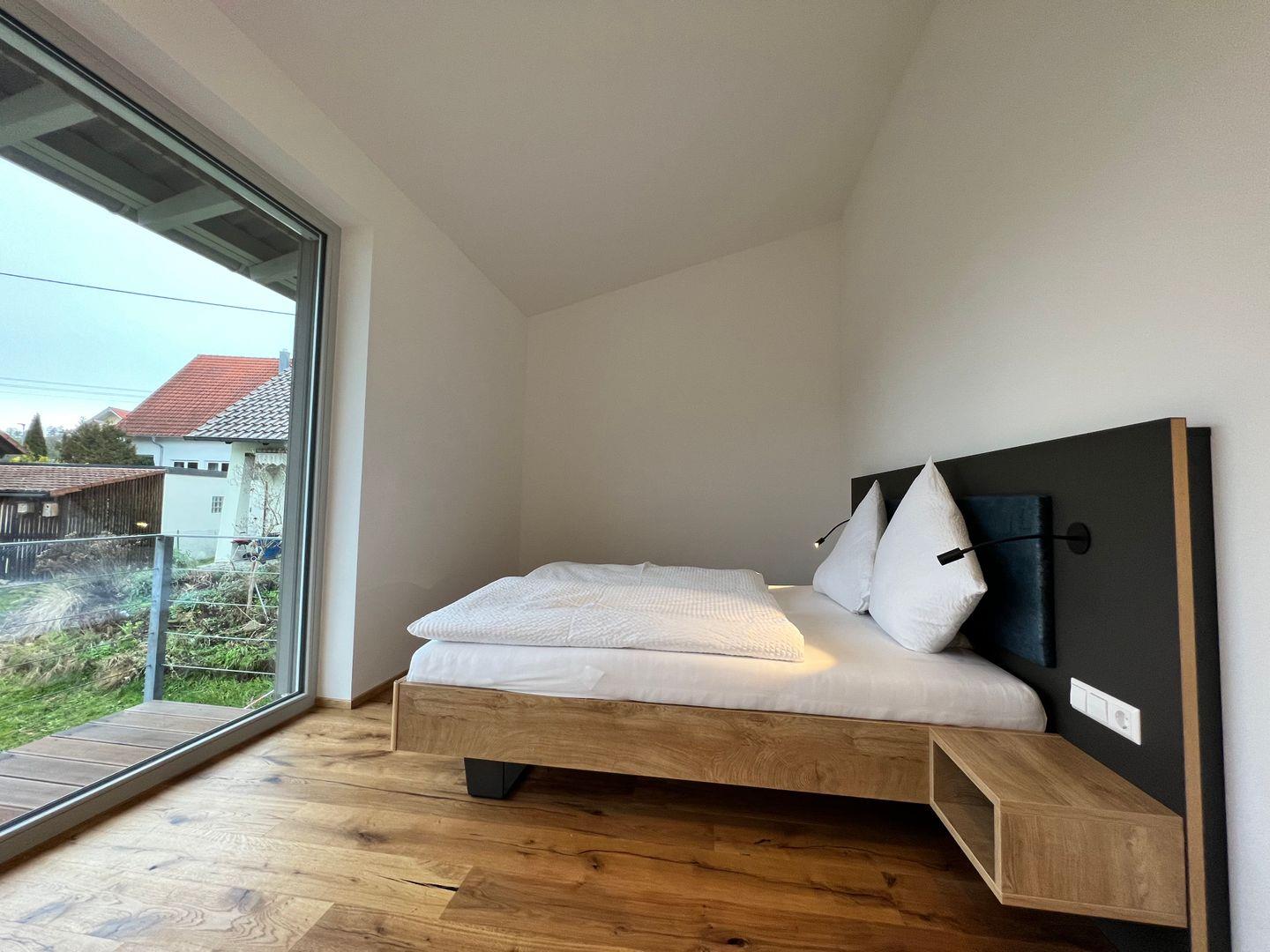 Die Ferienwohnung verfügt über ein Schlafzimmer mit Doppelbett (180X200 cm) und ausreichend Stauraum im maßangefertigten Kleiderschrank. Das Badezimmer beinhaltet eine großzügige, bodenebene Dusche sowie Waschbecken und WC.