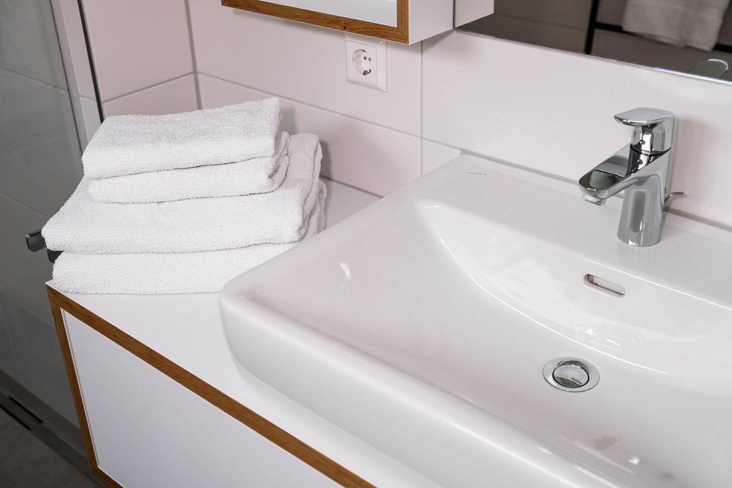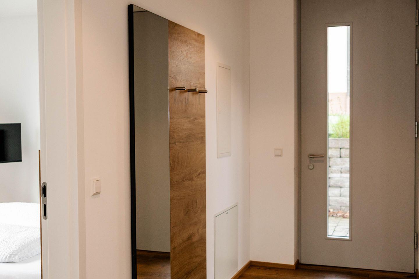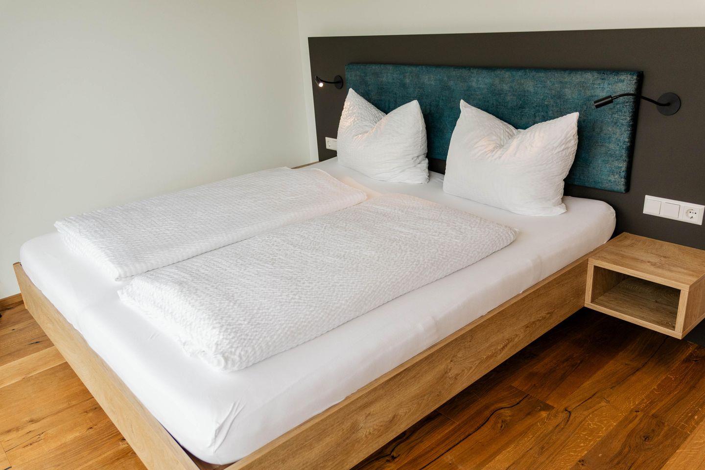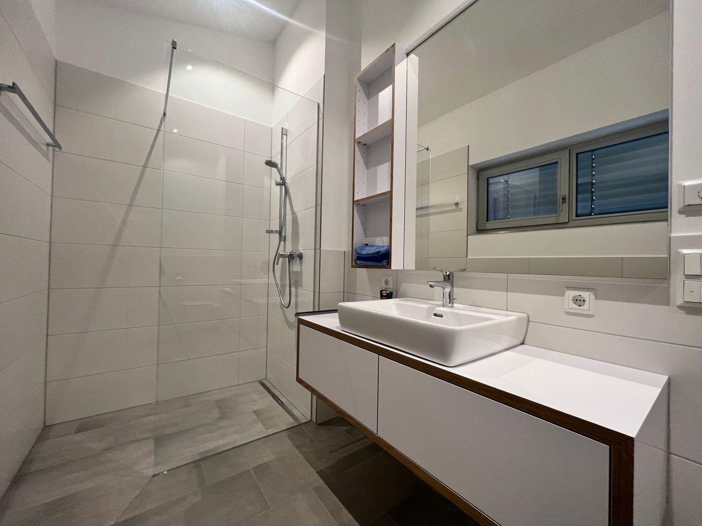 Die Ferienwohnung verfügt über ein Schlafzimmer mit Doppelbett (180X200 cm) und ausreichend Stauraum im maßangefertigten Kleiderschrank. Das Badezimmer beinhaltet eine großzügige, bodenebene Dusche sowie Waschbecken und WC.