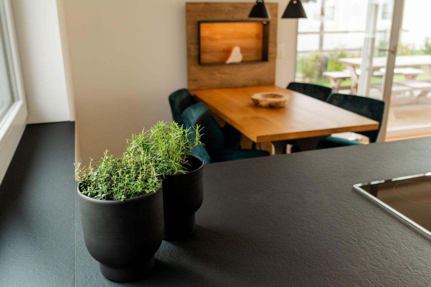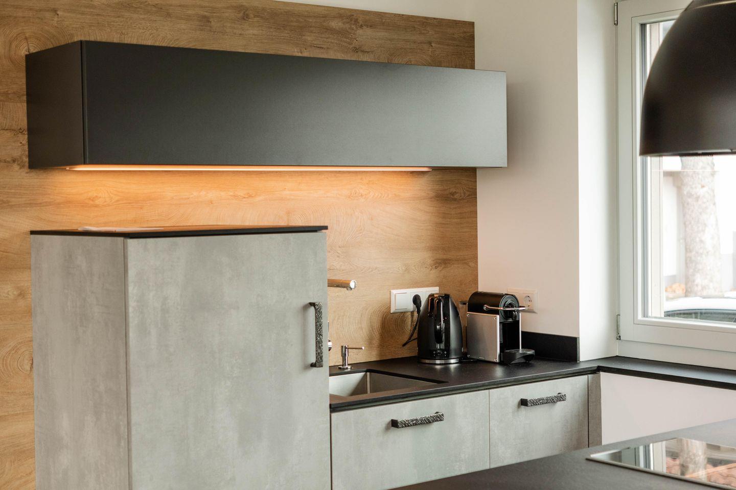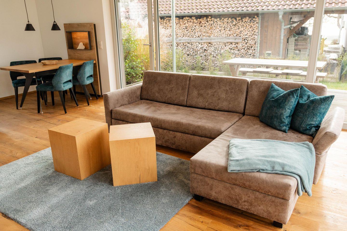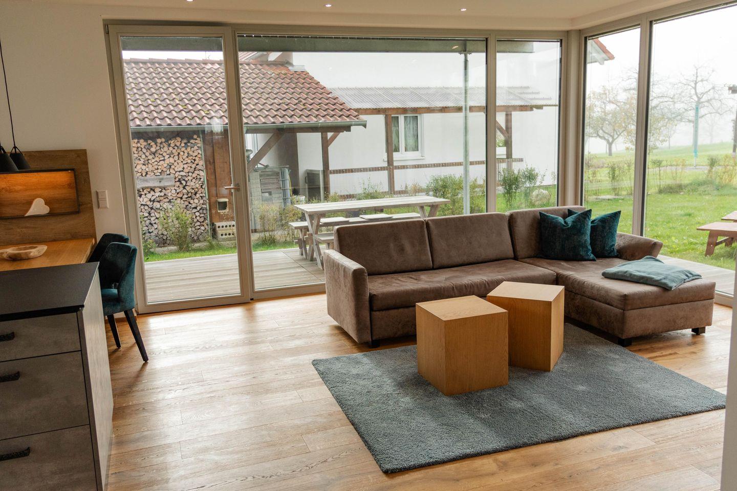 Den Mittelpunkt der Luxusferienwohnung bildet der große Wohnraum mit seinen vielen bodentiefen Fenstern und Ausgang zum Garten. Genießen Sie absoluten Lifestyle-Komfort in einem offenen Wohn- und Esszimmer-Bereich mit integrierter Küche und Kochinsel. Ein weiterer Schlafplatz befindet sich auf dem ausziehbaren Sofa (Liegefläche 160x200 cm) im Wohnzimmer, so dass auch bis zu vier Personen Platz in der Ferienwohnung finden. Die besonders hochwertige Küche bietet eine Vollausstattung an qualitätsvollen Geschirr/Gläsern, Besteck und Töpfen/Pfannen von ausgewählten Markenherstellern.