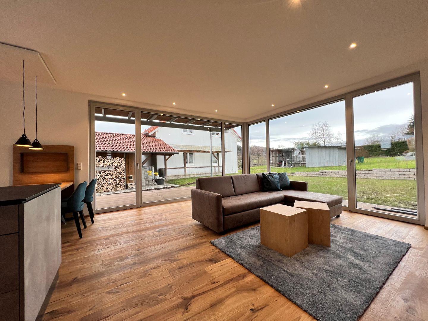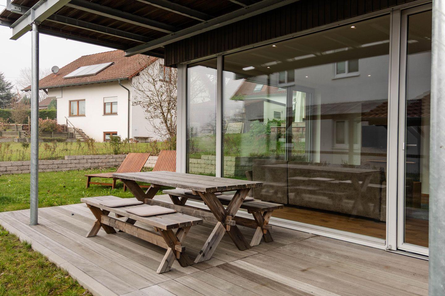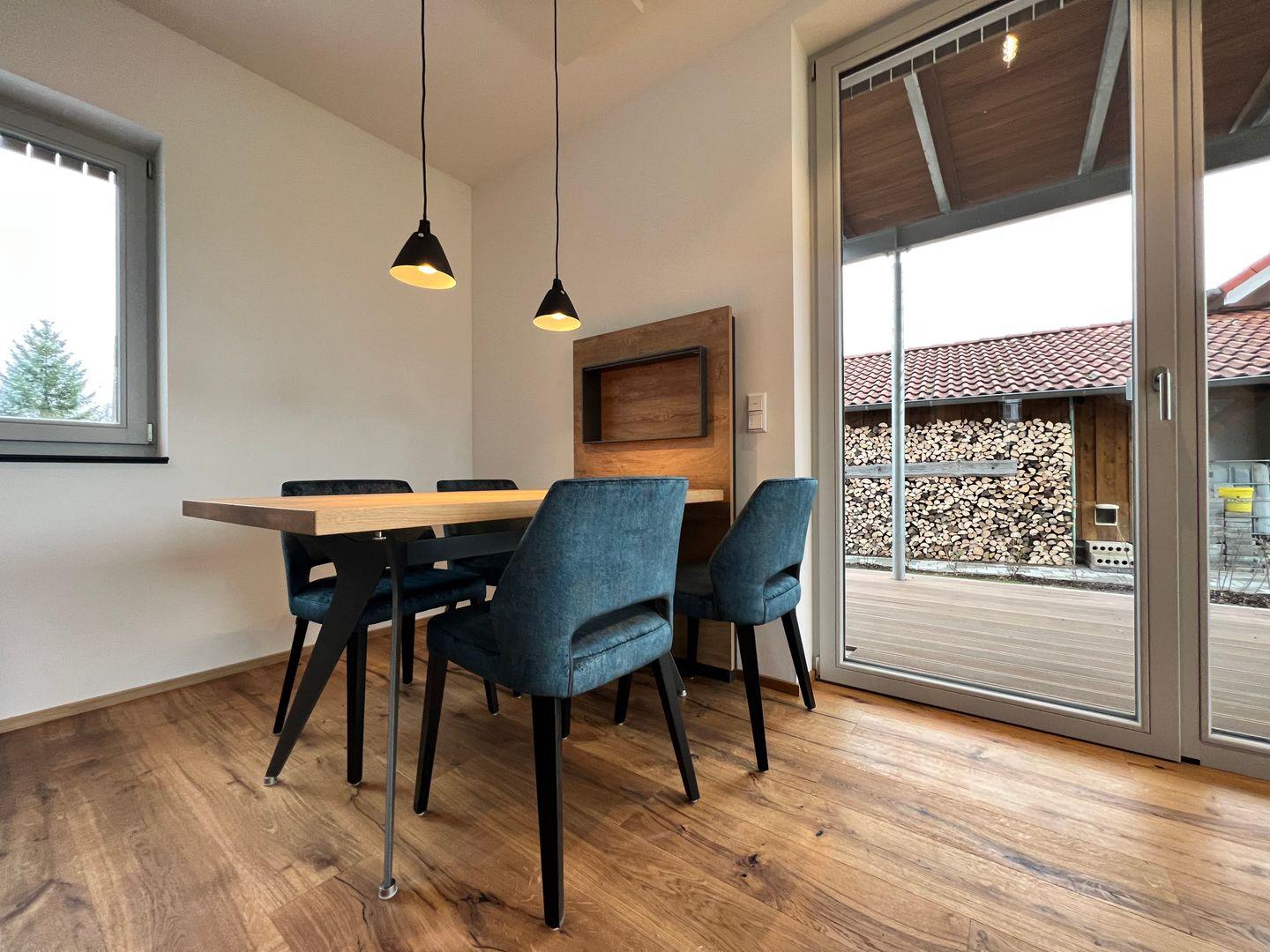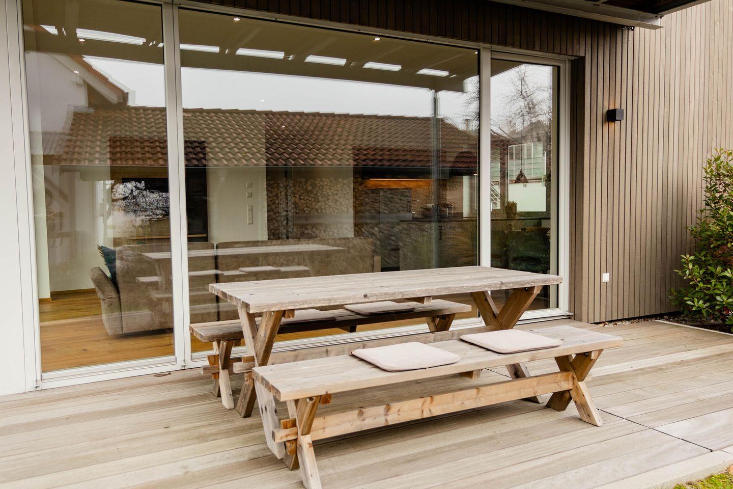 Die Terrasse mit Esstisch für vier Personen bietet Ihnen einen freien Blick Richtung Wald und Wiesen. Die großen Fensterfronten lassen die Ferienwohnung besonders hell wirken und sind mit elektrischen Jalousien ausgestattet. Fußbodenheizung mit separater Steuerung über Raumthermostate.