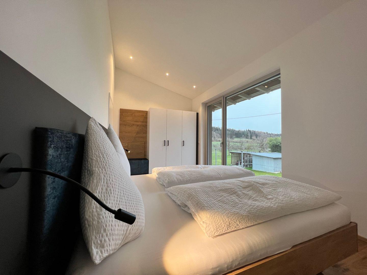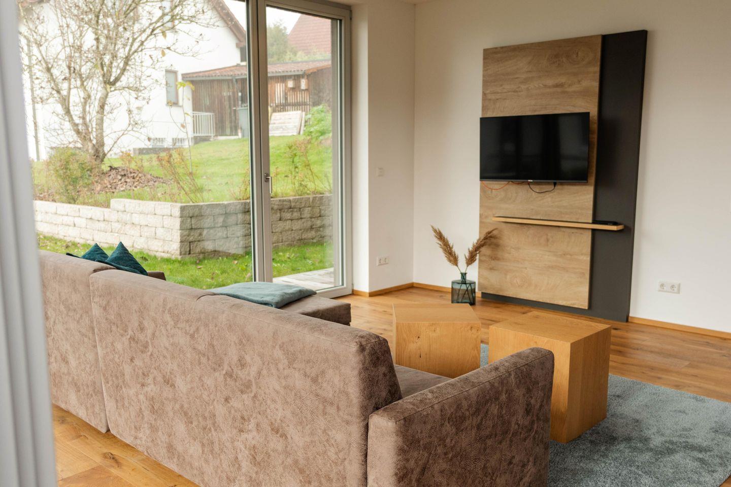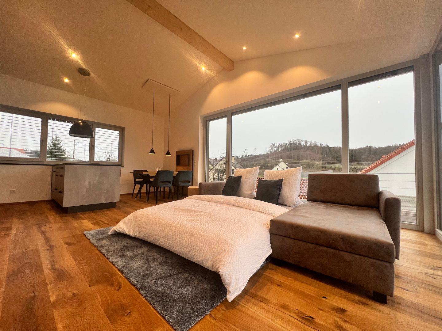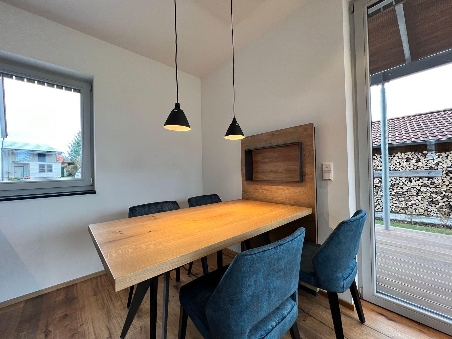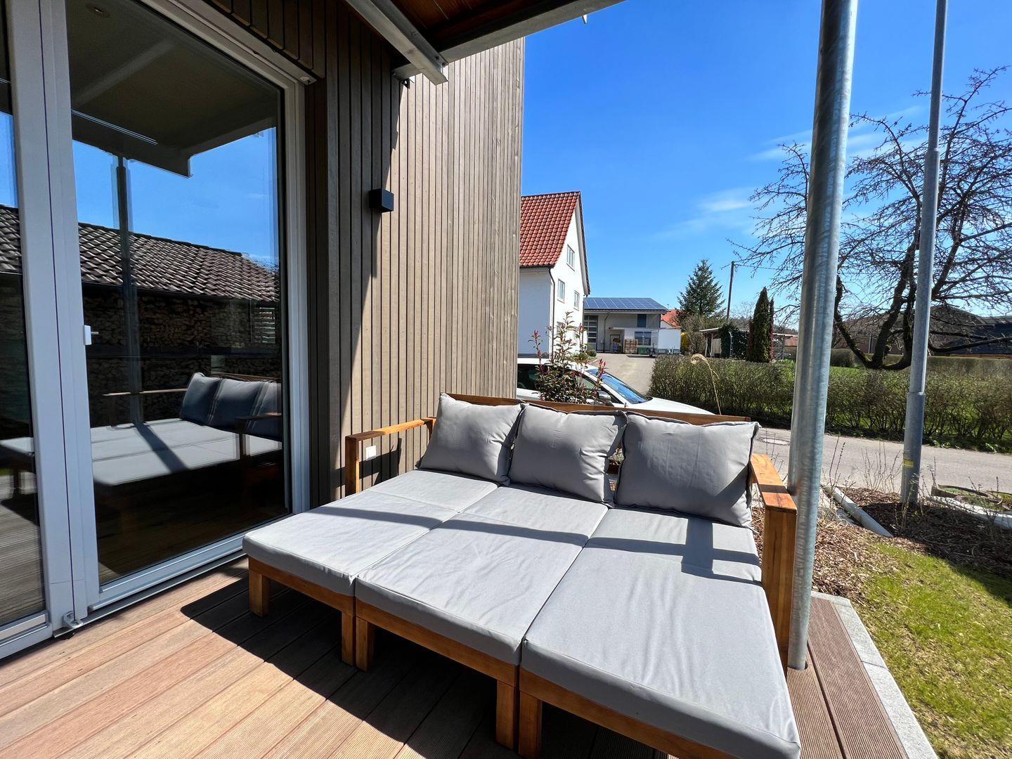 Die Terrasse mit Esstisch für vier Personen bietet Ihnen einen freien Blick Richtung Wald und Wiesen. Die großen Fensterfronten lassen die Ferienwohnung besonders hell wirken und sind mit elektrischen Jalousien ausgestattet. Fußbodenheizung mit separater Steuerung über Raumthermostate.
