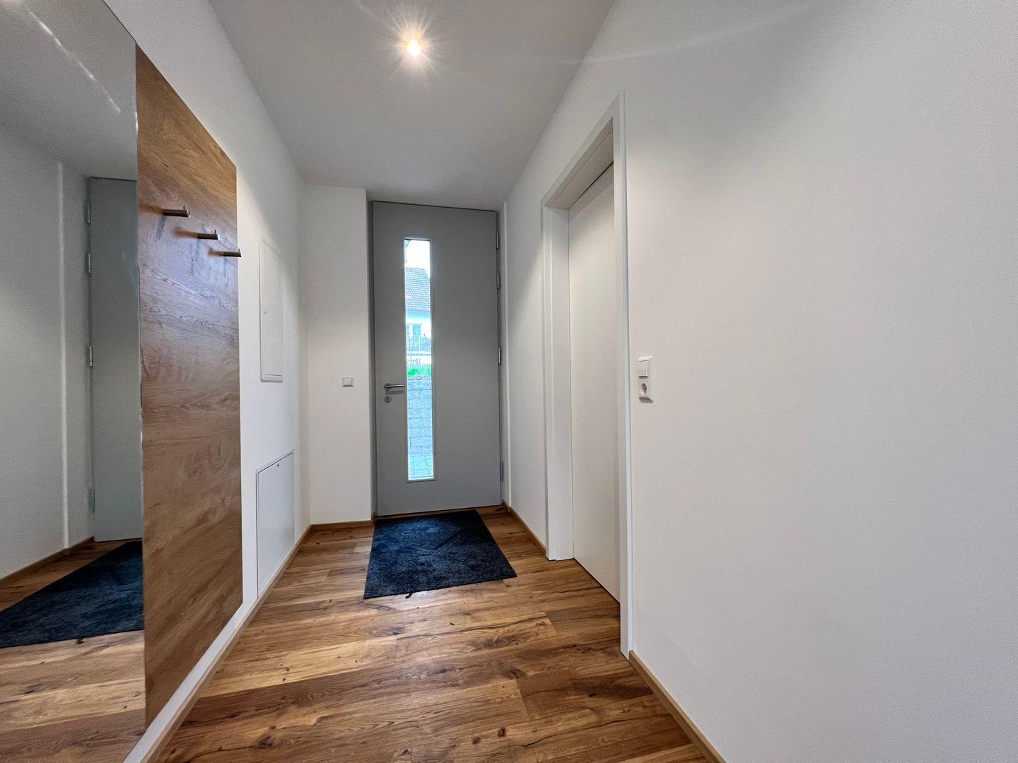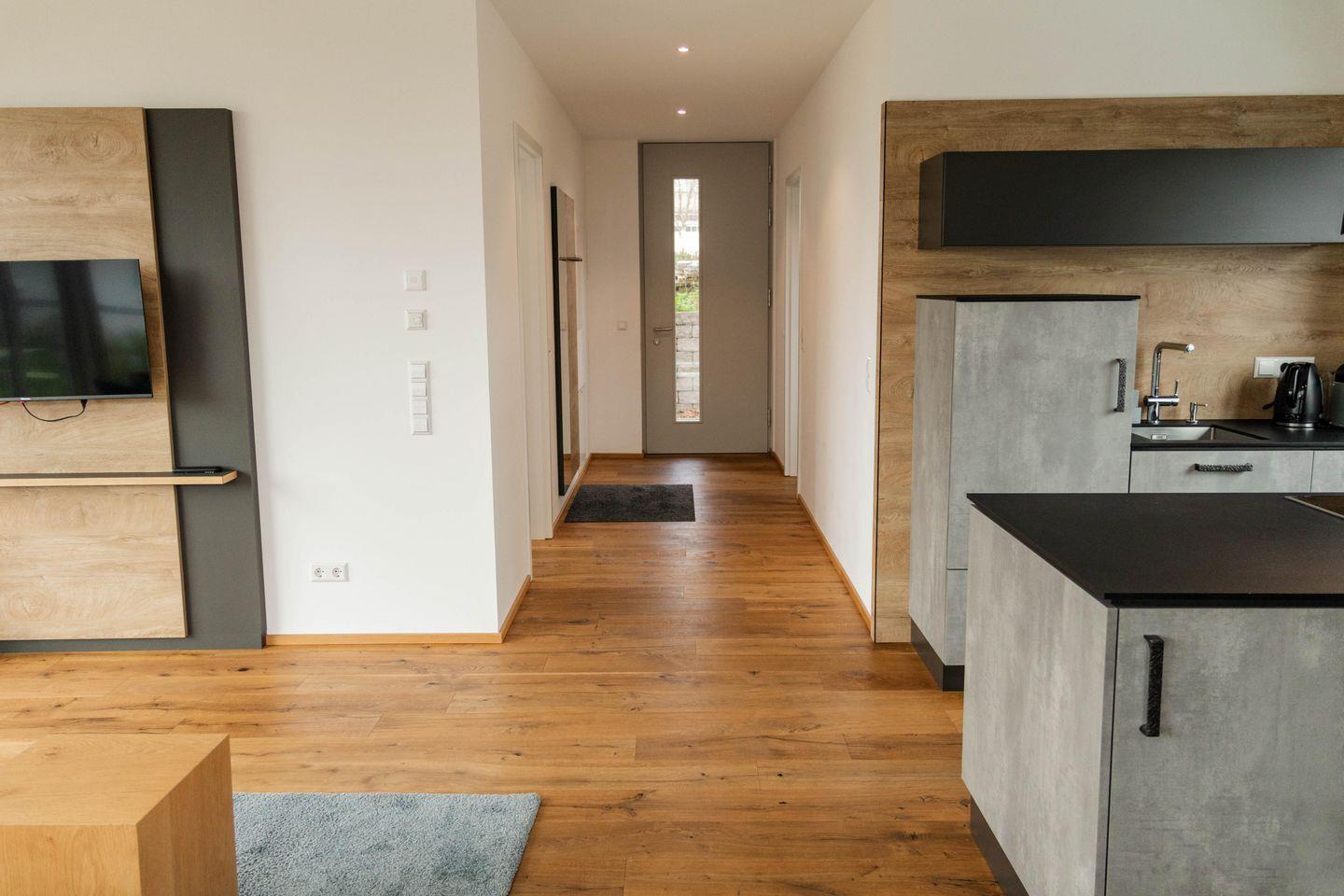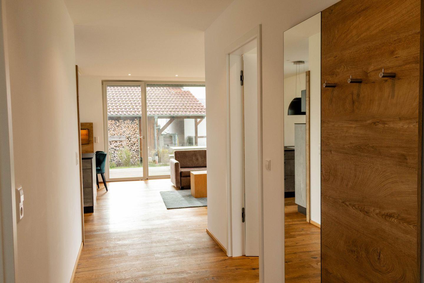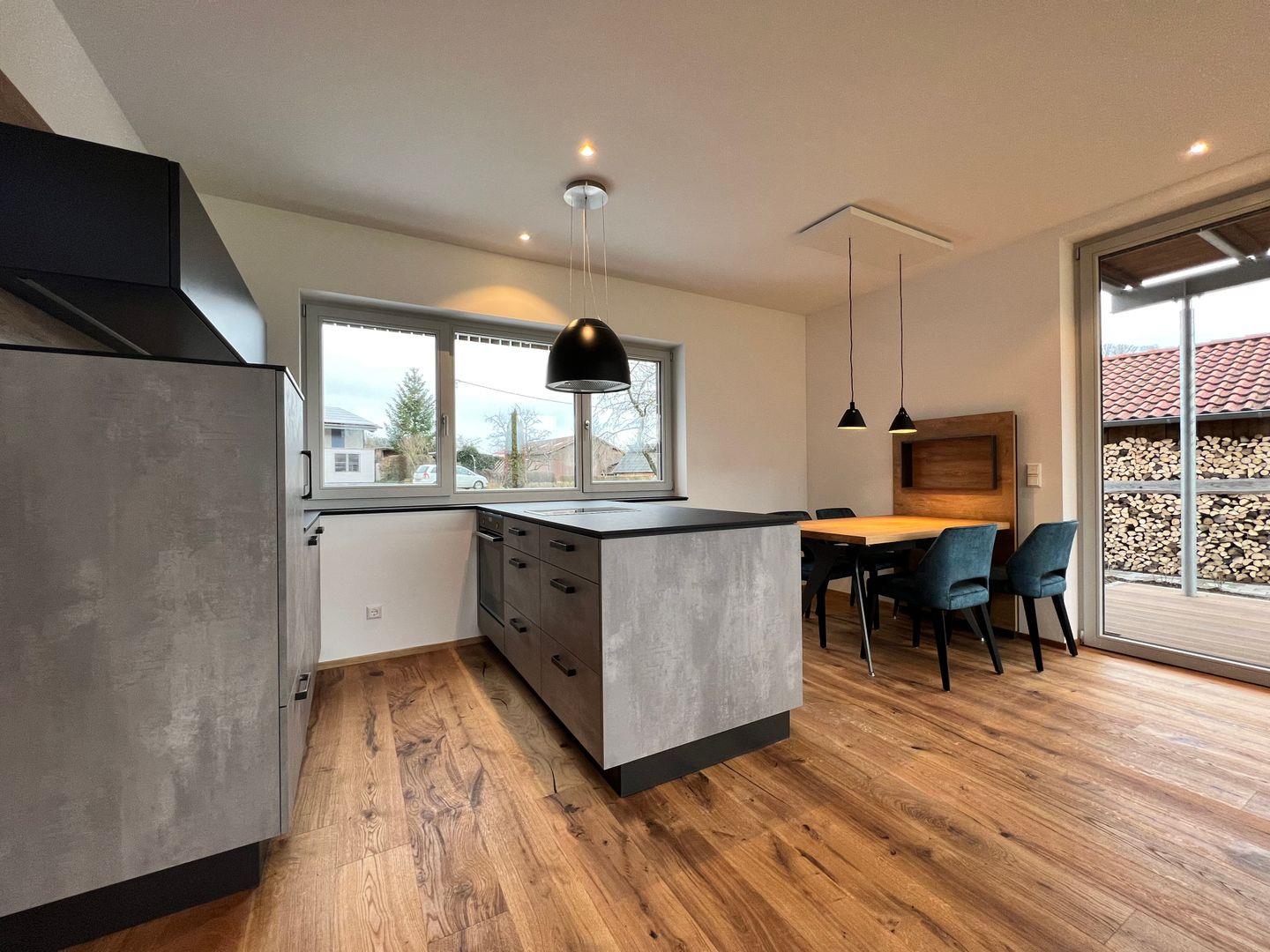 Die Terrasse mit Esstisch für vier Personen bietet Ihnen einen freien Blick Richtung Wald und Wiesen. Die großen Fensterfronten lassen die Ferienwohnung besonders hell wirken und sind mit elektrischen Jalousien ausgestattet. Fußbodenheizung mit separater Steuerung über Raumthermostate.