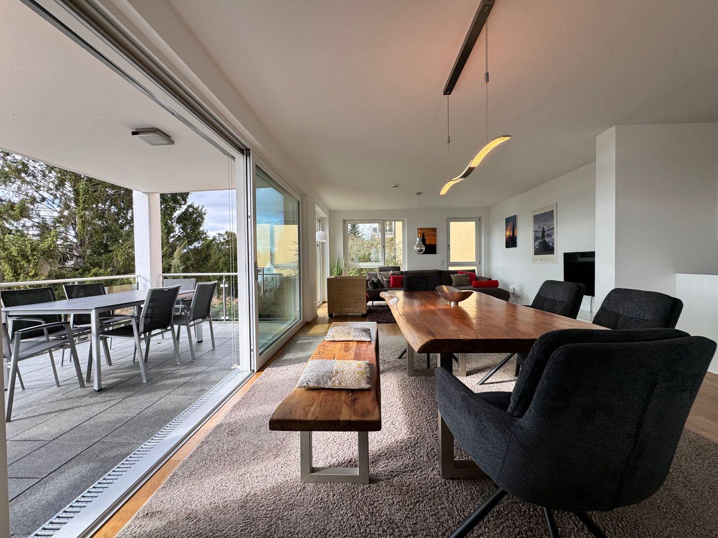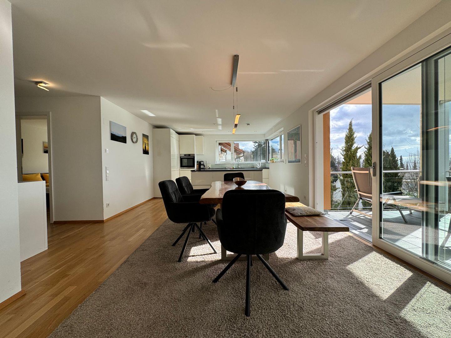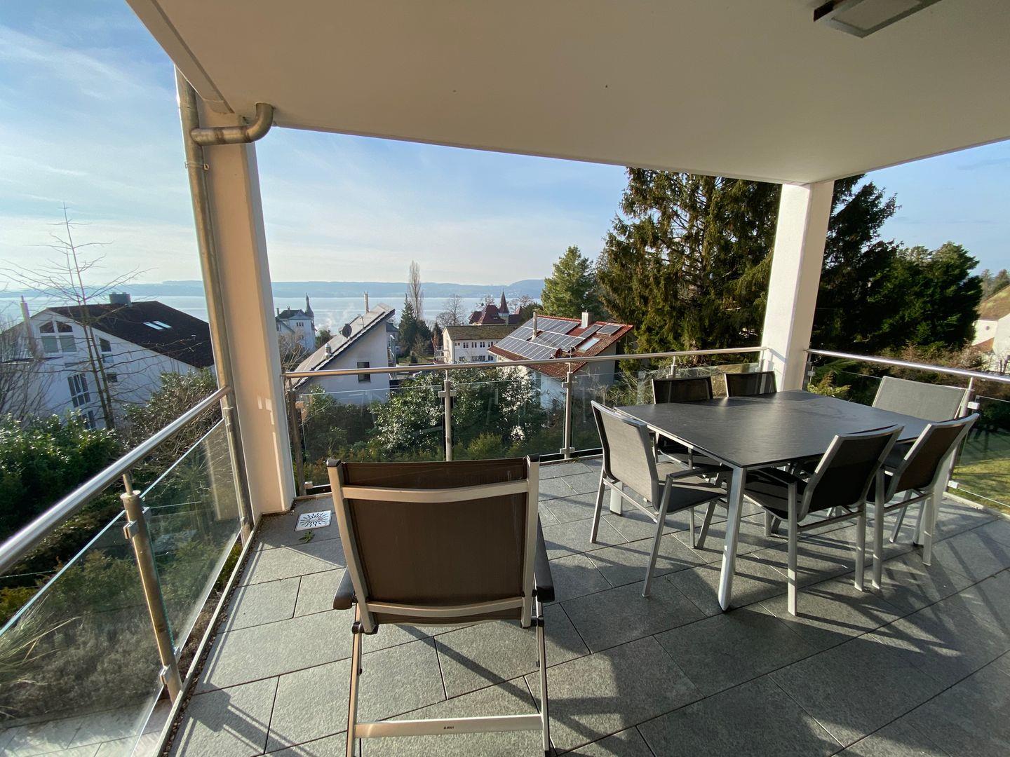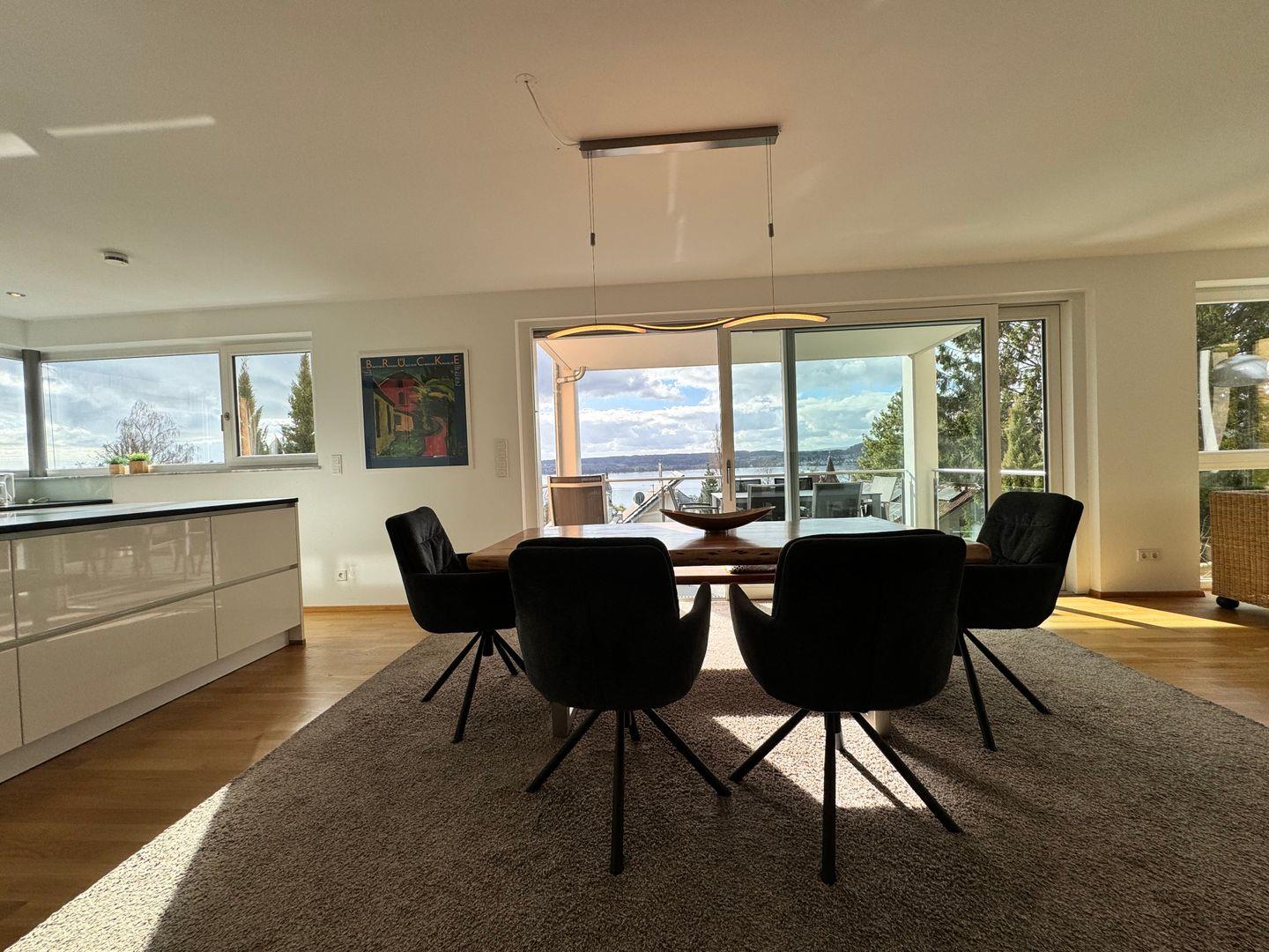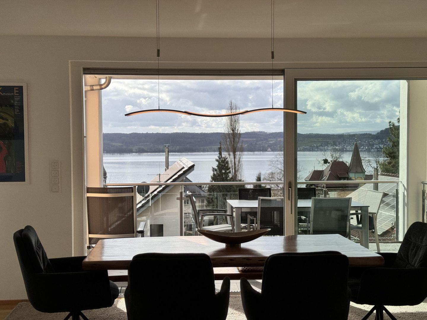 Hochwertige Möbel, moderne Elemente und natürliche Materialien schaffen eine harmonische Wohnatmosphäre. Die Sonnenterrasse ist mit modernen Loungemöbeln ausgestattet und bietet einen exklusiven Ort zum Genießen des Seeblicks. Die Fußbodenheizung in allen Räumen schafft eine behagliche Atmosphäre. Elektrische Rollläden und Sonnenschutz sorgen für eine individuelle Lichtregulierung und Privatsphäre.