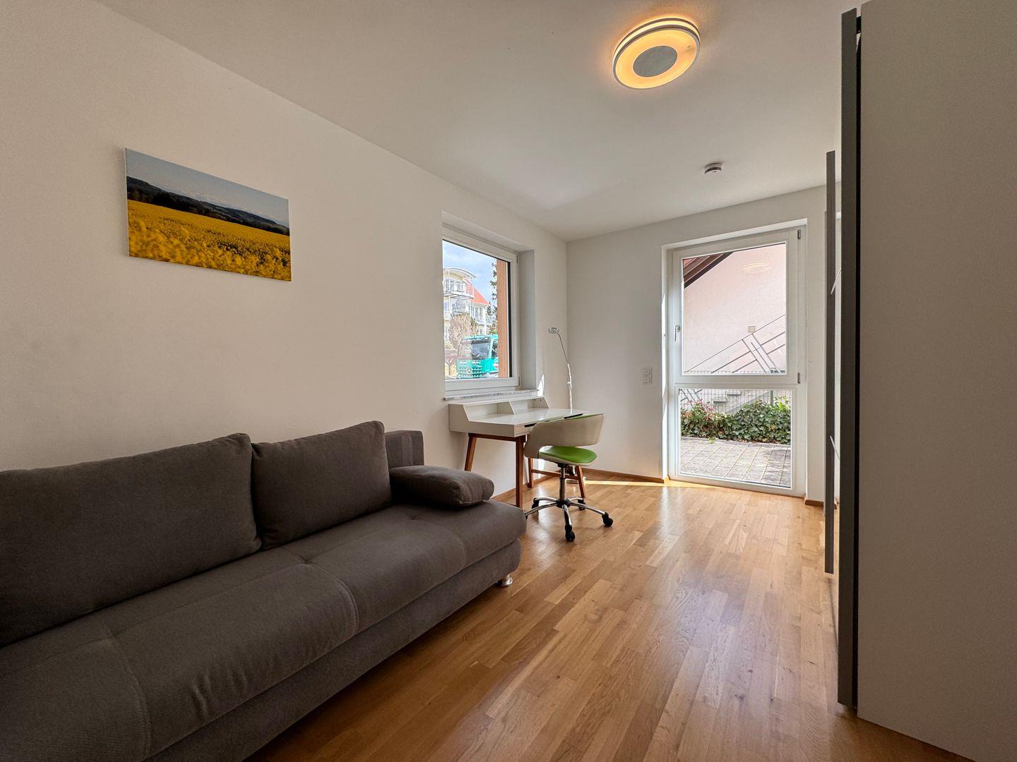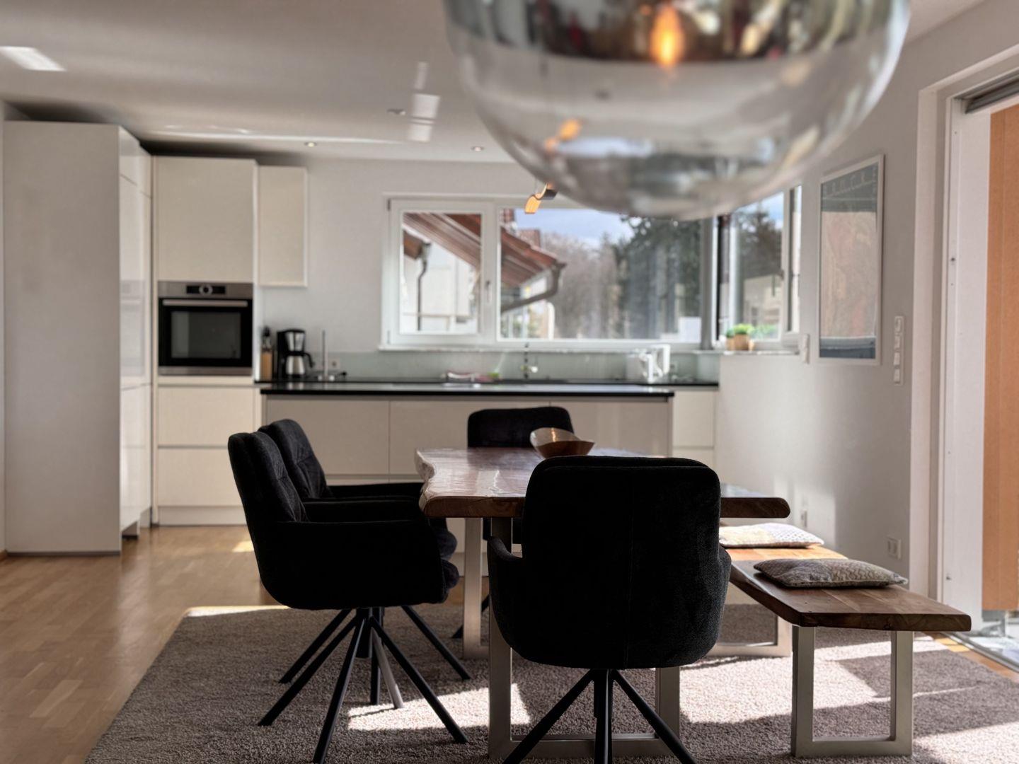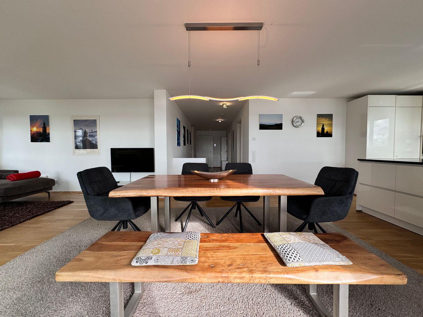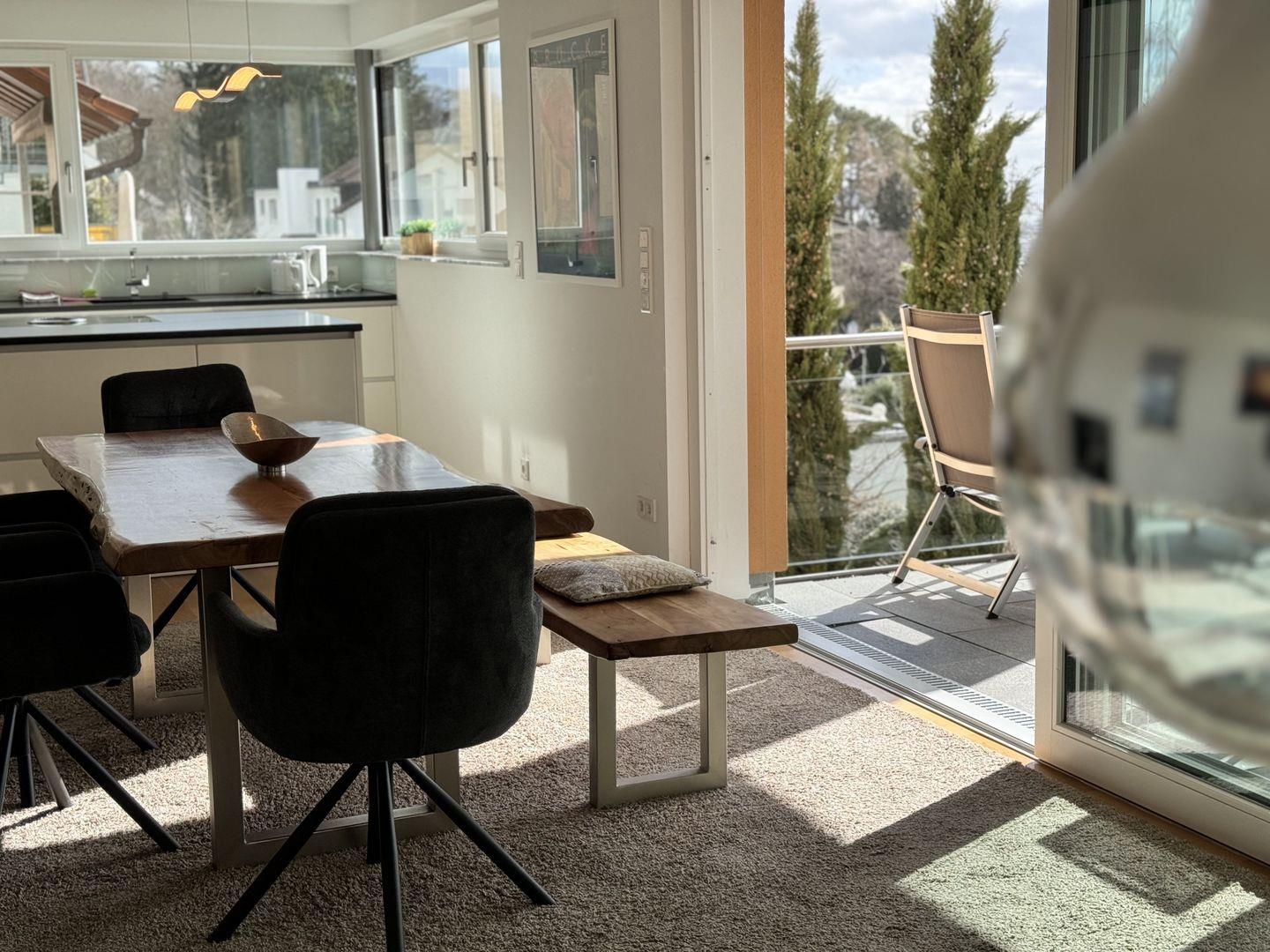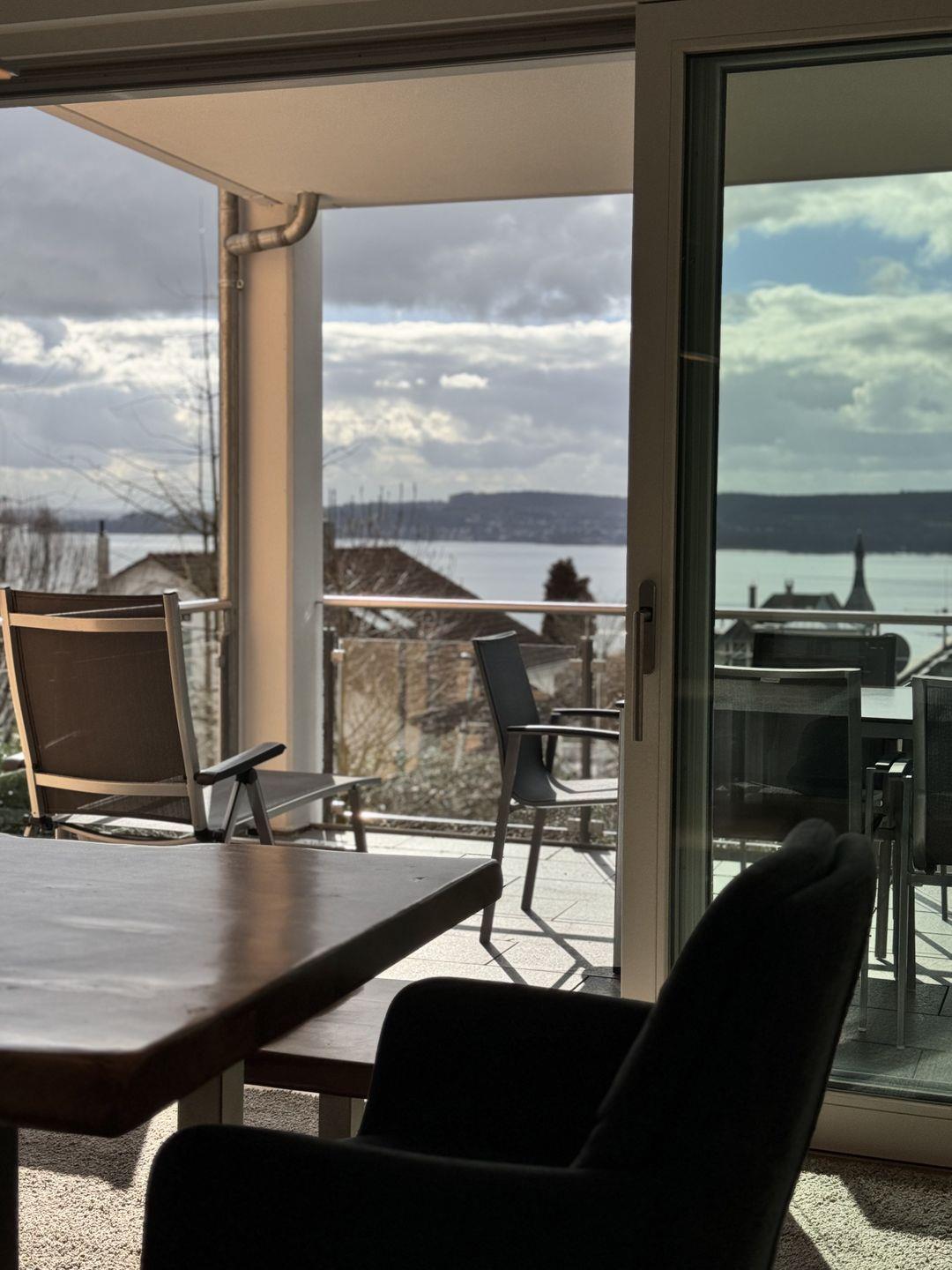 Hochwertige Möbel, moderne Elemente und natürliche Materialien schaffen eine harmonische Wohnatmosphäre. Die Sonnenterrasse ist mit modernen Loungemöbeln ausgestattet und bietet einen exklusiven Ort zum Genießen des Seeblicks. Die Fußbodenheizung in allen Räumen schafft eine behagliche Atmosphäre. Elektrische Rollläden und Sonnenschutz sorgen für eine individuelle Lichtregulierung und Privatsphäre.