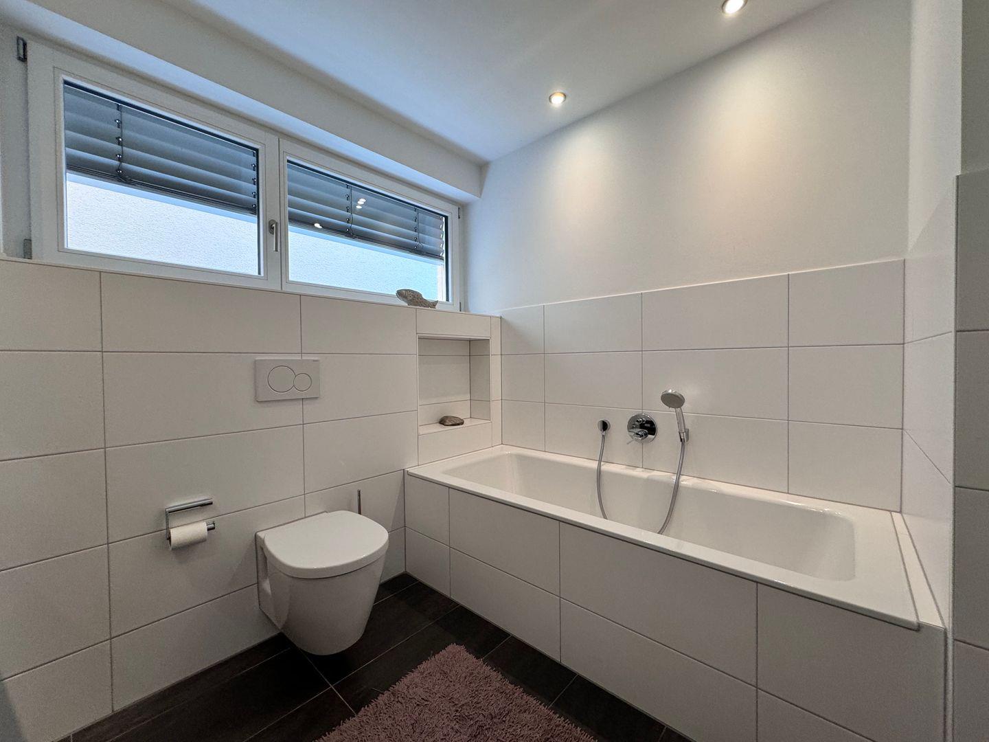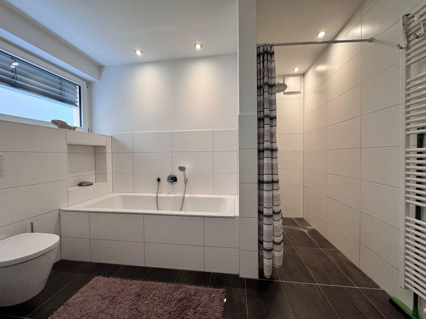 Im modernen Naturstein-Badezimmer finden Sie eine großzügige, bodenebene Regendusche, eine entspannende Badewanne, einen beleuchteten Waschtisch mit Ablagefläche sowie ein WC. Ein zusätzliches, separates Gäste-WC erhöht den Komfort.