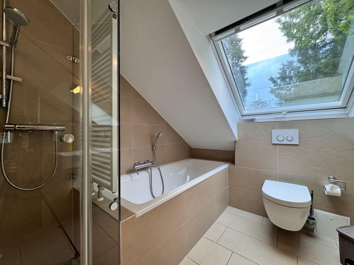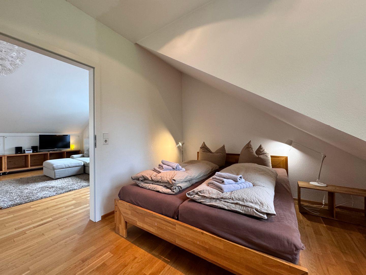Diese großzügige Dachgeschosswohnung bietet auf 70 m² Platz für 2 bis 4 Personen und ein separates Schlafzimmer, einen Wohnbereich mit Schlafsofa, ein Badezimmer und einen Südbalkon.