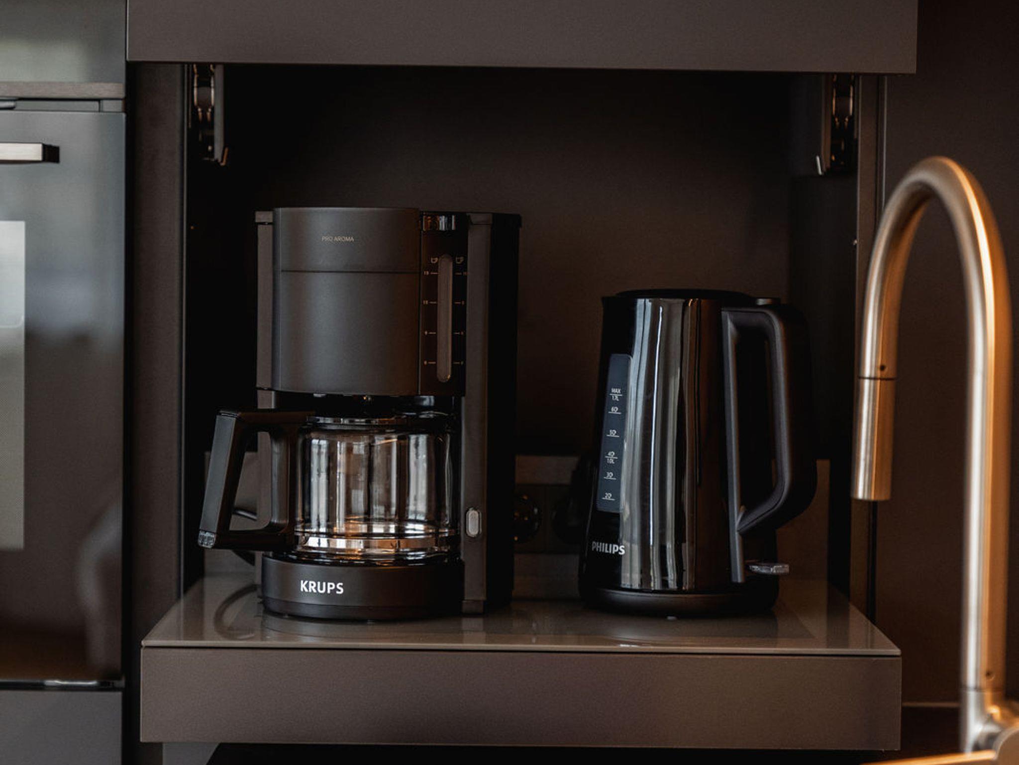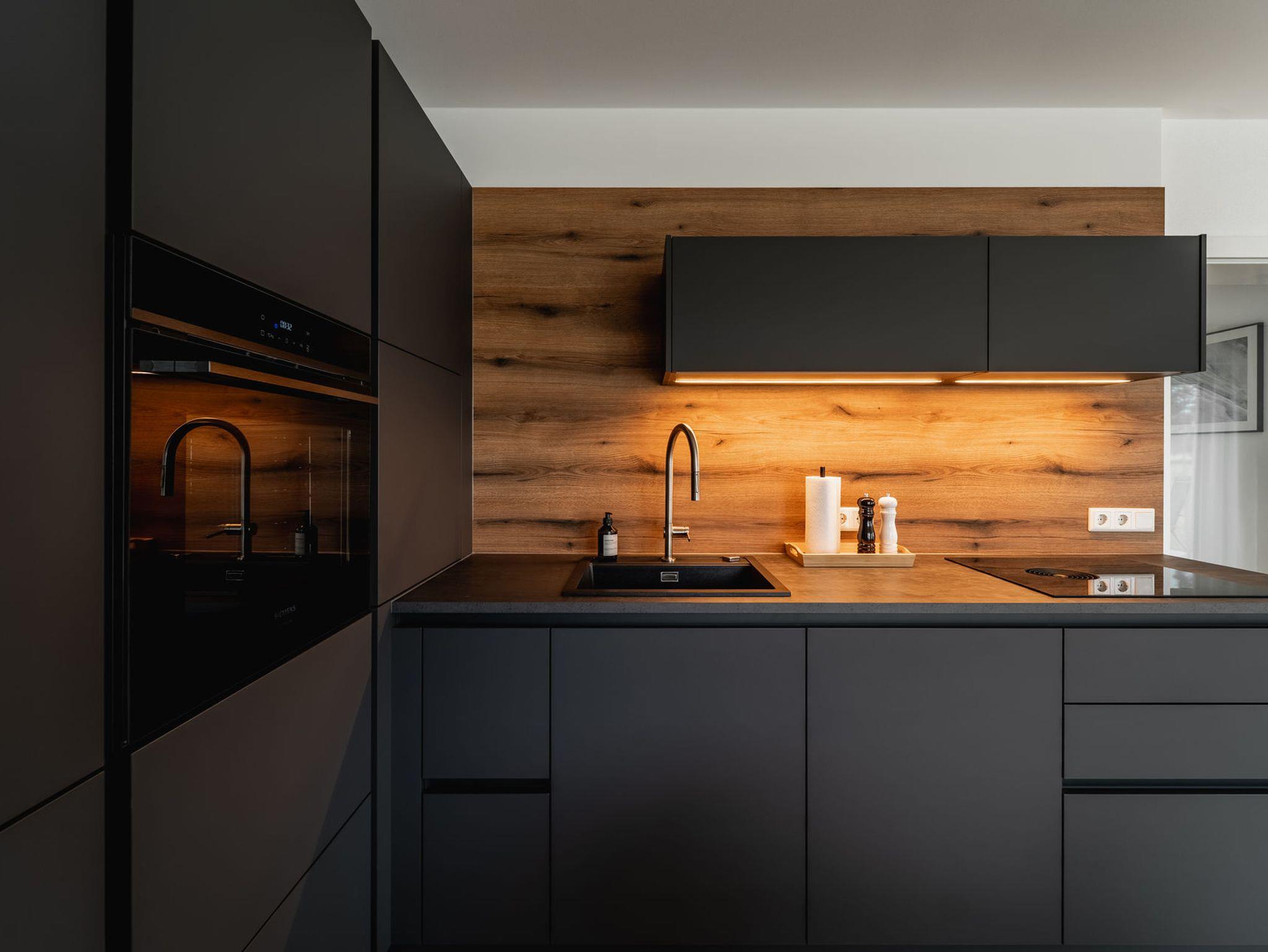 • Voll ausgestattete Design-Küche mit Backofen, Geschirrspüler und Kühlschrank