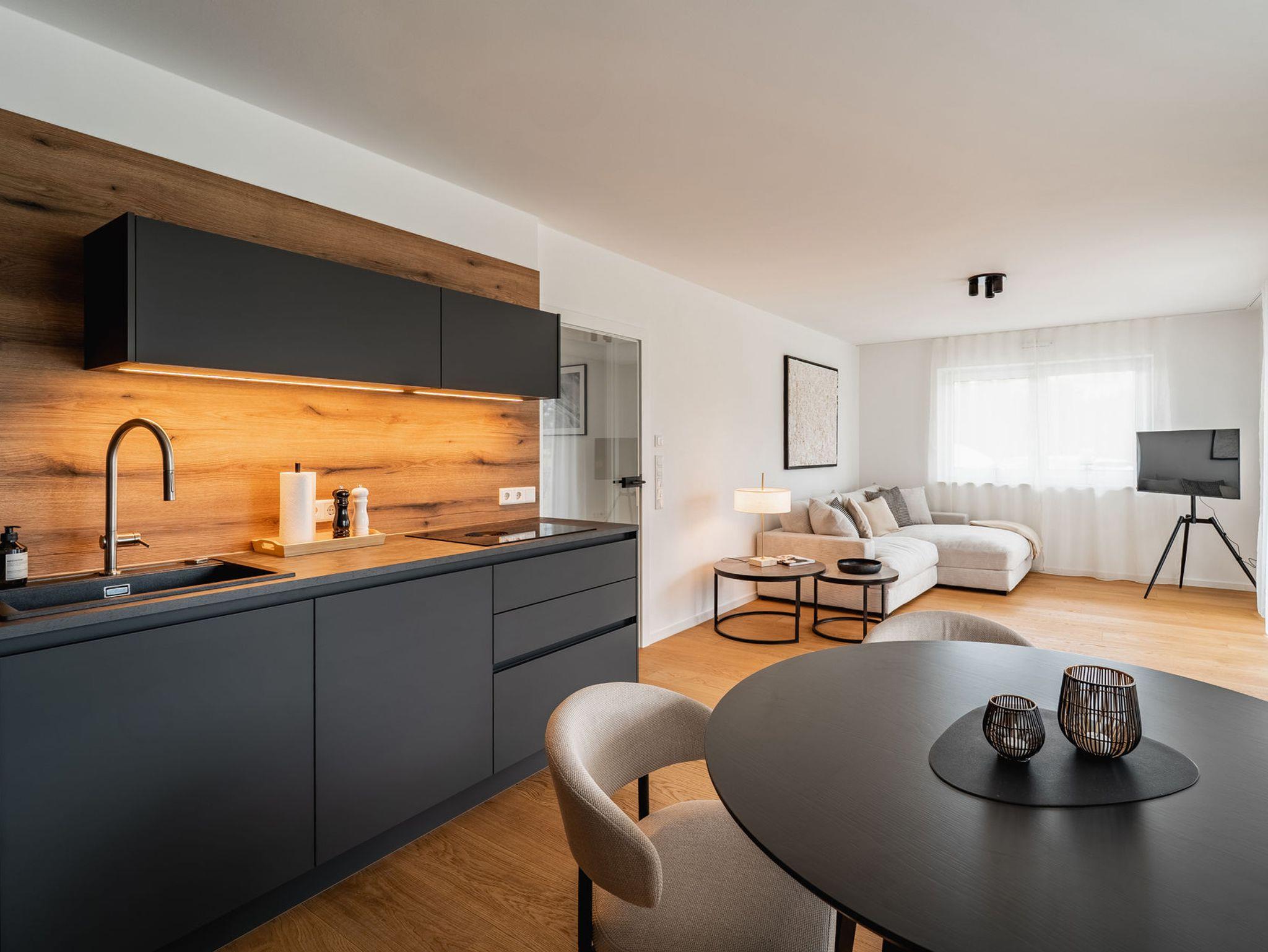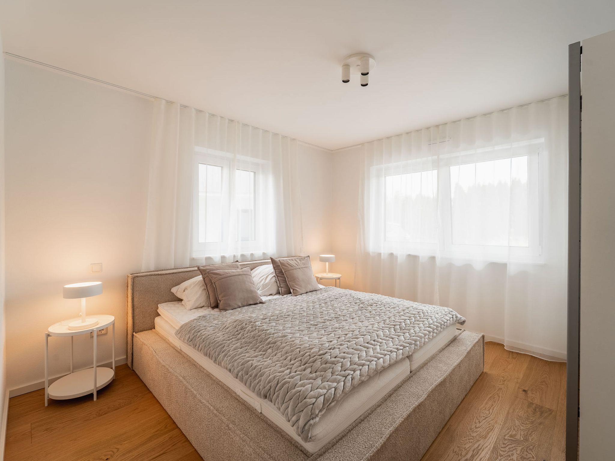 Die zwei getrennten Schlafzimmer mit bequemen Doppelbetten sorgen für erholsame Nächte, während der offene Wohn- und Essbereich mit großzügiger Küche zum Verweilen einlädt. Vom hellen Essplatz aus blickst du ins Grüne bis zu den Bergen.